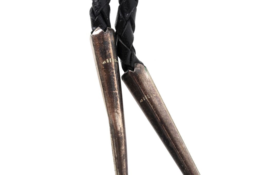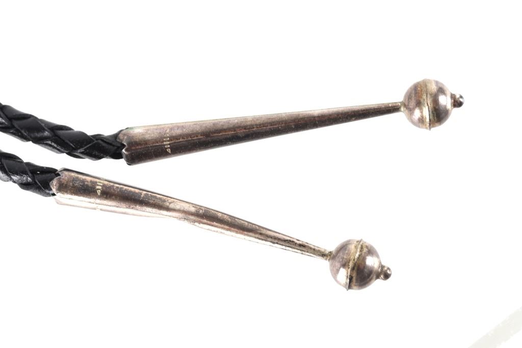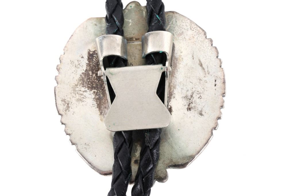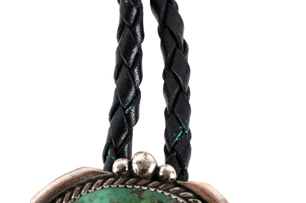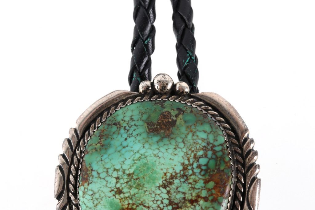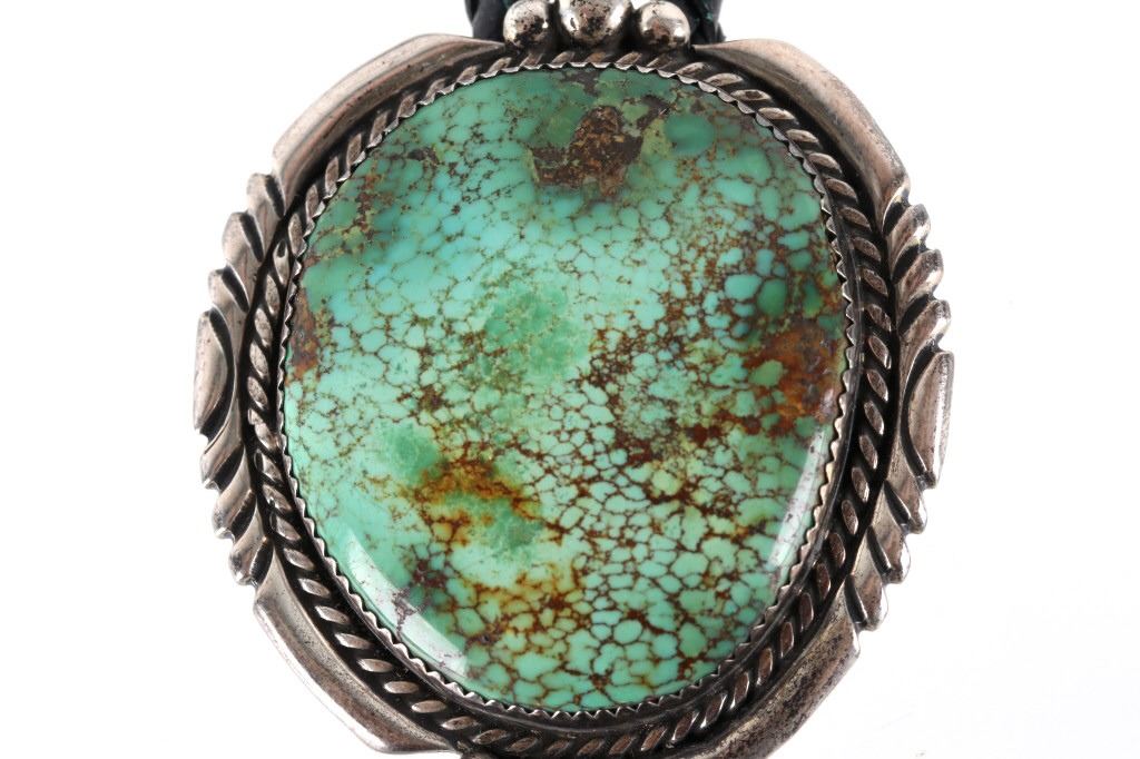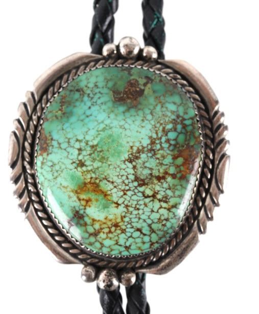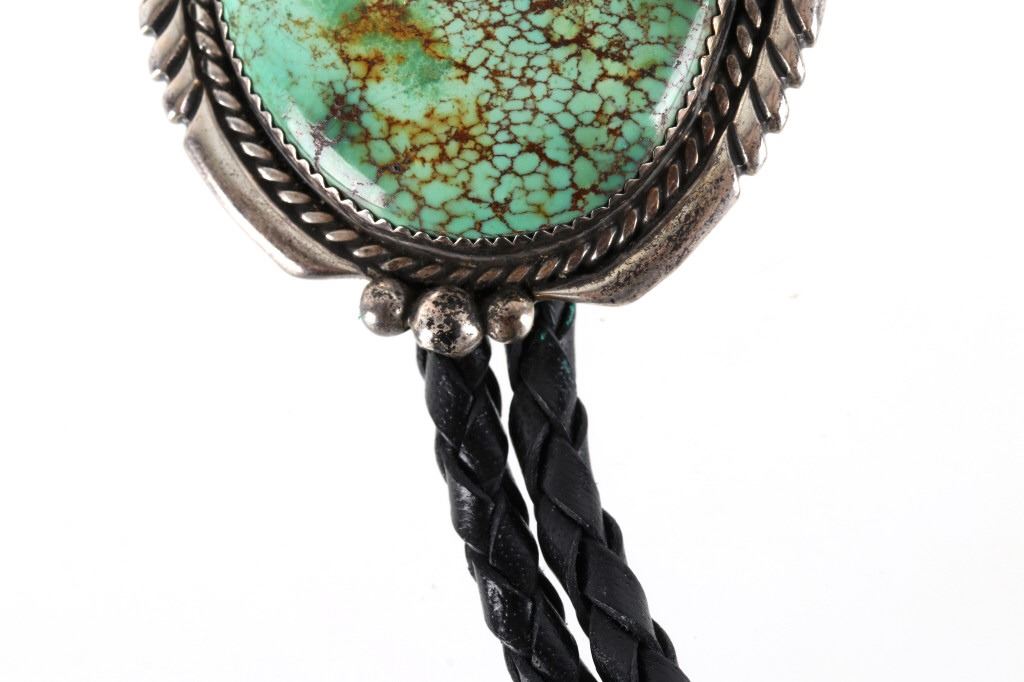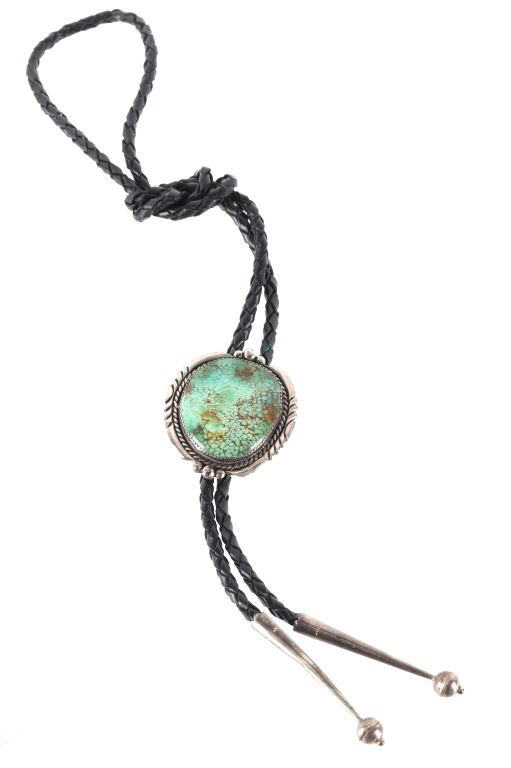 Featured in this lot is this Navajo sterling silver and Royston turquoise bolo. The wonderfully and professionally crafted bolo features four braided leathers with sterling silver pendant and aglets. The center stone is a beautiful and large round Royston turquoise cabochon with a beautiful blend of coloration and extensive brown matrix spiderwebbing. The condition of this bolo is good, with no obvious signs of damage. The measurements of this bolo from aglet to the tip of braided leather is 18 1/2" and the bolo pendant measures 1 7/8" x 1 3/4" x 1/2". The collective weight of the bolo is 41.8 g.