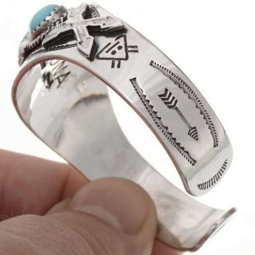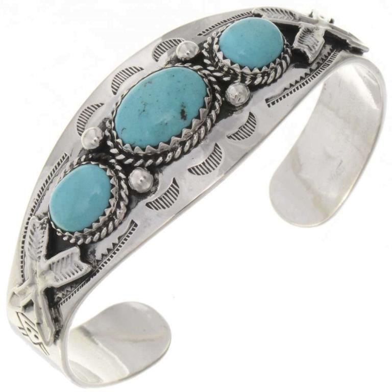 This Three Stone Turquoise Cuff features Navajo, hand cut & polished cabs of natural, Sonoran Turquoise. These beauties display excellent color with nice matrix & each is wrapped in twist wire & mounted on a Sterling cuff with crossed arrows, the tribal sign of peace. About 1" wide at the center, it tapers to the back. Sized for average lady's wrist. Stamped with a hallmark along with Sterling & Arizona.