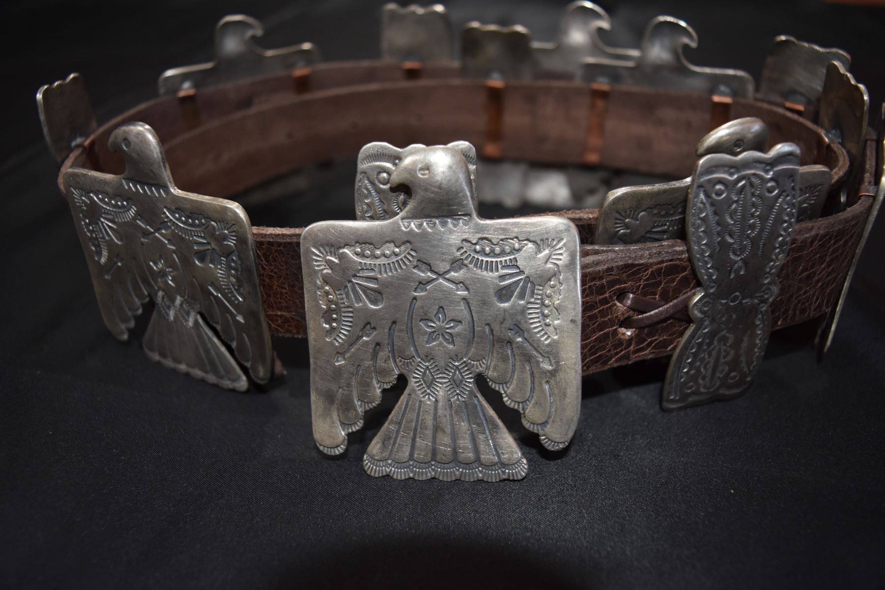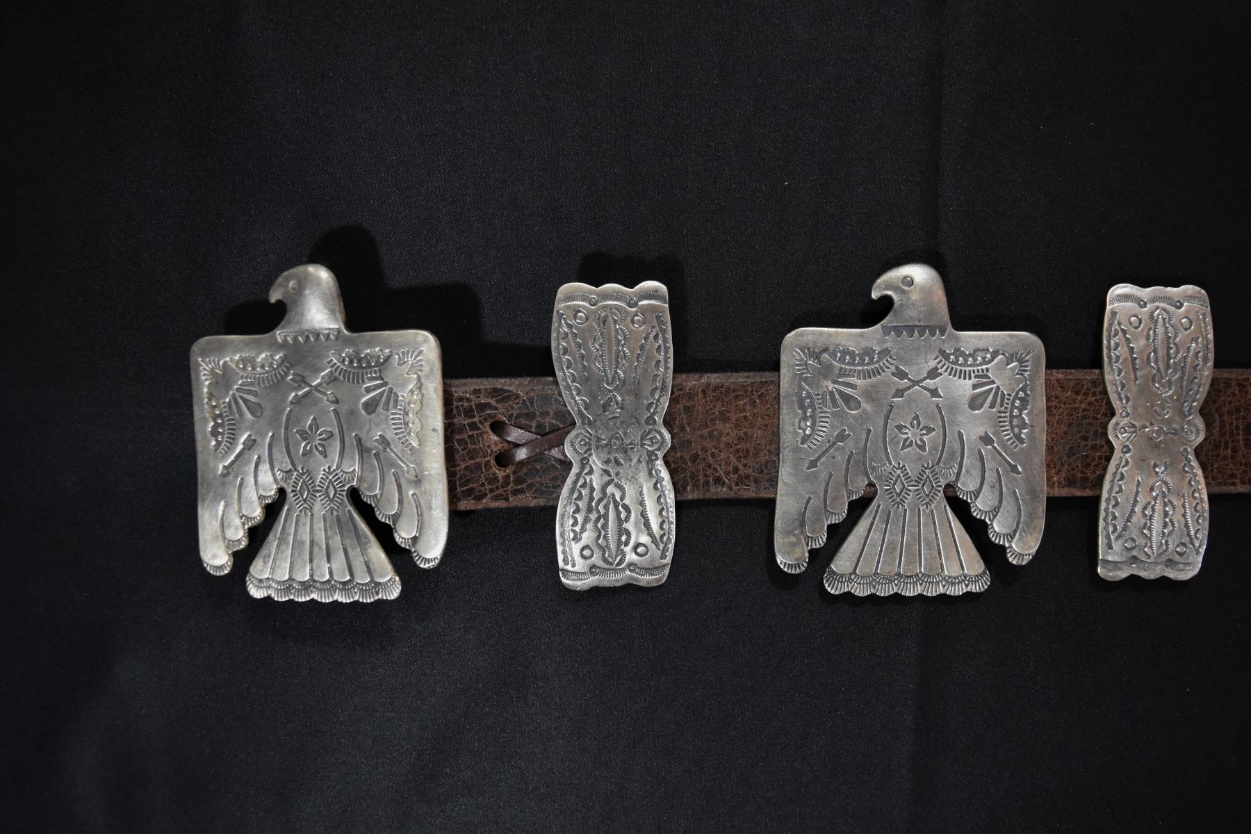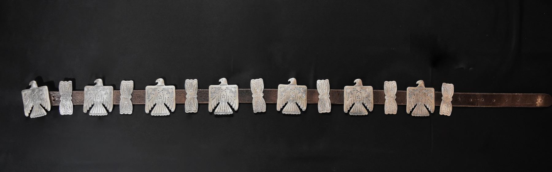 Conchos tested as sterling silver. 48 1/2" Length, Eagle buckle & Conchos: 2 1/2 x3 1/4", Butterfly Conchos: 1 1/8 x 3", 700 grams