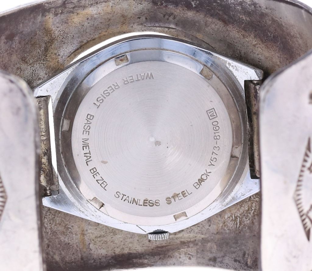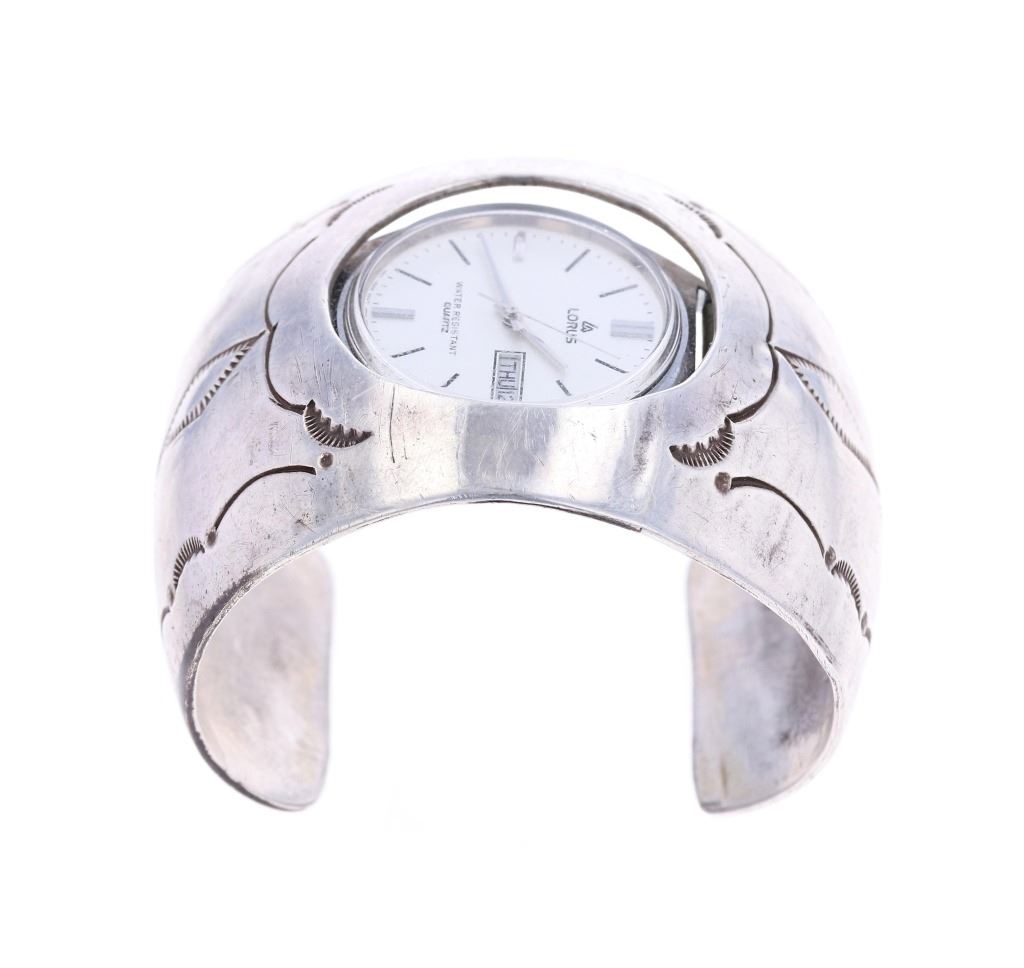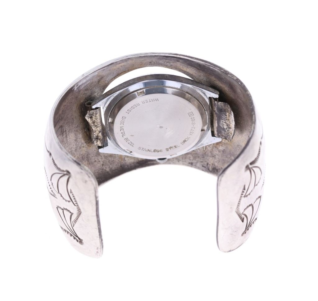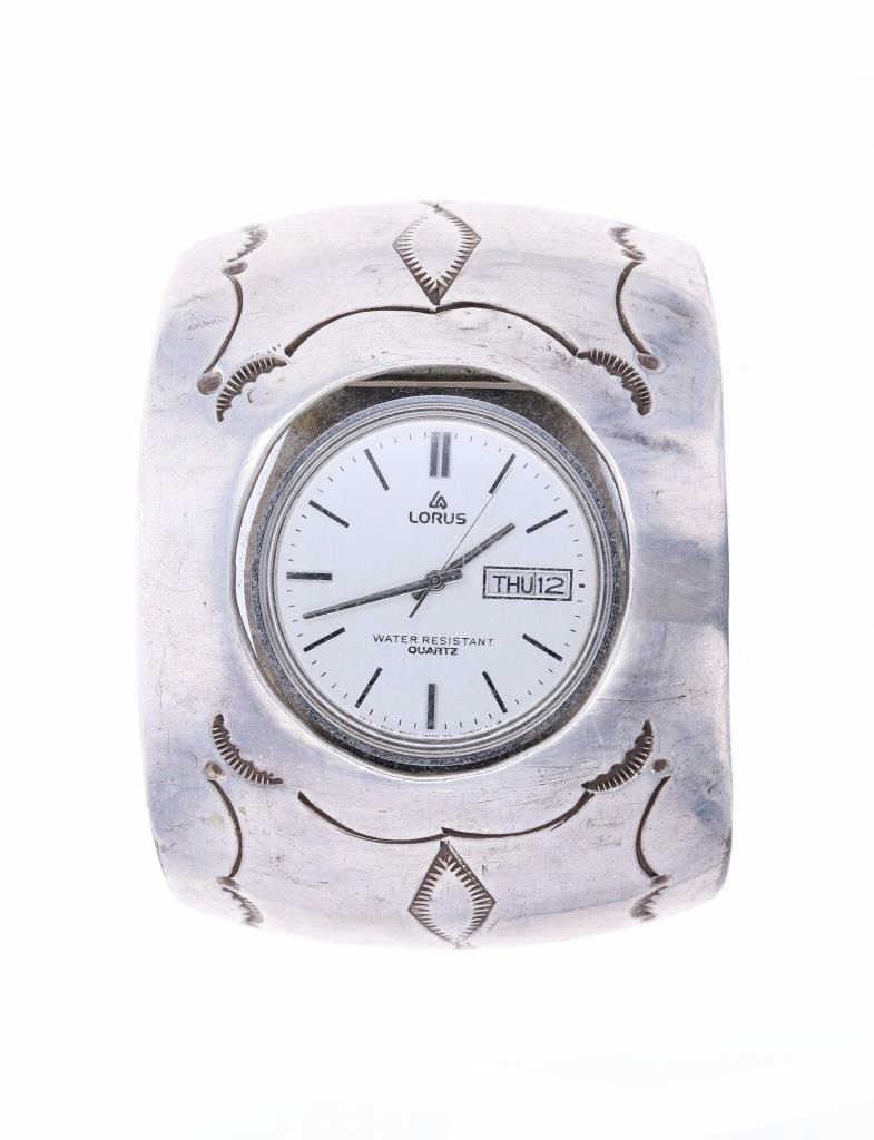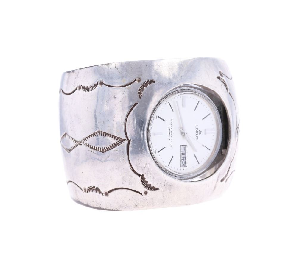 Featured in this lot is this Navajo sterling silver tooled watchband circa 1970's. The watchband features a wonderfully and professionally crafted sterling silver construction that shows a wide frame with tooled and stamped decoration with geometric patterns, and the watch shown set into the watchband is a Lorus circa 1980's and is water resistant. The condition of this Navajo watchband is good with some patina to the silver but otherwise shows a good overall condition. The overall measurements of this watchband is 2" x 2 5/8" x 2 1/4" and the inside measurements of this watchband is 5 1/2" and the gap measures 1 1/12". The collective weight of this watchband is 118.3g.