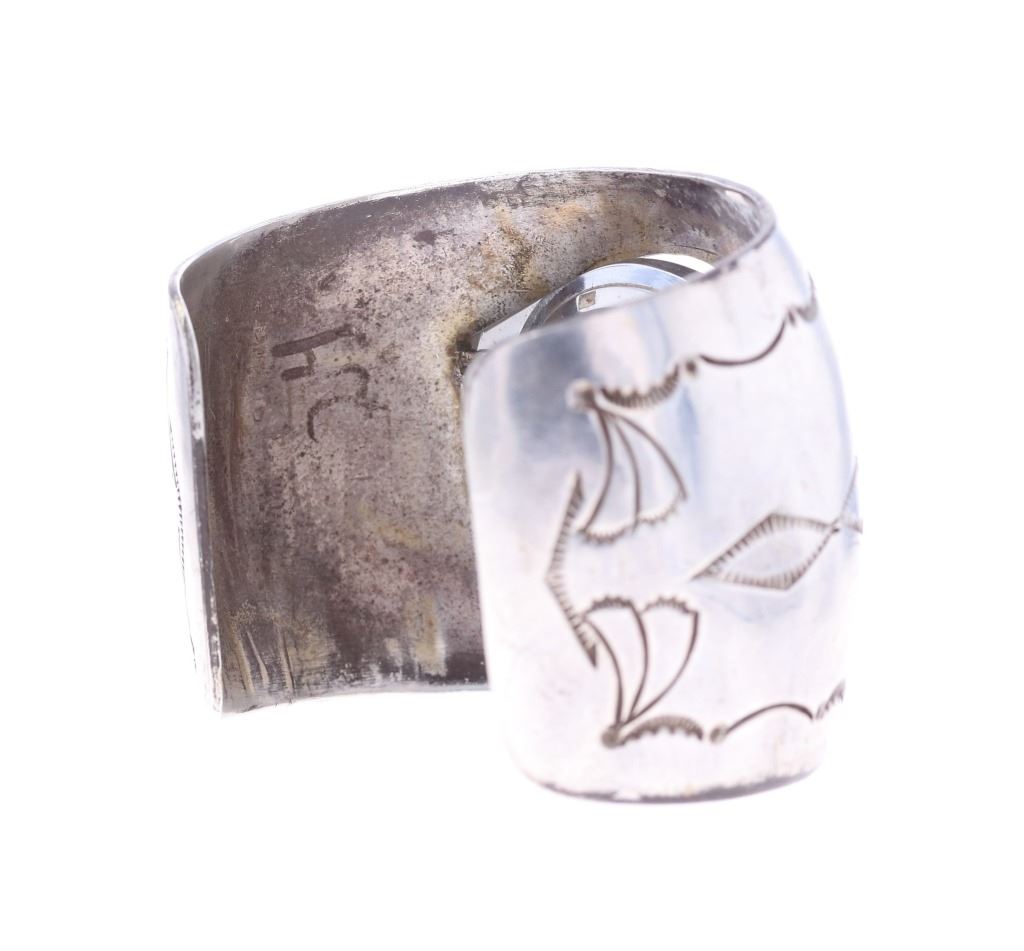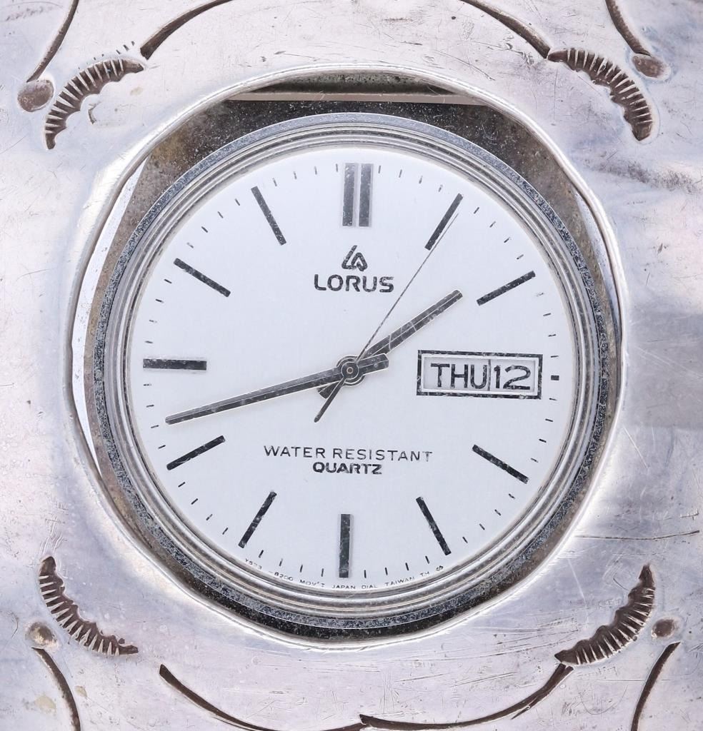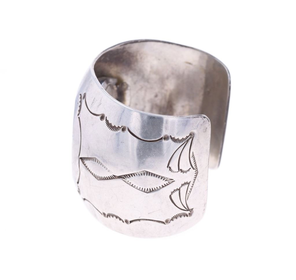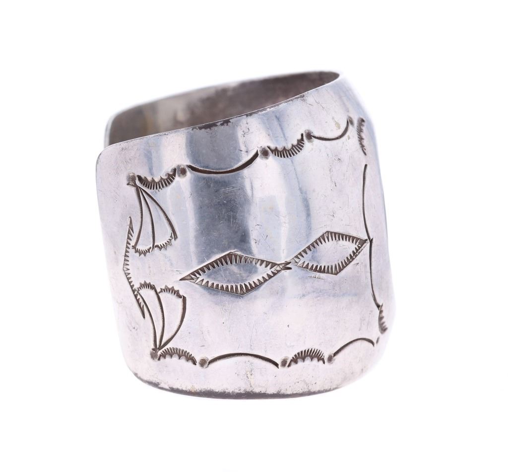 Featured in this lot is this Navajo sterling silver tooled watchband circa 1970's. The watchband features a wonderfully and professionally crafted sterling silver construction that shows a wide frame with tooled and stamped decoration with geometric patterns, and the watch shown set into the watchband is a Lorus circa 1980's and is water resistant. The condition of this Navajo watchband is good with some patina to the silver but otherwise shows a good overall condition. The overall measurements of this watchband is 2" x 2 5/8" x 2 1/4" and the inside measurements of this watchband is 5 1/2" and the gap measures 1 1/12". The collective weight of this watchband is 118.3g.