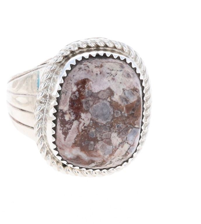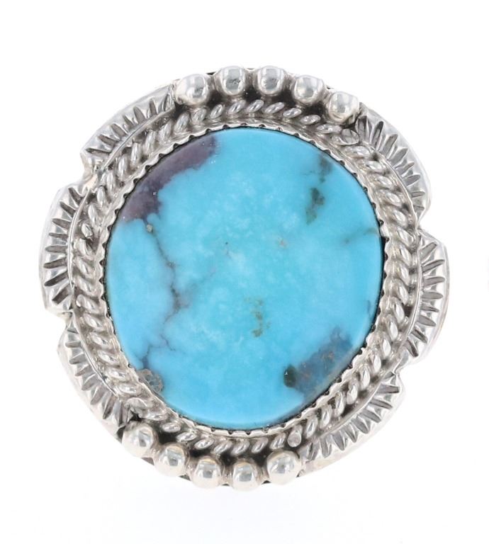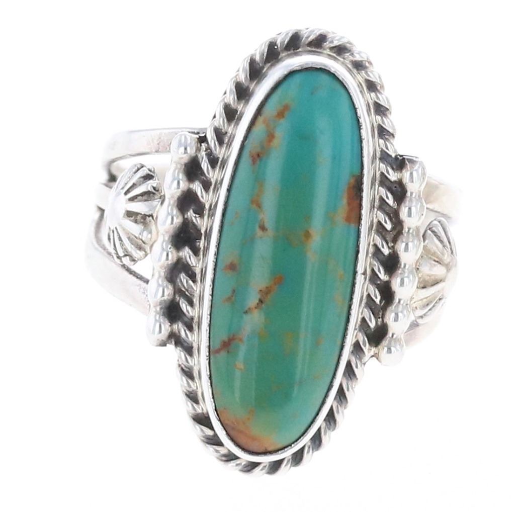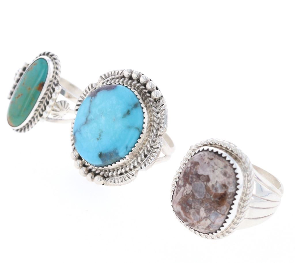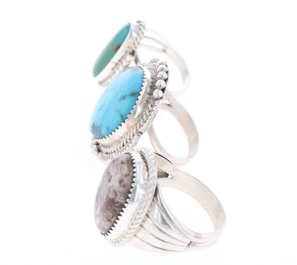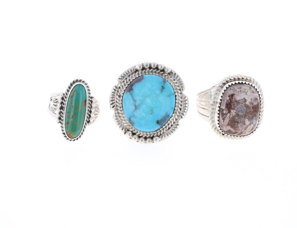 Featured in this lot is this sterling silver turquoise and agate ring collection from Navajo artists Herbert Tsosie, Alberta Yazzie, and Sally Yazzie. There are three rings in this collection. The first is a wonderfully and professionally crafted sterling silver and agate construction that features scalloped shoulders that shows a twisted rope border and a square cut agate cabochon set into the ring face; The ring is marked 'HT' and has a 'sterling' stamp underneath the hallmark. The second ring features a wonderfully and professionally crafted sterling silver construction that features a plate frame with a twisted rope decoration and a large round Kingman turquoise cabochon set into the ring face; the ring is marked 'AR YAZ' and shows a 'sterling' stamp underneath the hallmark. The last ring features a wonderfully and professionally crafted sterling silver construction that features a Cripple Creek turquoise cabochon set into the center of the ring; The ring is marked with 'SY' and shows a 'sterling' stamp next to the hallmark. The condition of this collection of rings is good with no obvious signs of damage and shows good overall condition. The measurements of these rings is 1 1/8" x 1" x 7/8" and shows a ring size of US 11 1/2, the second ring measures 1" x 1 1/8" x 1 1/8" and shows a ring size of US 7 1/2, and the third ring measures 7/8" x 7/8" x 1/2" and shows a ring size of US 7. The collective weight of the rings are 29.7g.