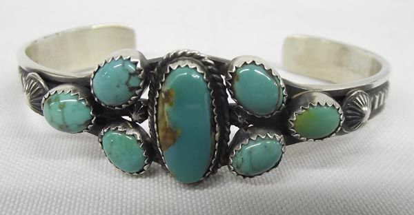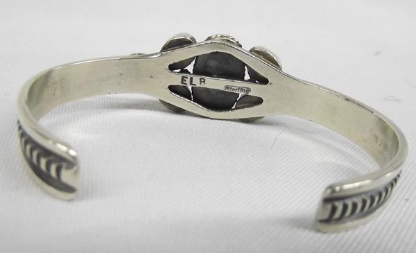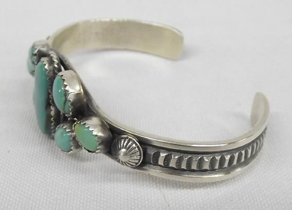 Navajo Sterling Silver & Turquoise Bracelet,Signed. All hand-crafted sterling silver set with beautiful blue-green turquoise cabochons. Artist hallmark ''L.E.B.''. Inside measurement is 6 1/2'' width, 5/8'' wide. This is an exceptional piece of Navajo artistry from Louise & Ella Bella.
