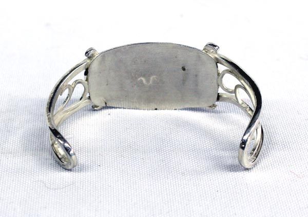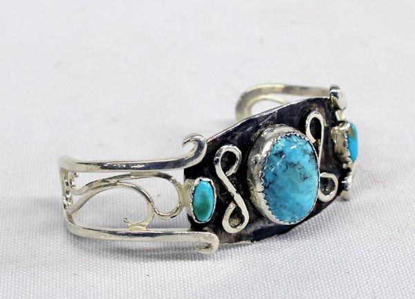Navajo Sterling Silver Turquoise Bracelet, hallmarked, double band accented with scrollwork, 3 turquoise cabs with the largest measuring .75'' x .5'', center cab accented with two scrollwork designs, inside measures 5.5'' includes opening x 7/8''W, nice little bracelet