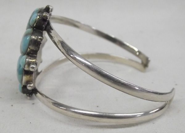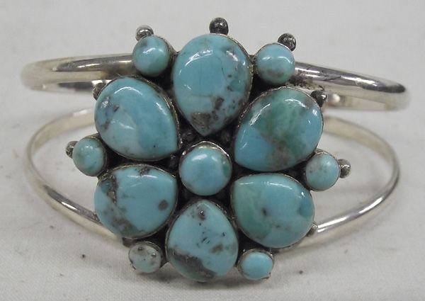 Navajo Sterling Silver & Turquoise Bracelet. Turquoise is arranged in a flower pattern and includes 6 tear drop shaped stones and 7 round stones. Stamped .925 on the inside, this item has an inside measurement of approx. 6.5'' including opening and is 1.5'' wide.