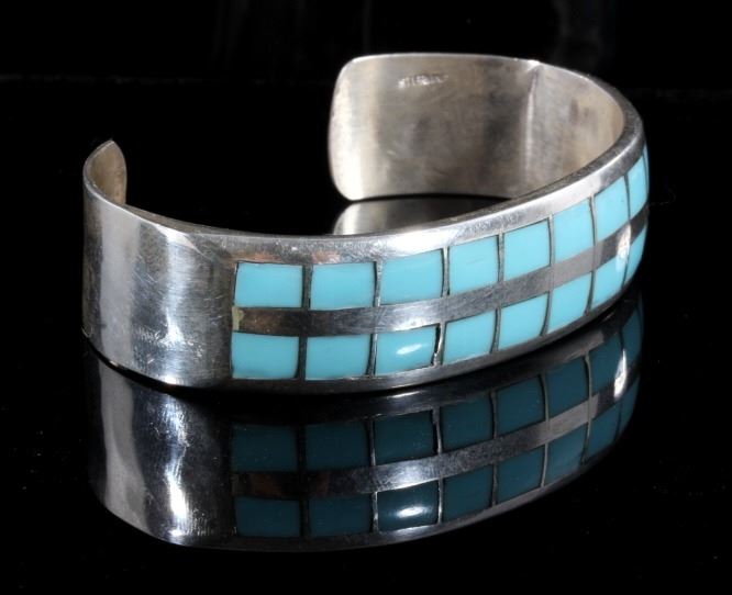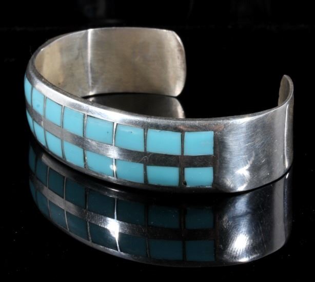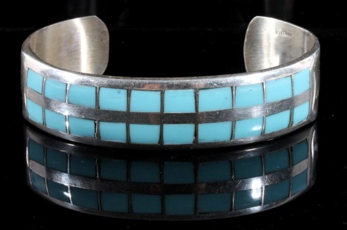 In this lot we have a Navajo Native American sterling silver bracelet with sleeping beauty turquoise. The cuff is sterling silver with 20 sleeping beauty turquoise stones set in the silver. The bracelet is in great shape and is marked with "Sterling" and the hallmark "ANC". The interior diameter of the cuff measures 6.25"