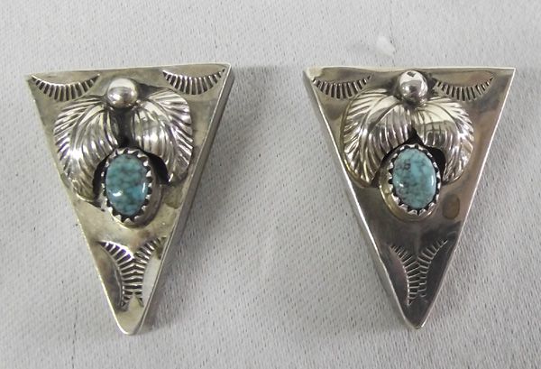 Navajo Sterling Silver Turquoise Collar Tips. Stamped designs and repousse feathers surround a turquoise cabochon on each collar tip. They are stamped on the back with the artist's name ''Oscar Alexius''. Also stamped sterling. They measures 1-1/8''x7/8''.