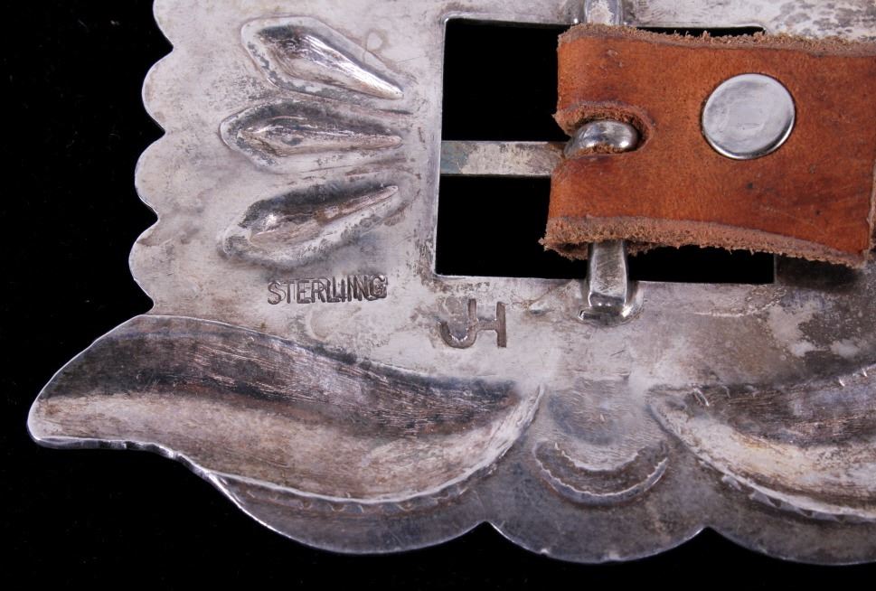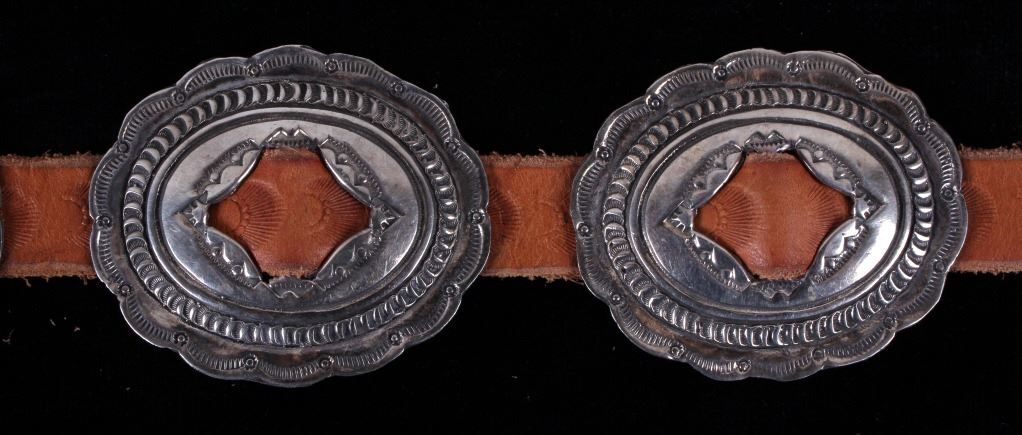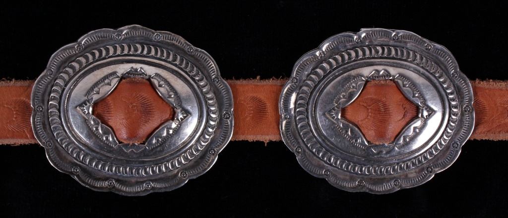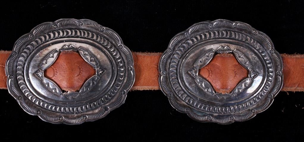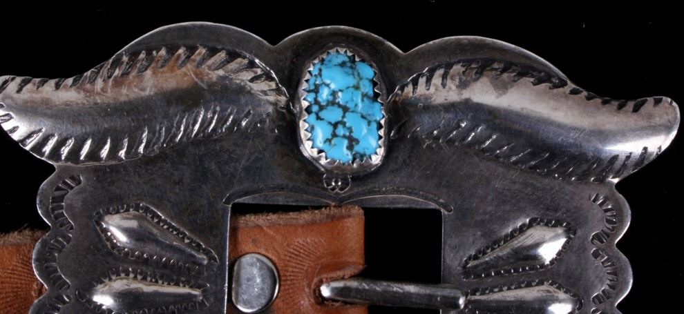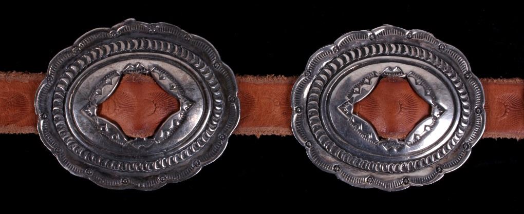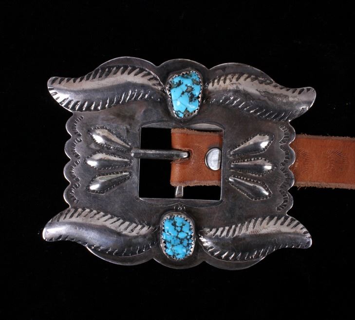 Available for your bidding pleasure is this Navajo Native American Indian Second Phase Style Sterling Silver and Sleeping Beauty Turquoise concho belt. This belt shows a large second phase style buckle with two Sleeping Beauty Turquoise stones. This piece also showcases eleven beautiful stamped oval conchos with beautiful design. The buckle is stamped "Sterling JH" for Jimmy Herald. This piece is in excellent condition and measures 42" long. The buckle measures 3 1/4" X 2 1/2". Each concho measures 2 1/4" X 1 3/4".