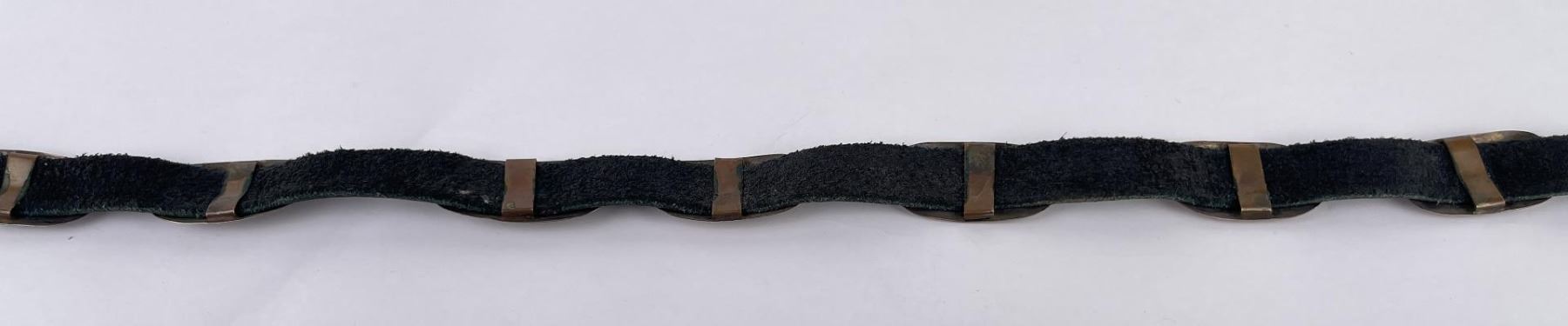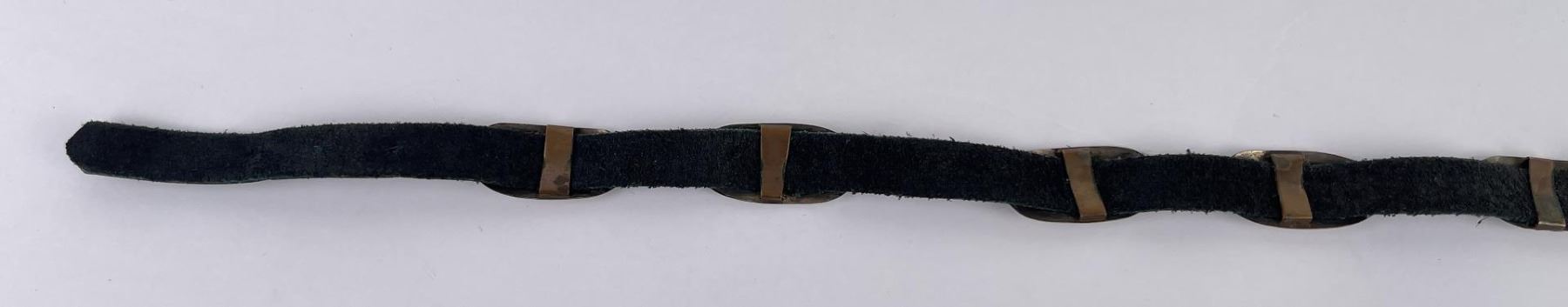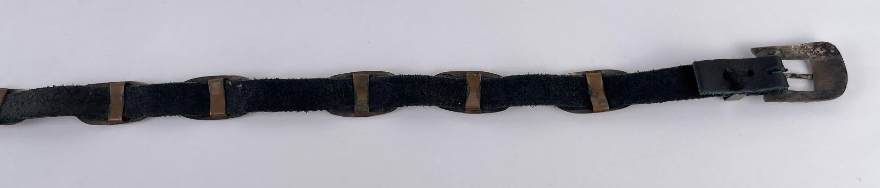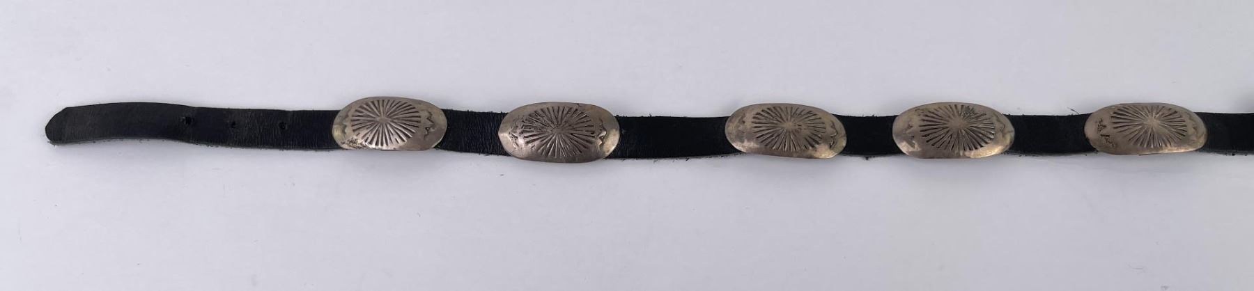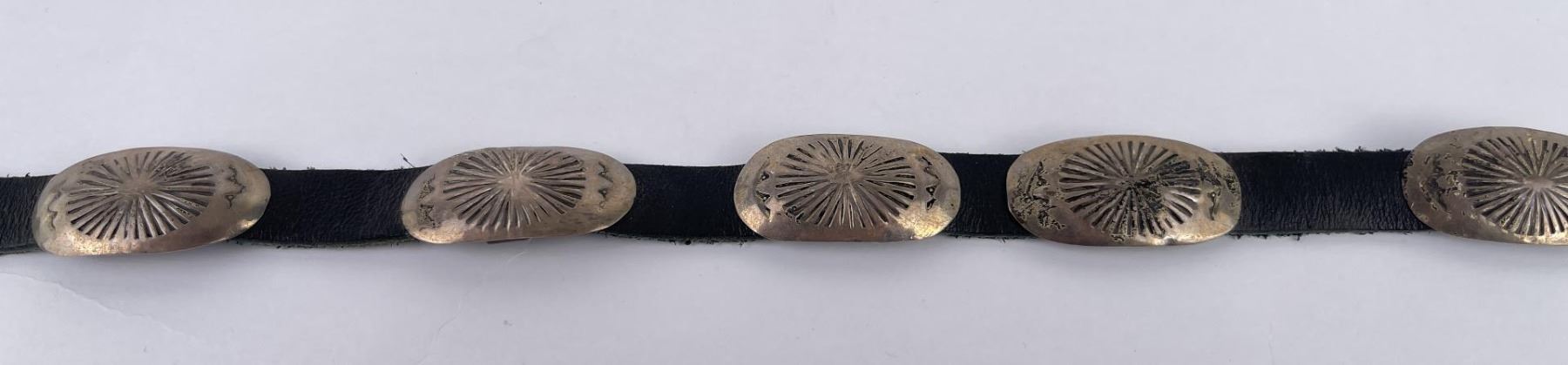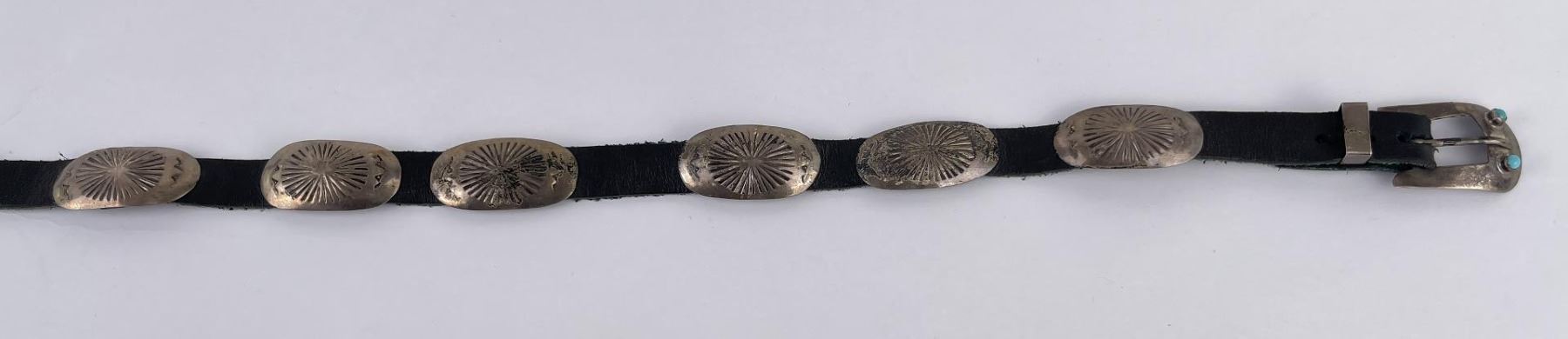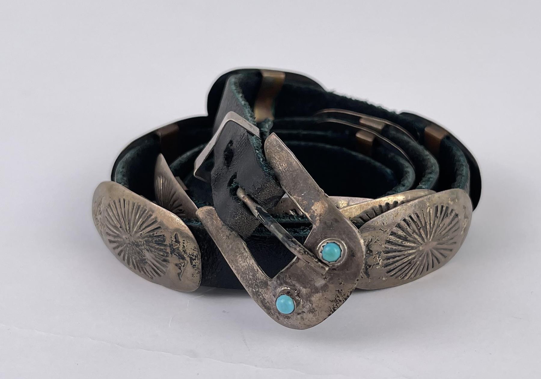 Nice belt. Sterling Silver conchos. Buckle set with turquoise. 26.25" long overall.