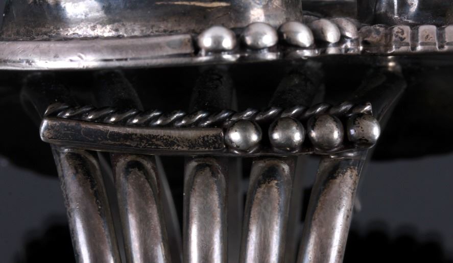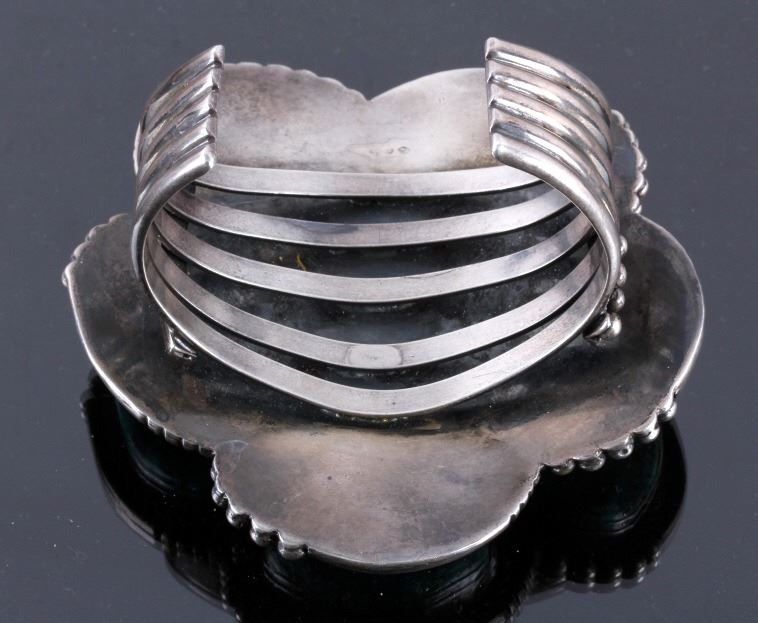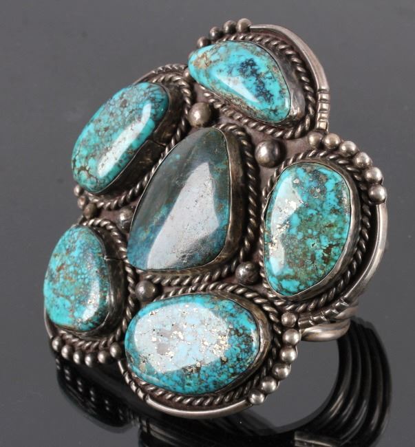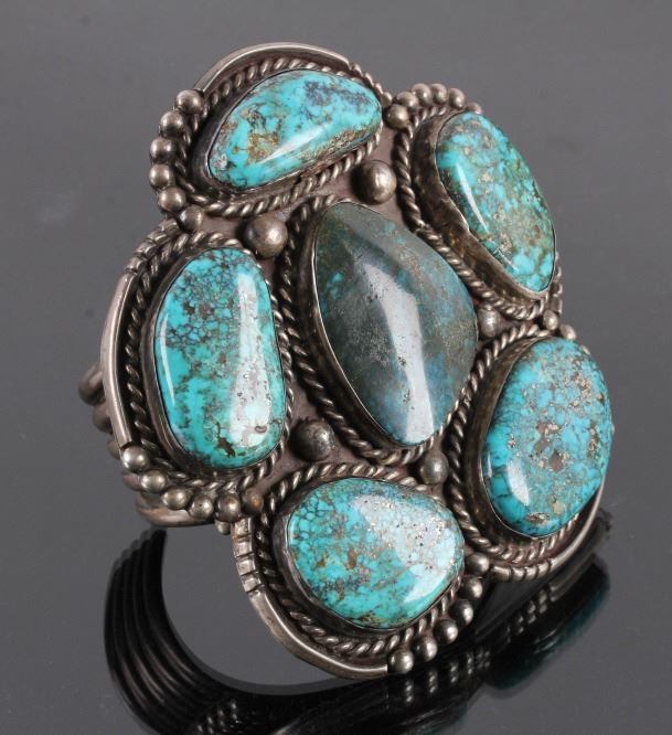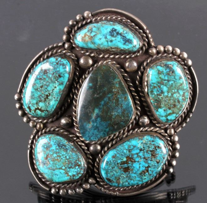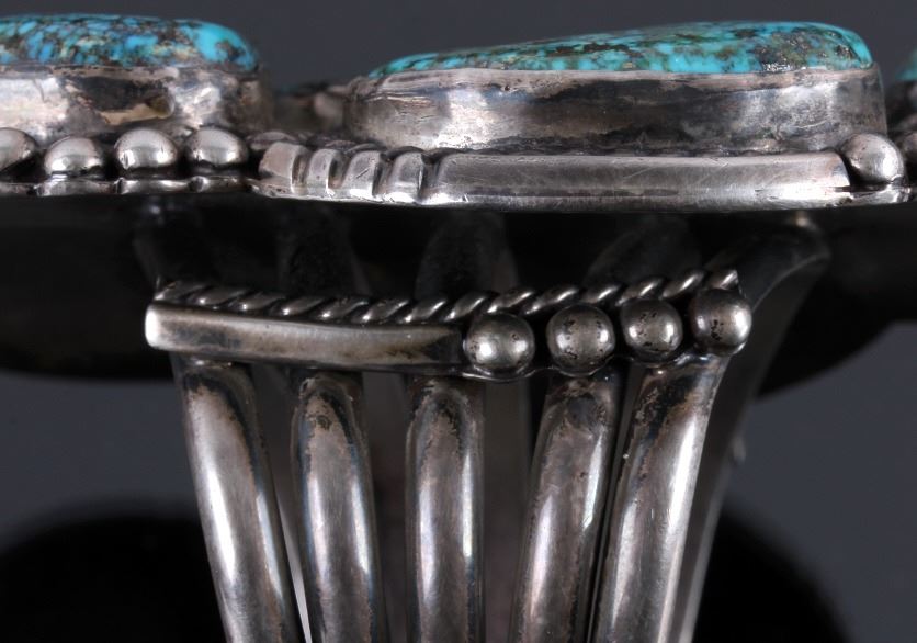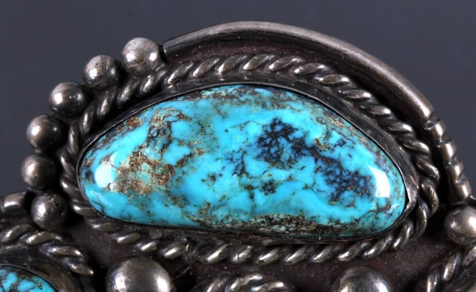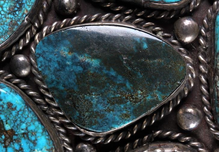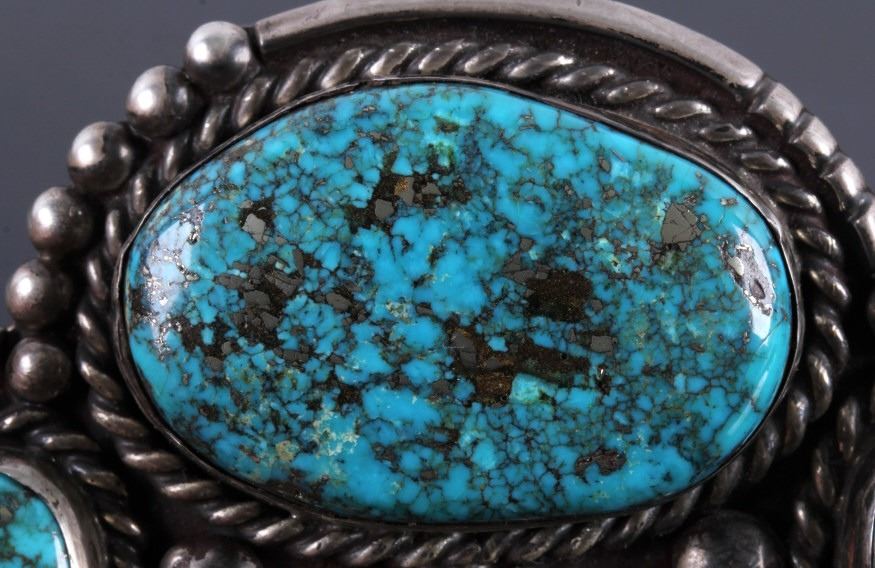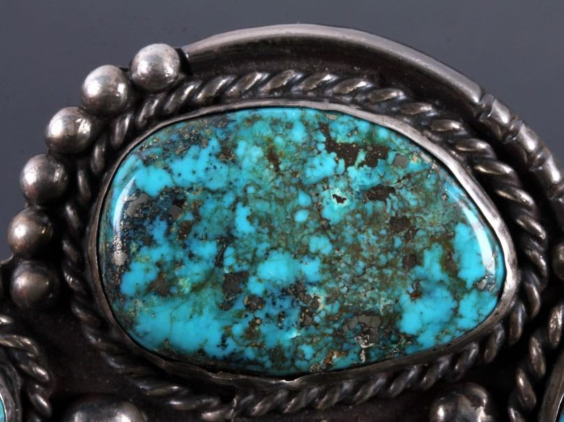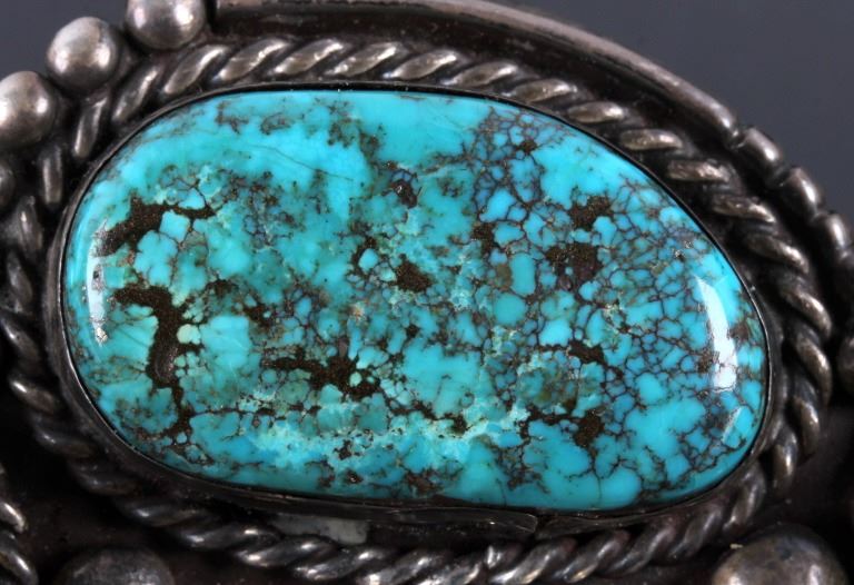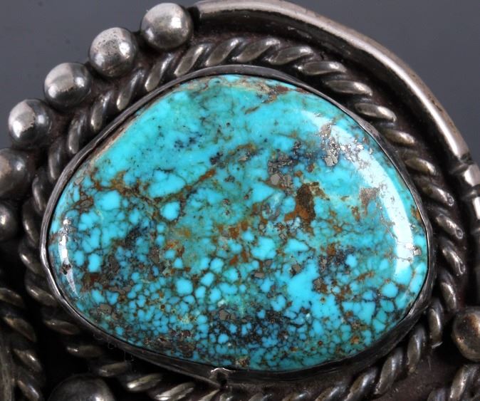 This is a large Navajo sterling silver and turquoise cuff bracelet. The cuff features large Pilot Mountain Turquoise set in sterling silver. The turquoise is surrounded by twisted rope accents and silver spots. The piece shows fantastic workmanship and is in very good condition. One of the finest Navajo cuffs available. The Navajo silver and turquoise cuff measures 4" x 4.25".