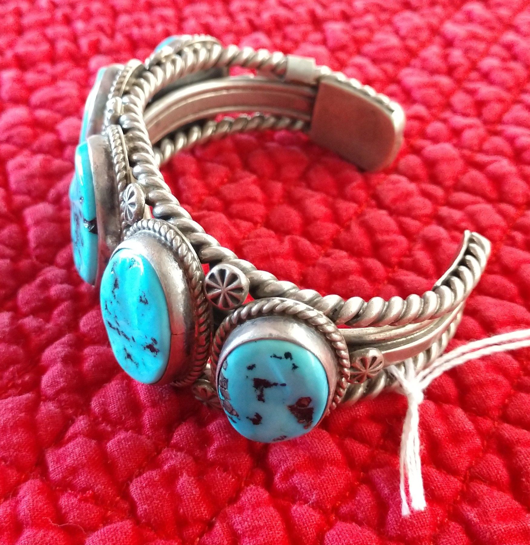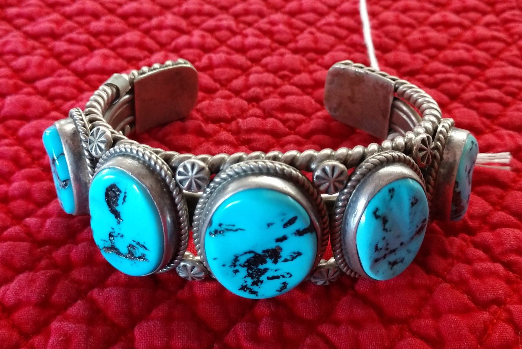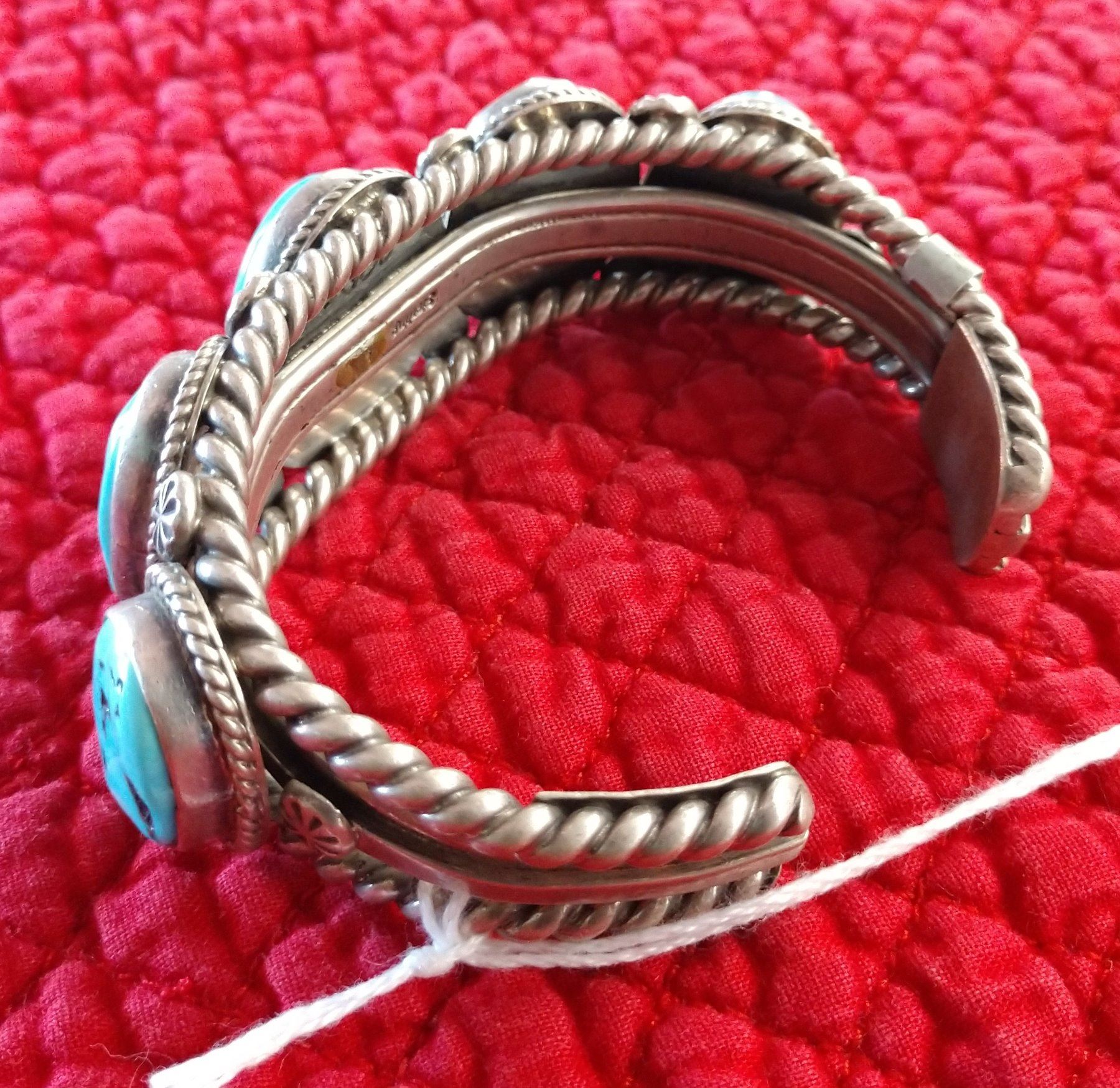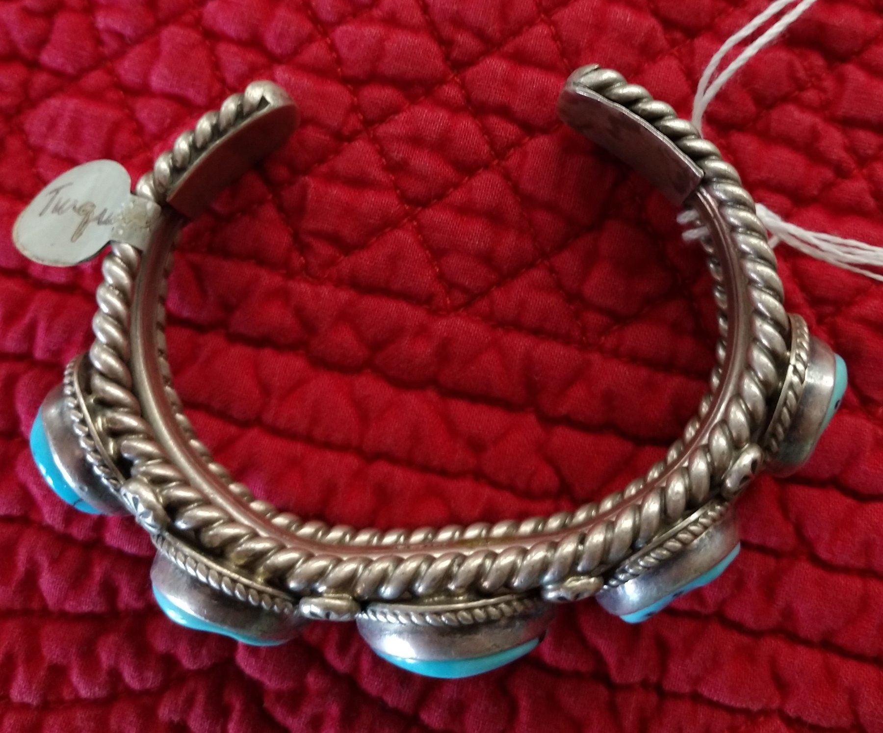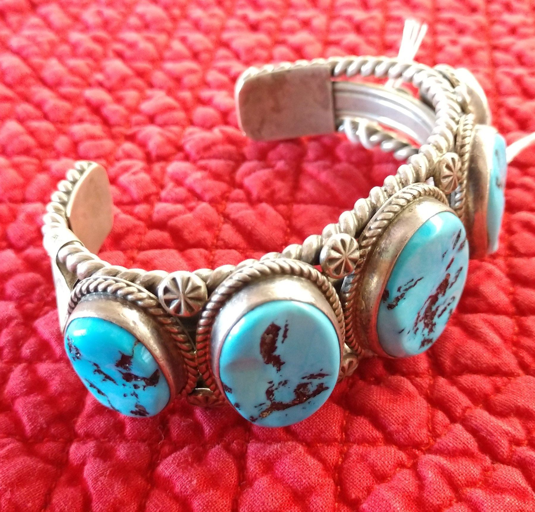 Navajo Sterling Silver & Turquoise Cuff c. 1960s, made of sterlingsilver and turquoise, the item measures 5 1/2" inside and 3 1/4" x 2 1/4" x 1 1/8" overall. Weighs approx. 95.6 grams. Navajo, Arizona. Heavy cuff with 5 large turquoise stones, nice color and matrix. Extra silver work throughout and handstamped wheel design.