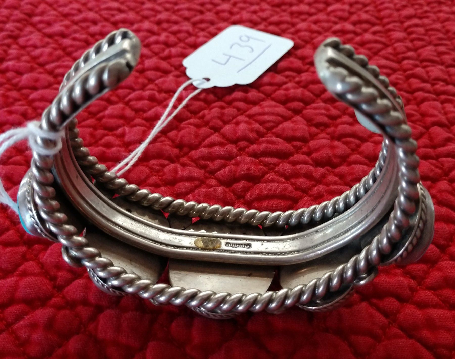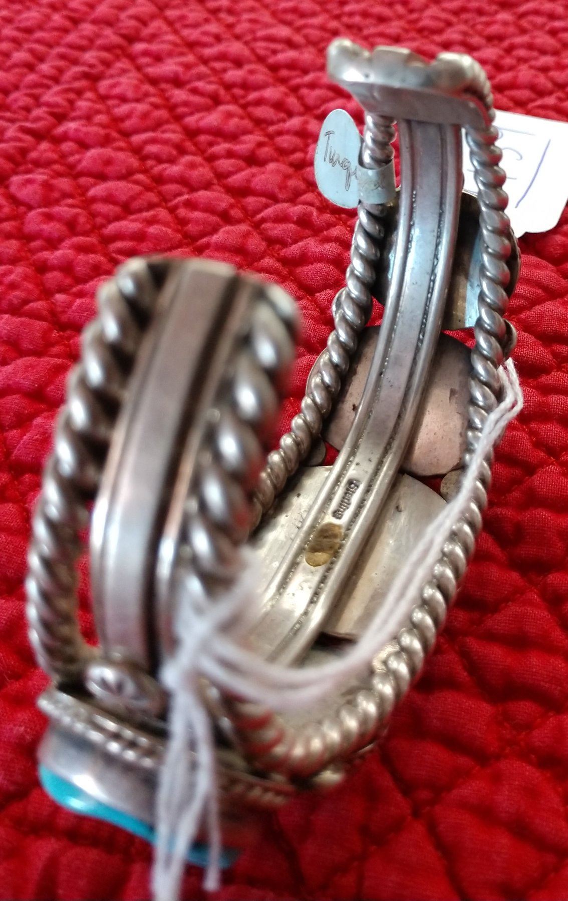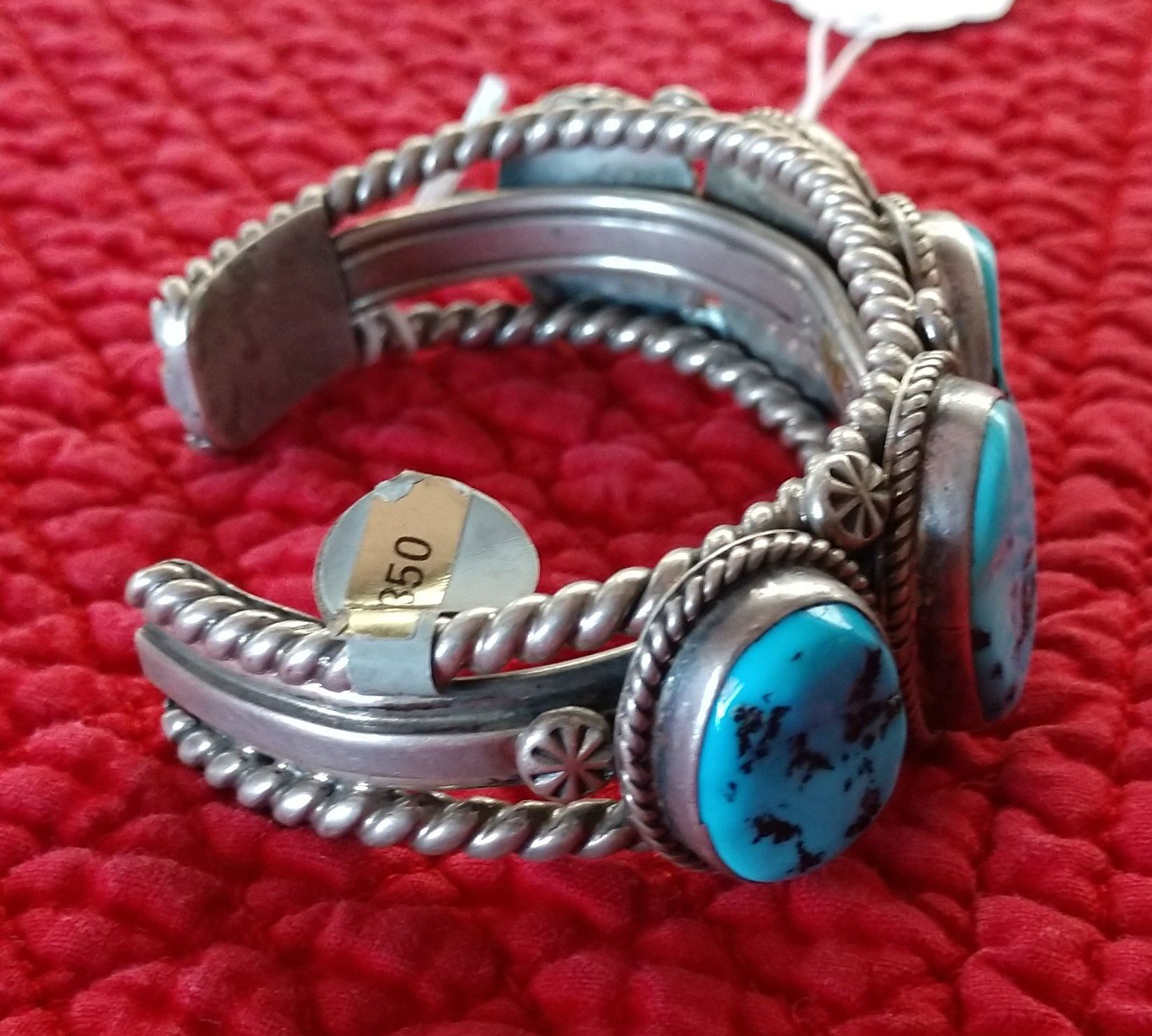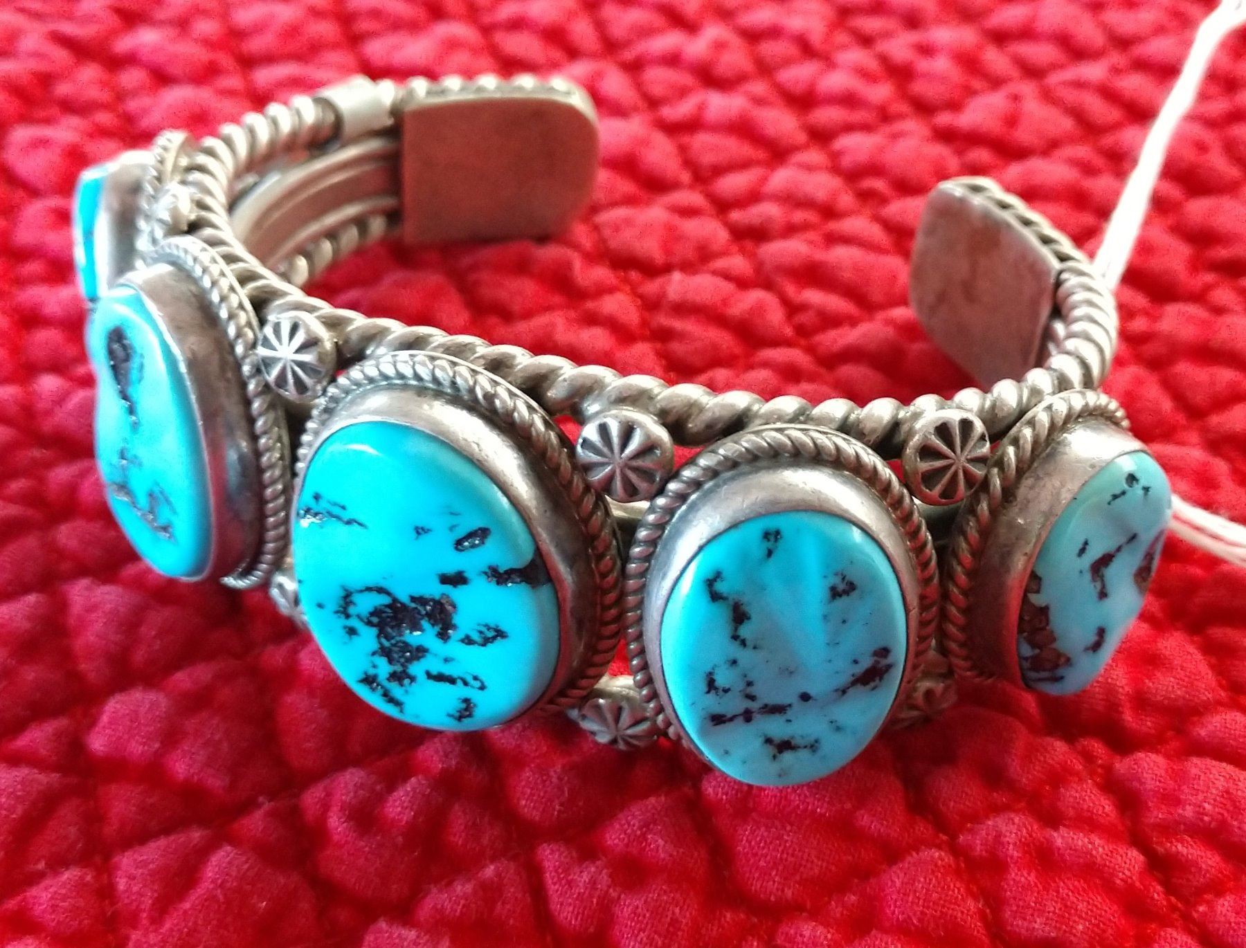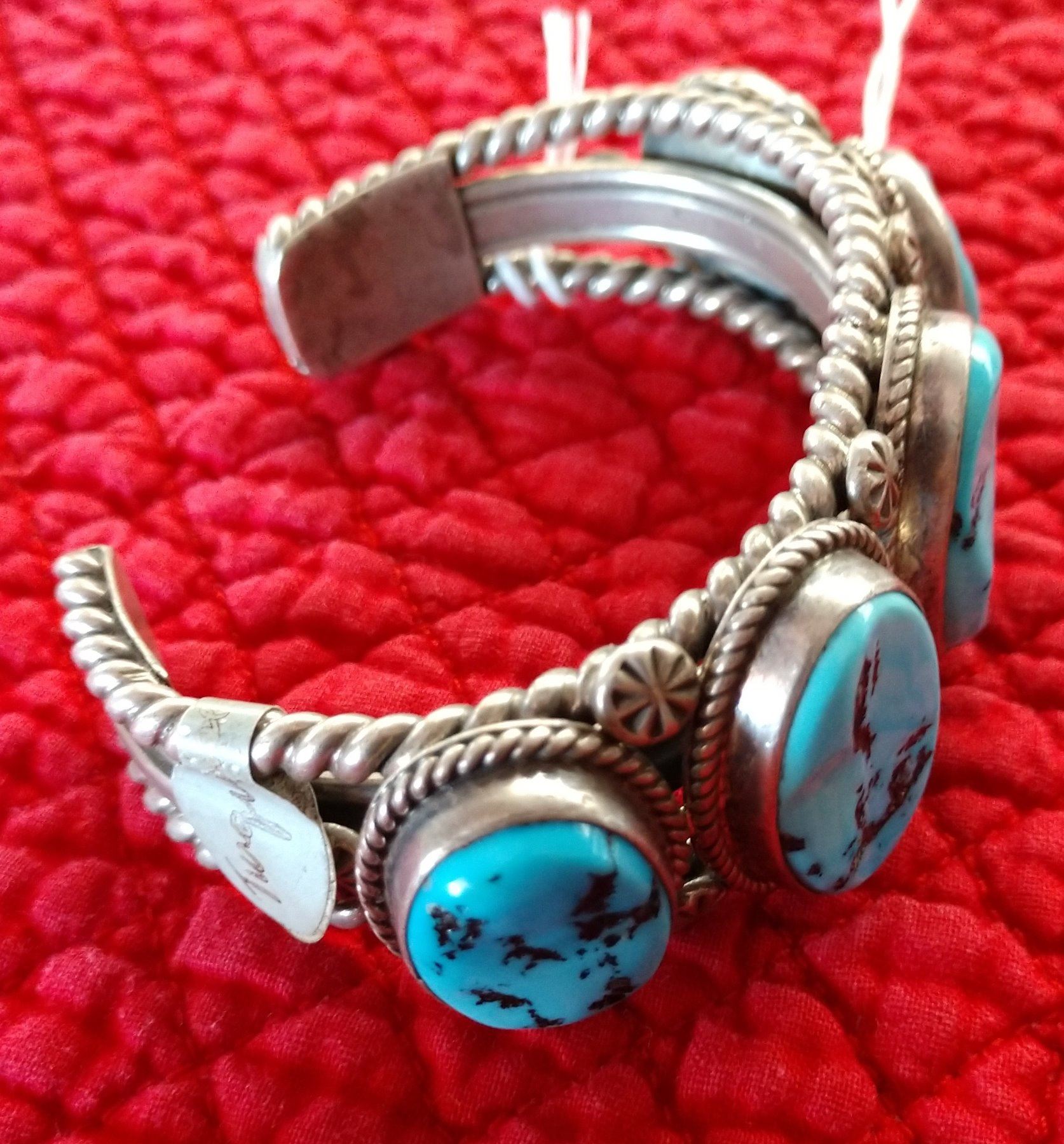 Navajo Sterling Silver & Turquoise Cuff c. 1960s, made of sterlingsilver and turquoise, the item measures 5 1/2" inside and 3 1/4" x 2 1/4" x 1 1/8" overall. Weighs approx. 95.6 grams. Navajo, Arizona. Heavy cuff with 5 large turquoise stones, nice color and matrix. Extra silver work throughout and handstamped wheel design.