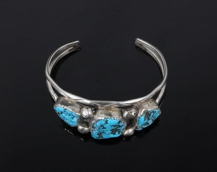 For your bidding pleasure we have this Navajo Native American Sterling Silver and Sleeping Beauty Turquoise child's bracelet. This beautiful bracelet shows three polished Sleeping Beauty Turquoise stones set on a solid silver bracelet. The piece also shows four polished silver nuggets as well as some added design to the silver bars. The condition of the piece is good showing little to no wear. The inner circumference of this bracelet is 4".