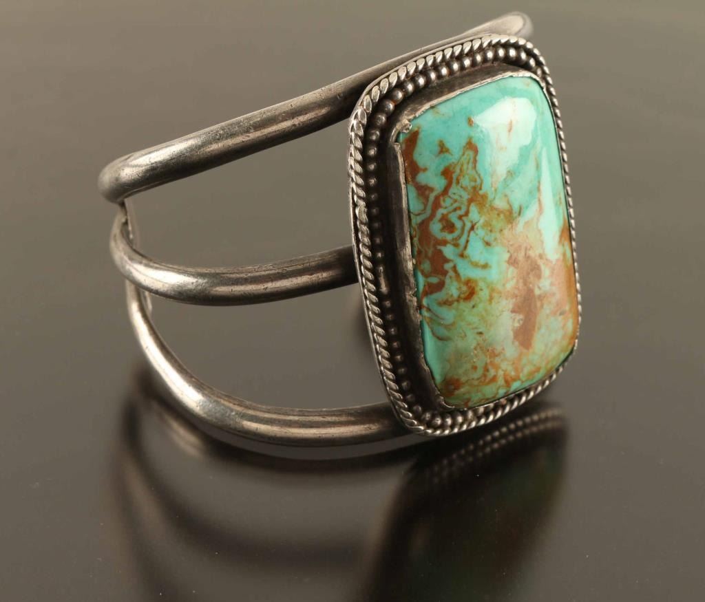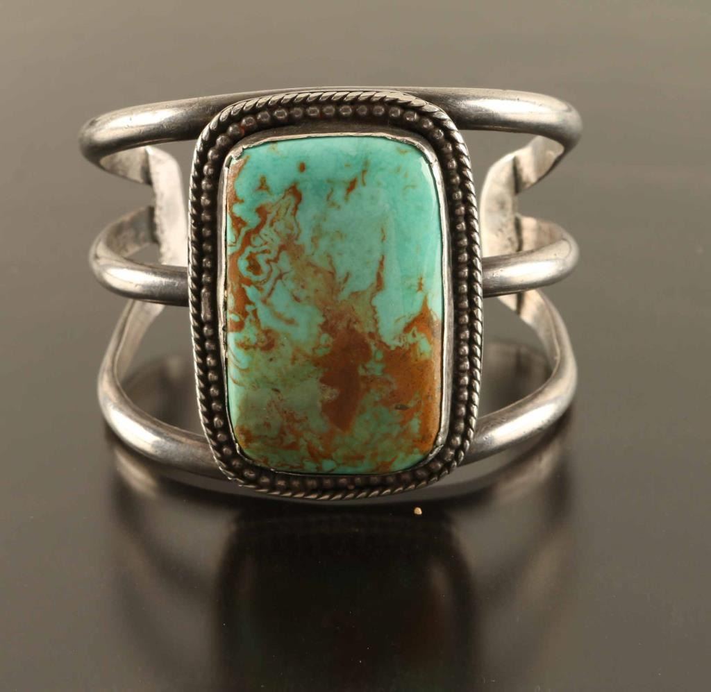 Large rectangle of blue green turquoise 1 5/8"x1 1/8" with a brown matrix with silver rope border. Signed with artist's hallmark. Size 7 1/2