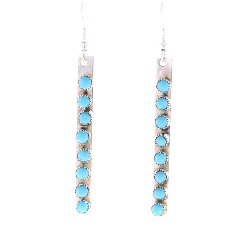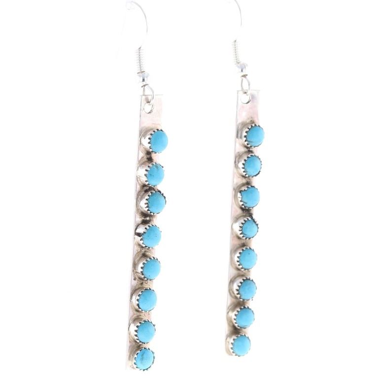 Featured in this lot is this pair of Navajo sterling silver and sleeping beauty turquoise dangle earrings. These earrings feature wonderfully and professionally crafted, Navajo-made decoration of a sterling silver dangle bar with a total of 16 total sleeping beauty turquoise round cabochons set into the face of the earrings. The condition of these earrings is good, with no obvious signs of damage. The measurements of these earrings are 2 3/4" x 1/4" x 5/8". The overall weight of these earrings is 5.9 g.