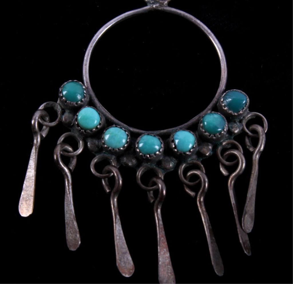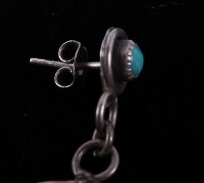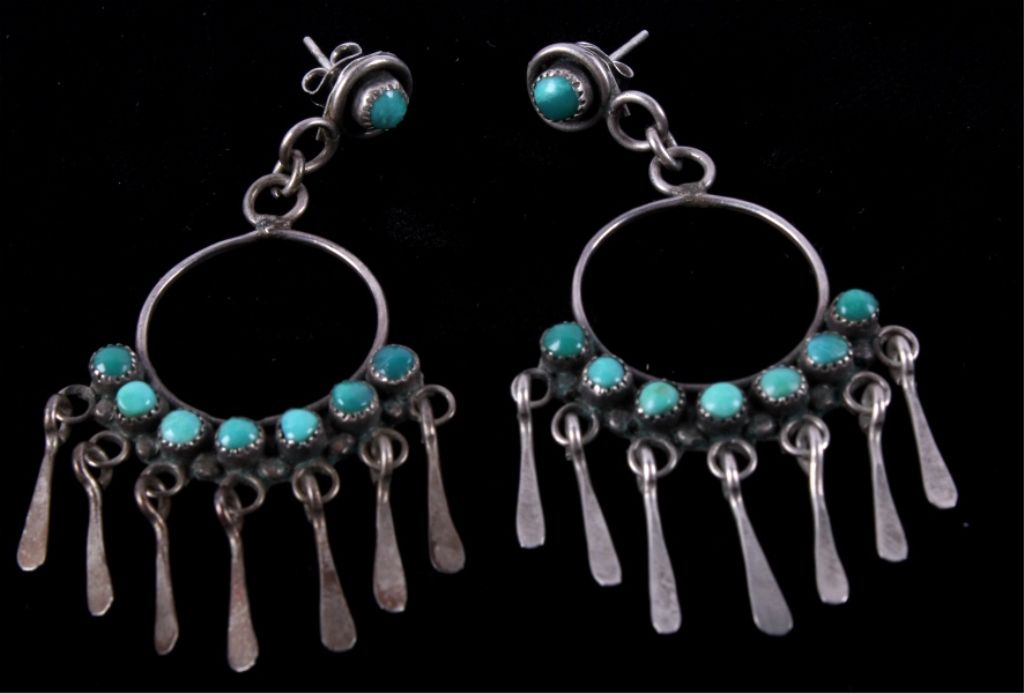 This lot features a set of Navajo Sterling Silver and Turquoise Earrings. Each earring has 8 turquoise gemstones set into the silver. The Earrings measure 2.25".
