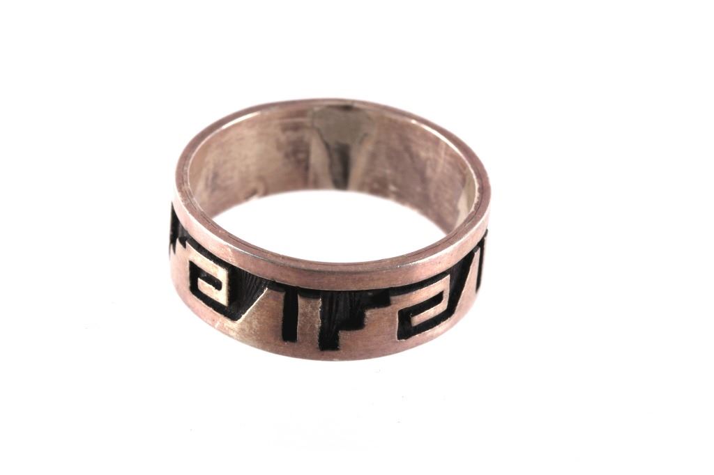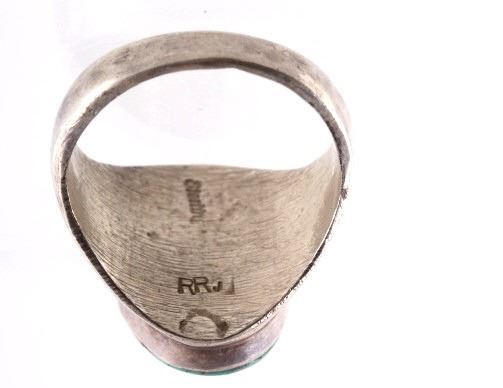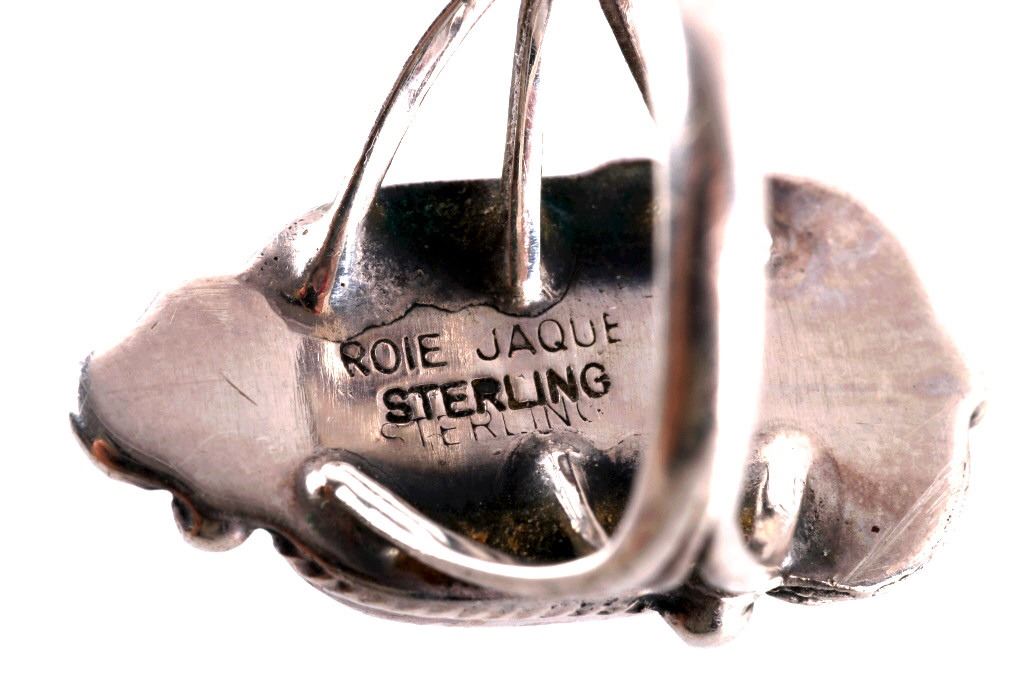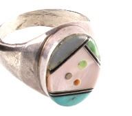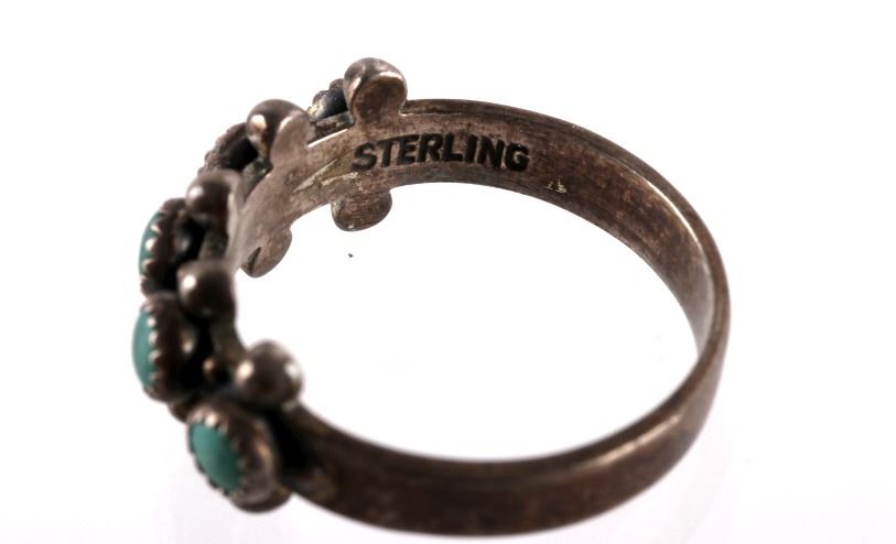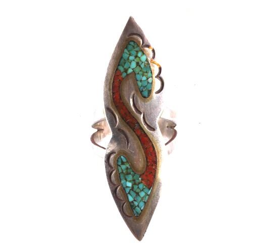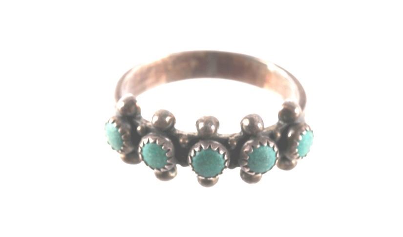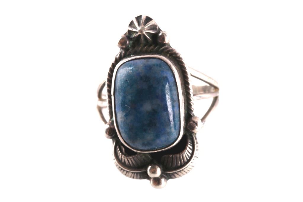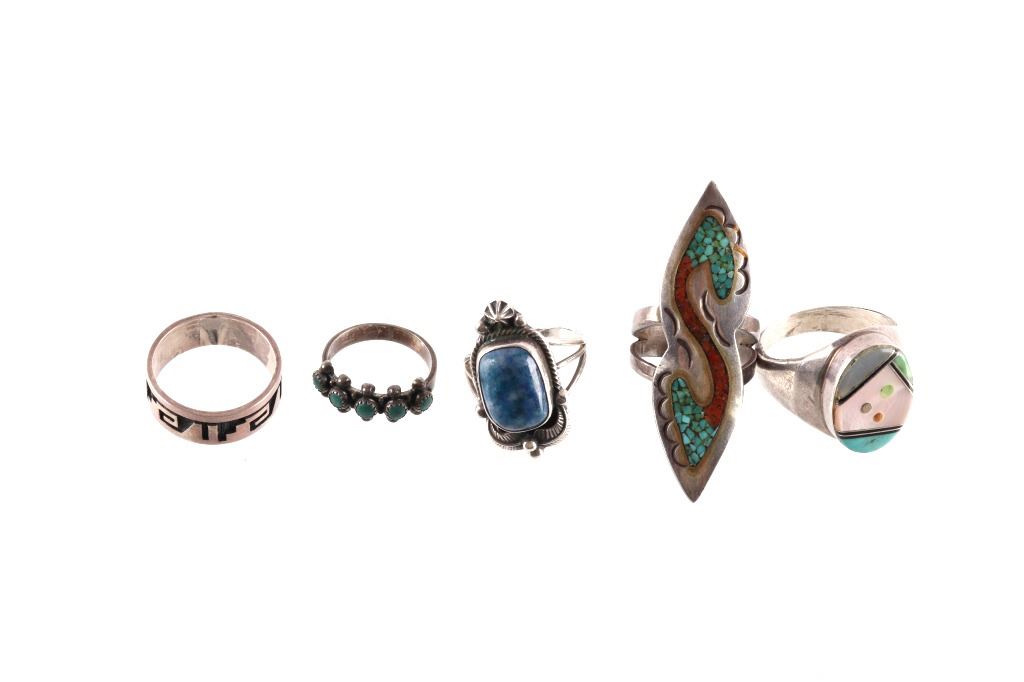 For your biding pleasure is this lot of Navajo silver rings. There are five rings in this collection. The first three rings are marked “Sterling”. The rest of the rings are unmarked. The first ring is a Denim Lapis Lazuli cabochon framed with feathers and silver drops, U.S size 7, with artist Roie Jaque stamp inside. The second ring has a multi stone inlaid mosaic face on a wide band. The ring is marked “Sterling” and with artist initials of “RRJ” and U.S. size 11 1/2. The third ring is marked “Sterling” and is old pawn style with five turquoise beads with ten silver drops. This ring has great patina and is U.S. size 5 1/4. The next ring has a long double teardrop face with a turquoise and coral chip snake inlay. The face of the ring is 2" long by 5/8" wide on a split band, size U.S.7 1/4. This ring has classical silver patina. The last ring in the lot is U.S. size 9; it has deep, hand stamped, stepped geometric designs across the exterior. The condition of these rings is good to fair. The collective weight of this lot is 35.0 grams