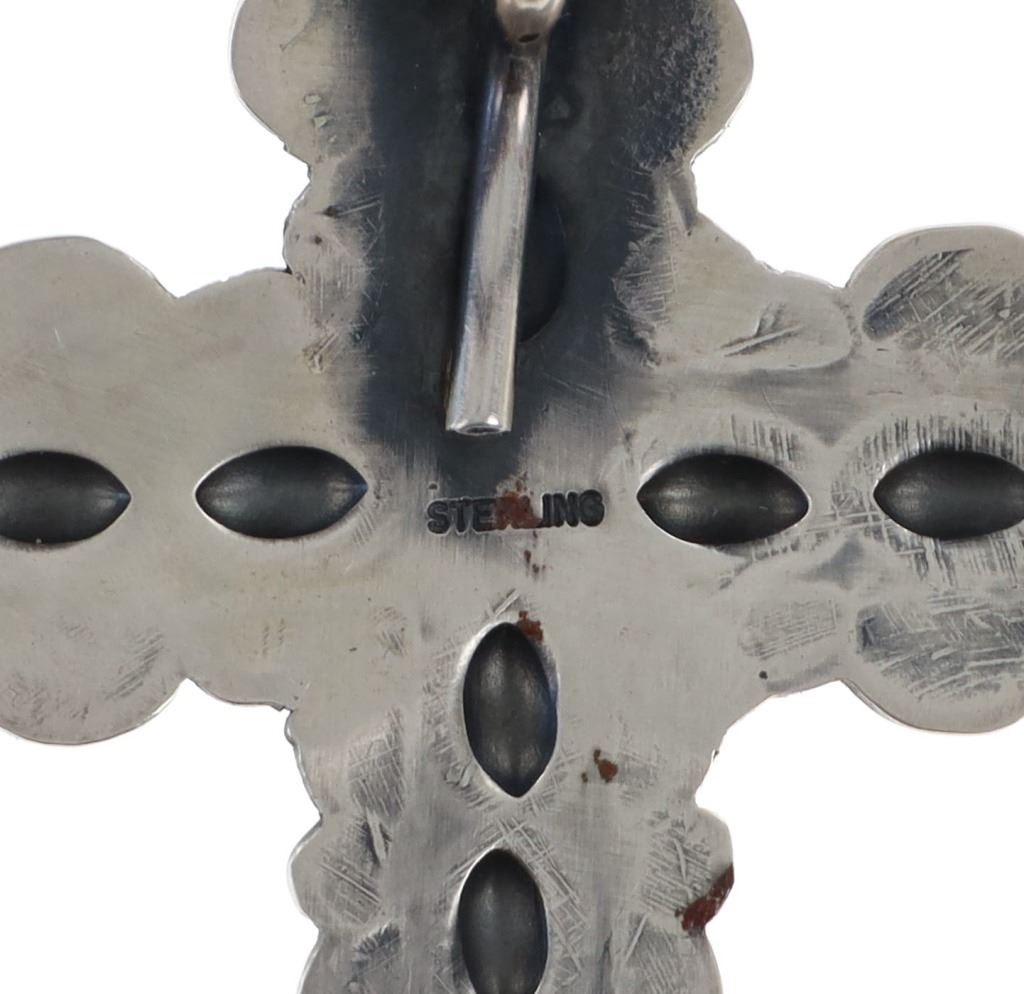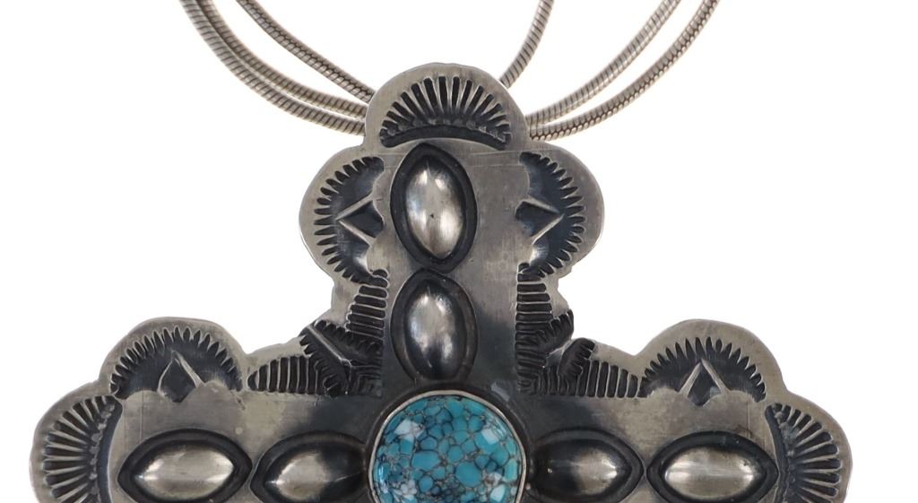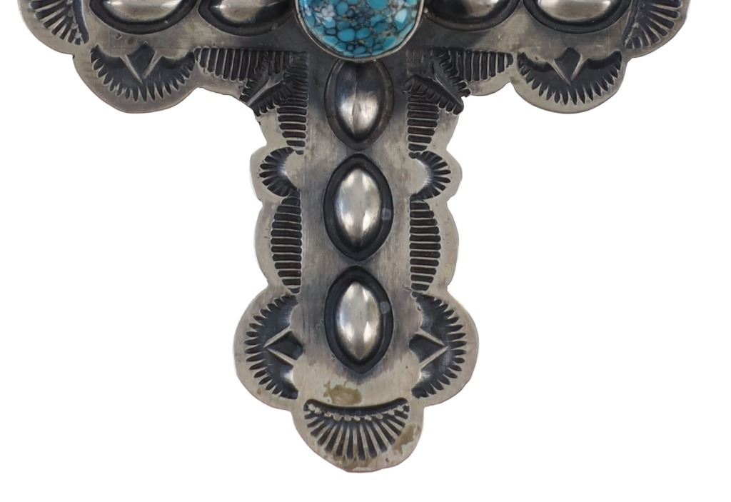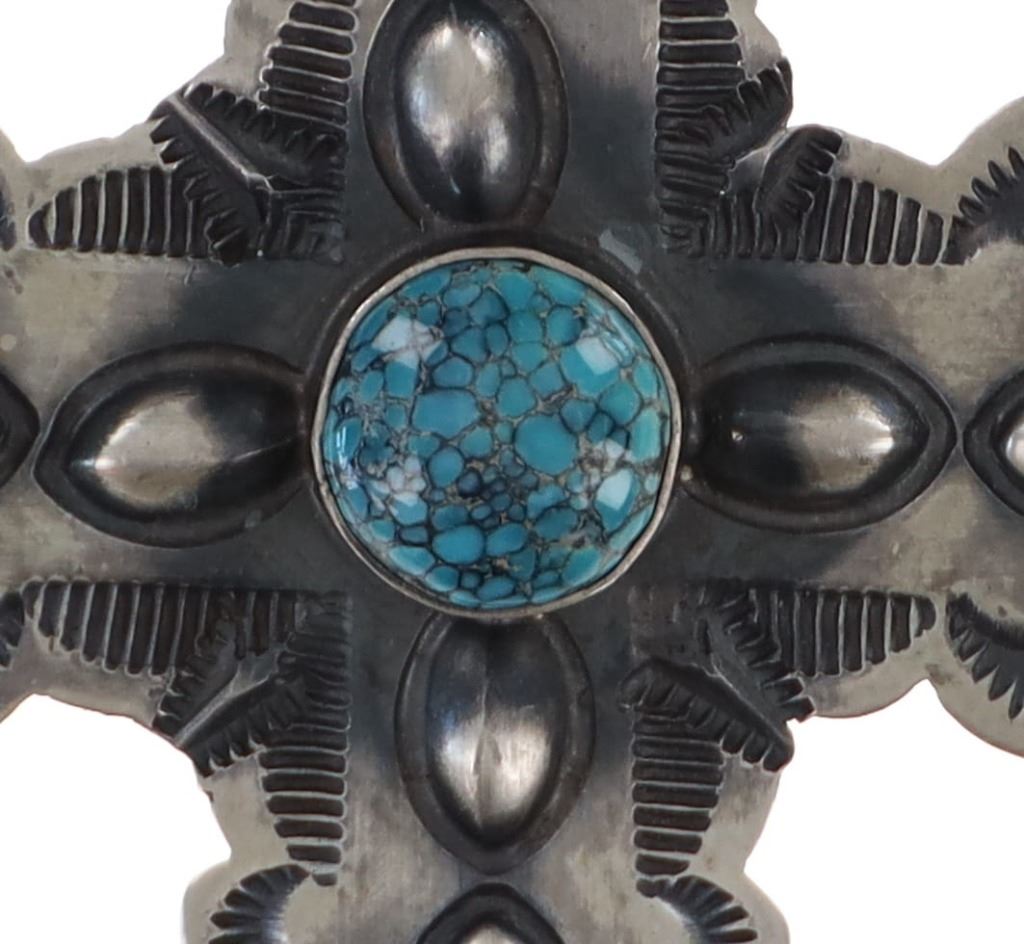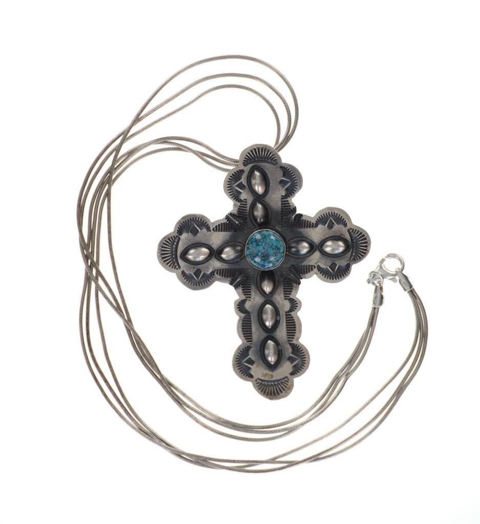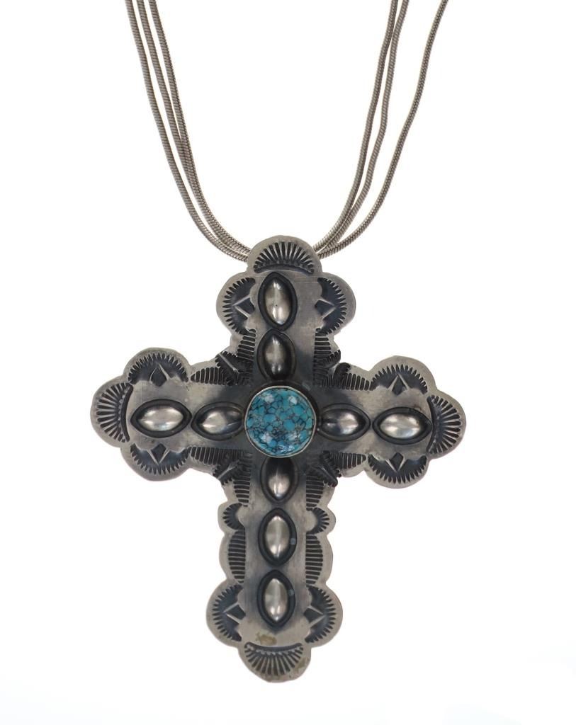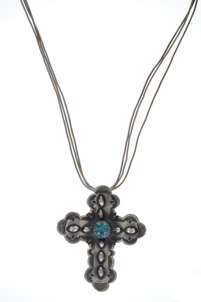 Featured in this lot is this Navajo sterling silver turquoise necklace circa 1960's. The necklace features a wonderfully and professionally crafted sterling silver and turquoise construction. The necklace features a triple strand necklace chain and shows a stamped cross necklace that shows a round Kingman turquoise cabochon with a vivid matrix. The cross is marked on the back 'sterling.' The condition of this Navajo necklace is good with no obvious signs of damage and shows good overall condition. The measurements of this necklace from clasp to clasp is 17 1/2" and the pendant measures 2 1/2" x 2 1/8" x 3/8". The collective weight of this necklace is 26.1g.