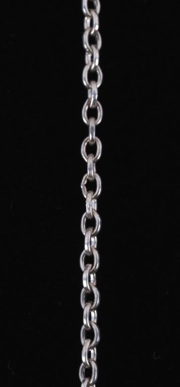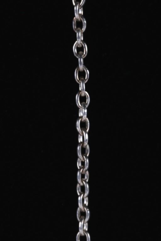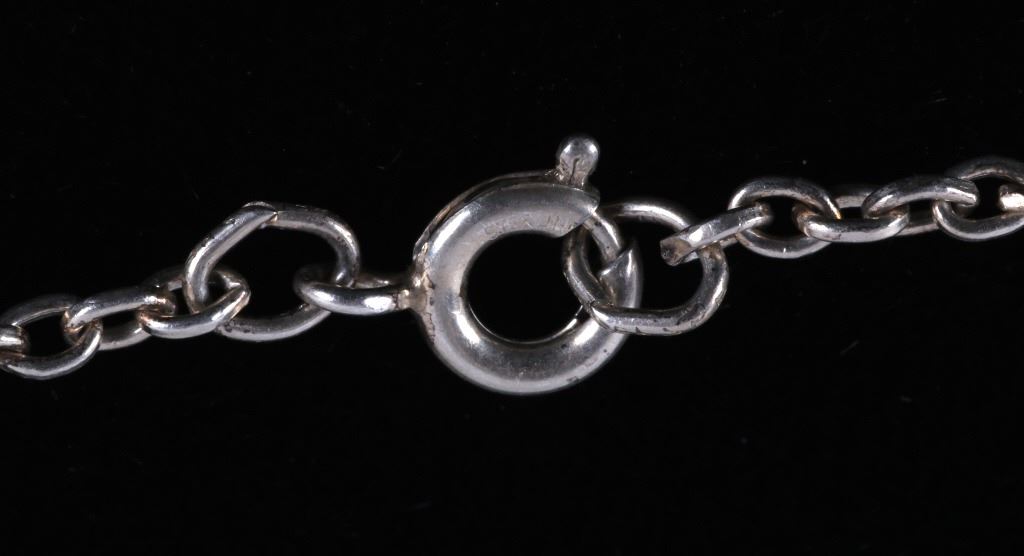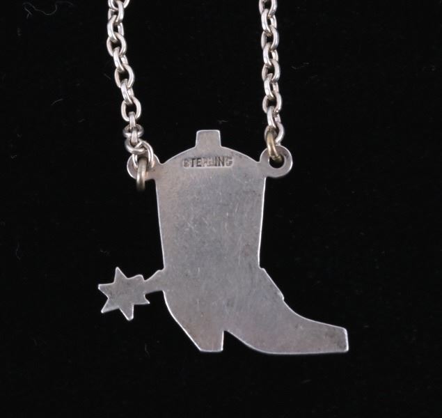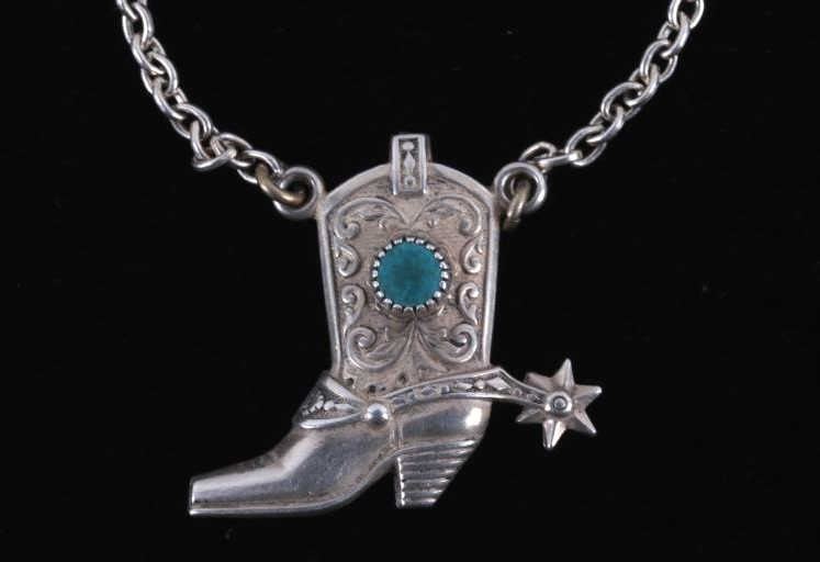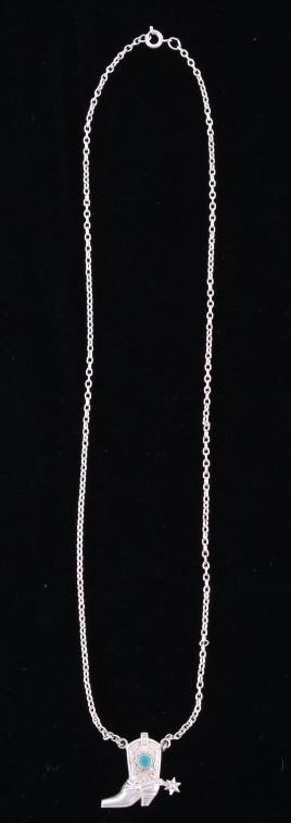 Included in this lot is a Navajo Native American sterling silver and Sleeping Beauty turquoise necklace. This necklace features a cable style chain with spring ring clasp marked sterling. The attached pendant features a classic cowboy boot styling with spur. A simple Sleeping Beauty turquoise stone is set which adds a nice depth detail. The back of the pendant is marked sterling. This necklace measures 18 1/2" when unclasped.