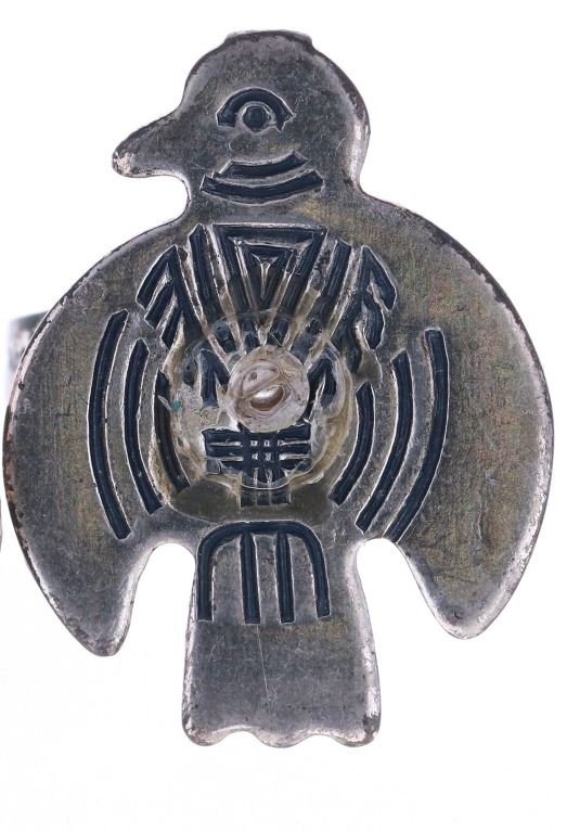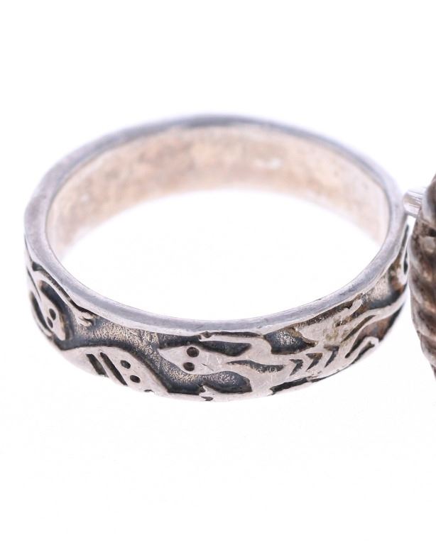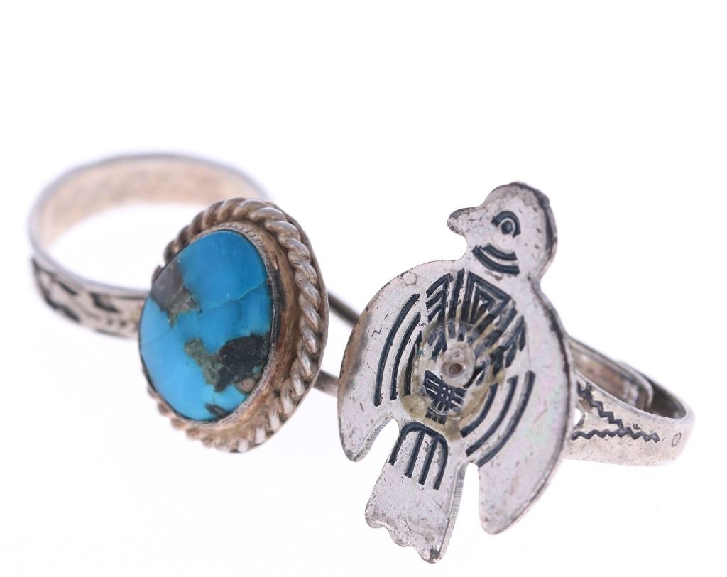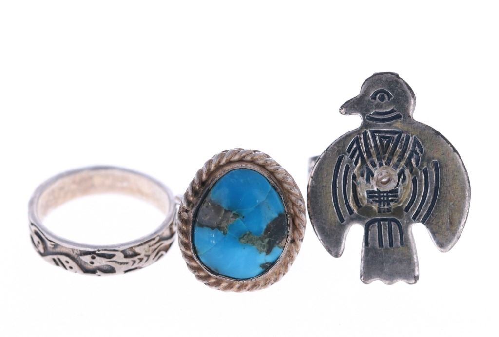 Featured in this lot is this collection of Navajo sterling silver & Turquoise rings. There are three rings in this collection. The first is a beautiful sterling silver gecko effigy ring that has lizards tooled into the face of the ring. The second ring features a beautiful sterling silver construction with a twisted rope decoration around the centerstone that features a oval cut Kingman turquoise cabochon. The last ring is a sterling silver constructed Thunderbird ring with an adjustable ring band. The condition of these rings is good with no obvious signs of damage and in good overall condition. The measurements of these ring is 3/4" x 3/4" x 1/4" and a ring size of US 6 1/4", and 3/4" x 3/4" x 1/2" and a ring size of US 4, and the final ring measures 3/4" x 1" x 3/4" and an adjustable ring size. The collective weight of these rings are 11g.