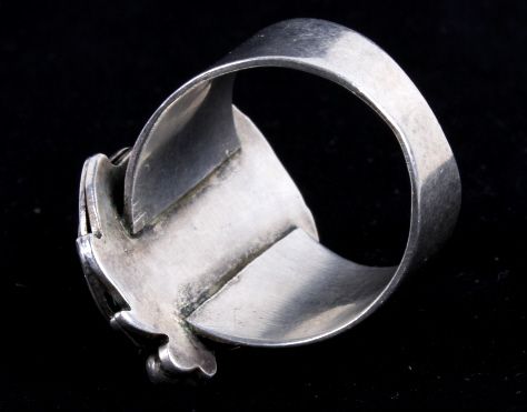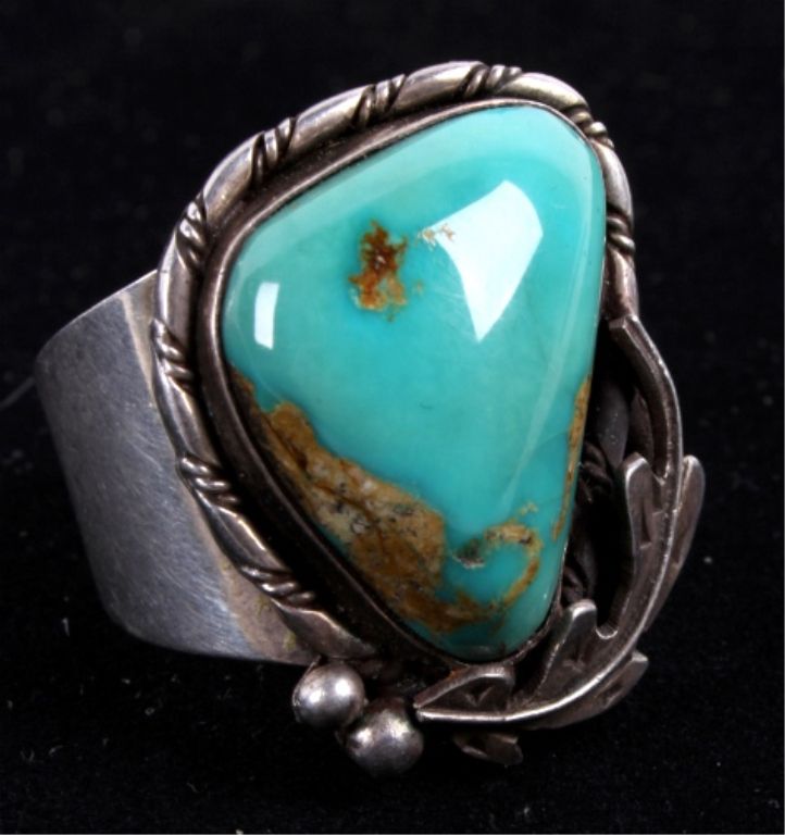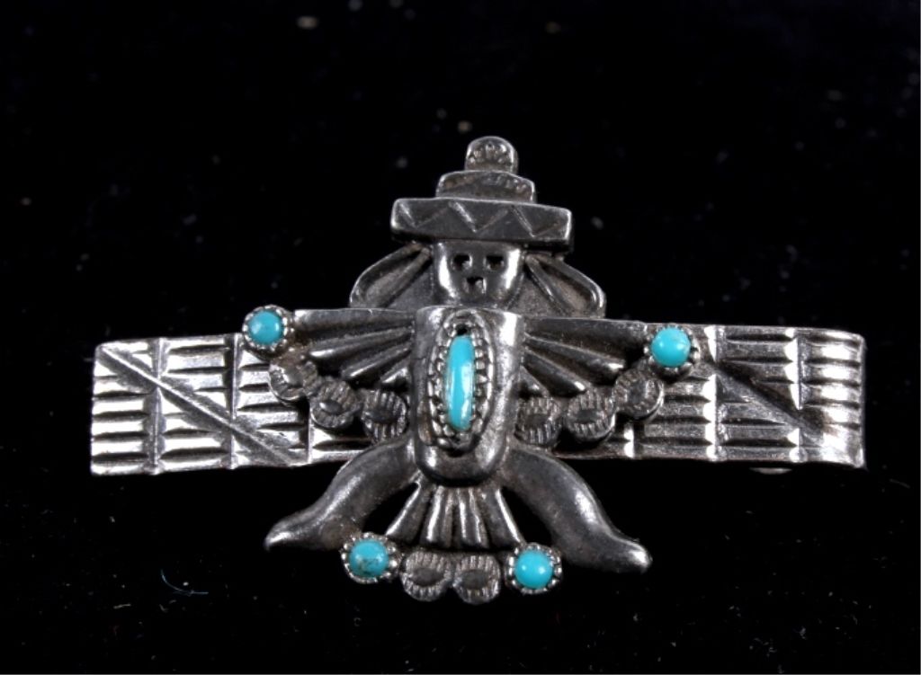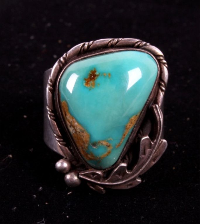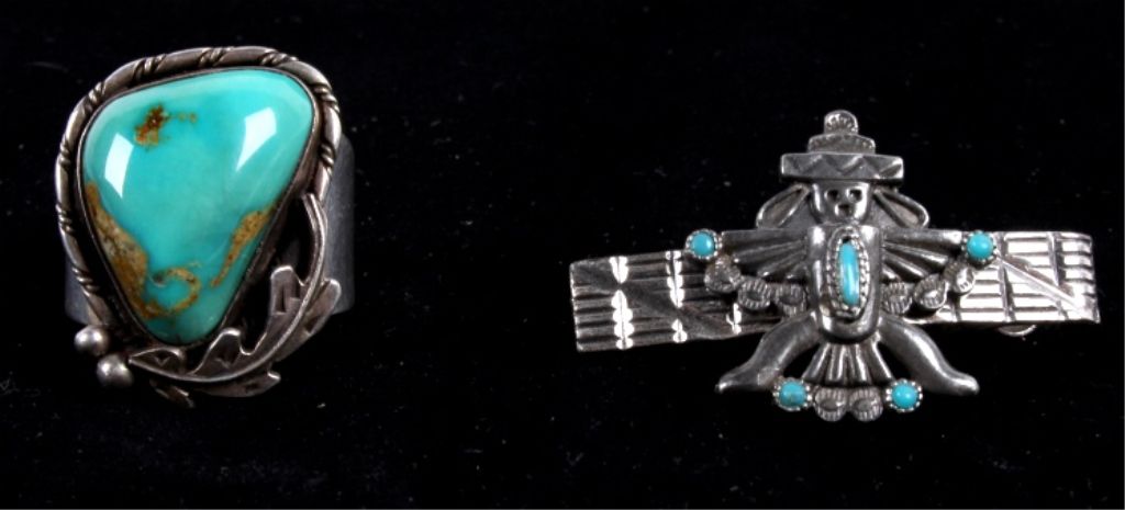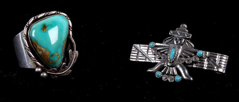 This lot includes a Navajo native American sterling silver and turquoise ring and tie clip. The ring has a gorgeous Navajo decorative feather around a turquoise stone. The tie clip is Navajo Native American withfive turquoise stone set in a decorative man. The ring measures 11.5-12.5 and the clip is an 1.5" across.