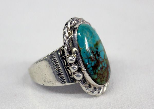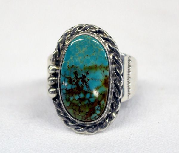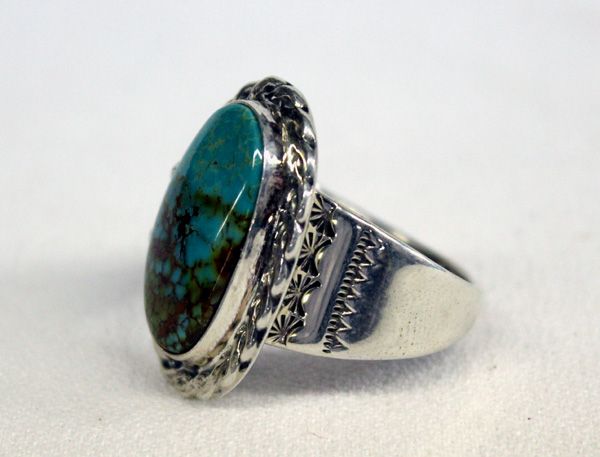 Navajo Sterling Silver Turquoise Ring. This wonderful ring is a size 11. Top measures approx. 1 1/8''L x 3/4''W. Hallmarked TG.