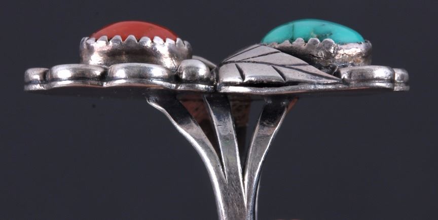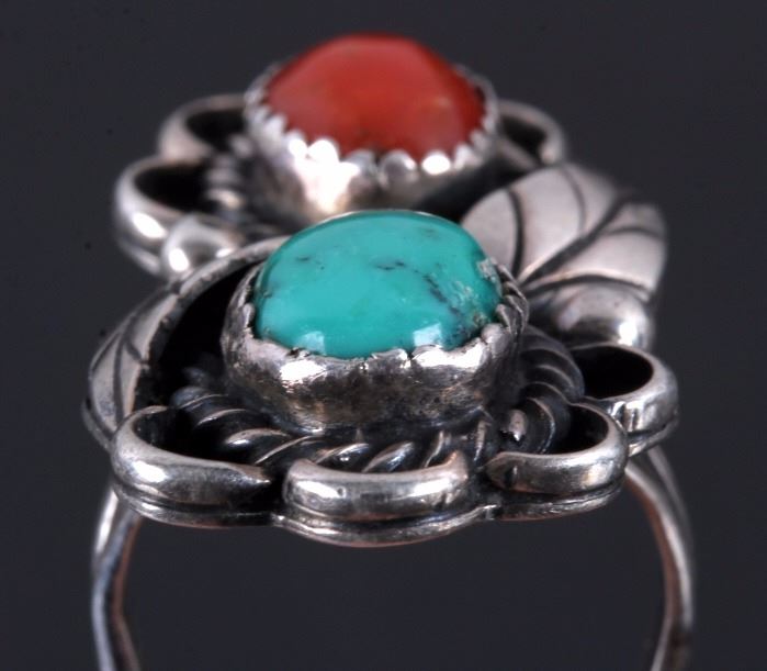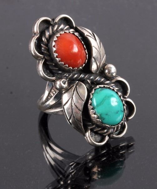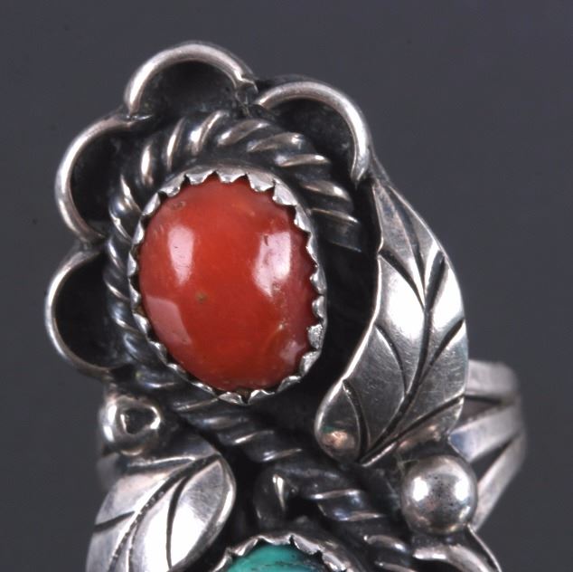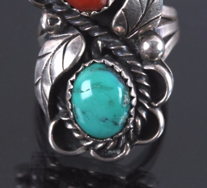 This is a Navajo sterling silver and turquoise ring. The ring features beautiful turquoise and coral cabochons set in sterling silver with feather and rope accents. The ring is in good condition. It is size 6.