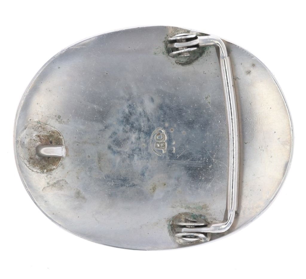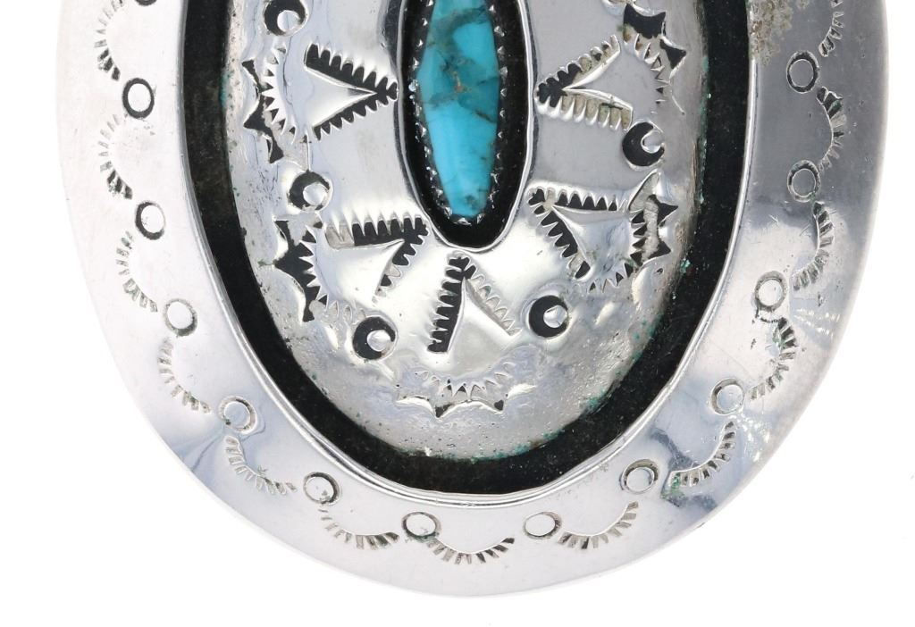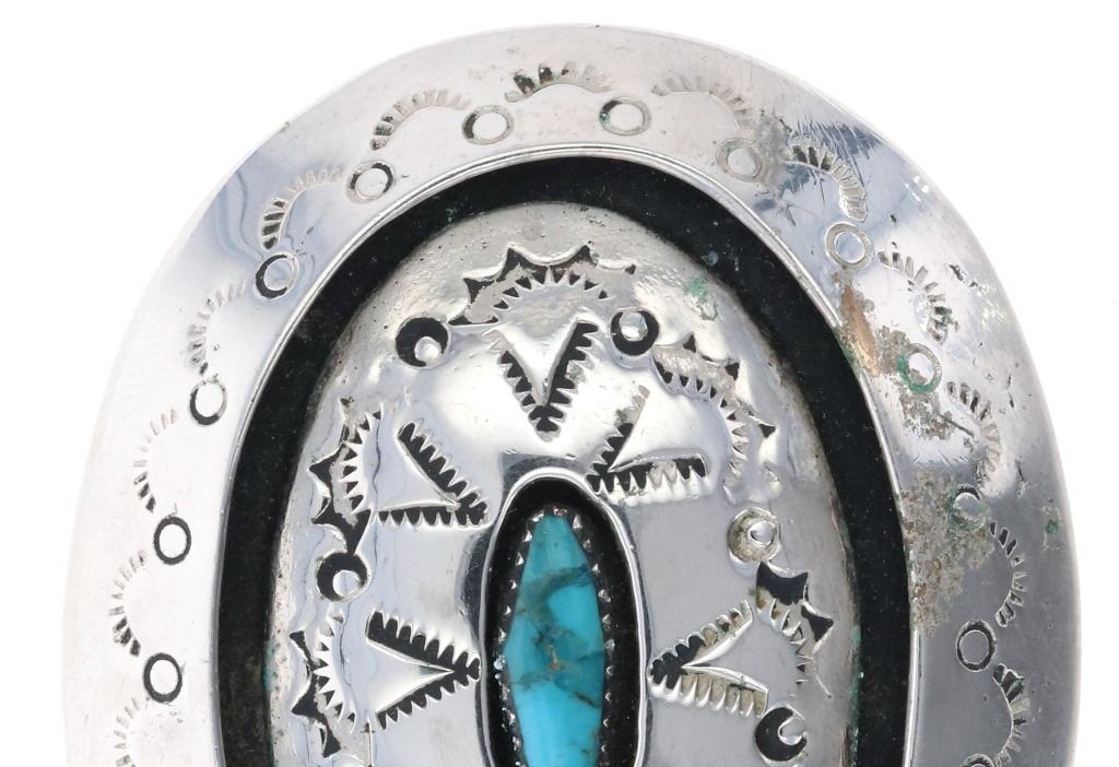 Featured in this lot is this Navajo sterling silver turquoise shadowbox buckle. The buckle features a wonderfully and professionally crafted sterling silver construction that shows a shadowbox design and a tooled face and features a oval cut Kingman turquoise cabochon set into the center of the buckle and features light blue to dark blue luster and coloration. The buckle is marked with a 'BC' under an arch hallmark. The condition of this buckle is good with no obvious signs of damage and shows good overall condition. The measurements of this buckle are 2" x 2 1/2" x 1". The collective weight of this buckle is 41.7g.