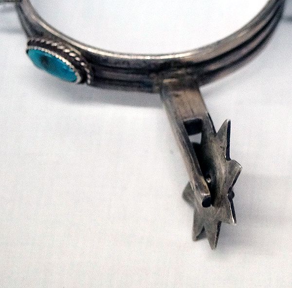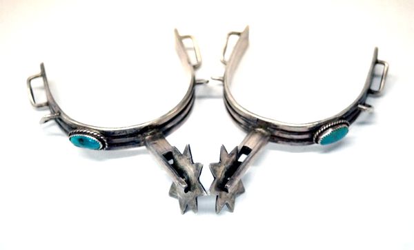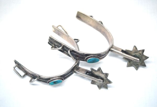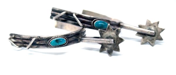 Navajo Sterling Silver & Turquoise Show Spurs 210g. Hand made solid sterling silver show spurs, 8 point star rowels, measuring 1 1/4''. Yoke or boot heel measurement is 3''. Nevada turquoise polished cabochons set on each side.
