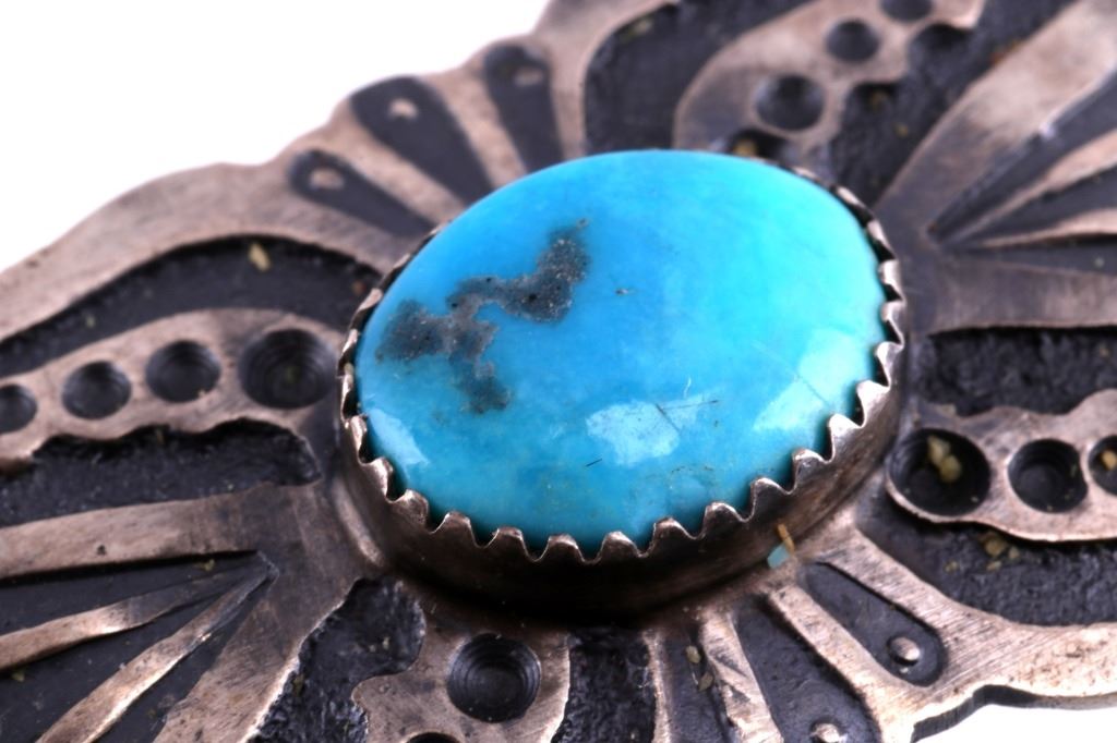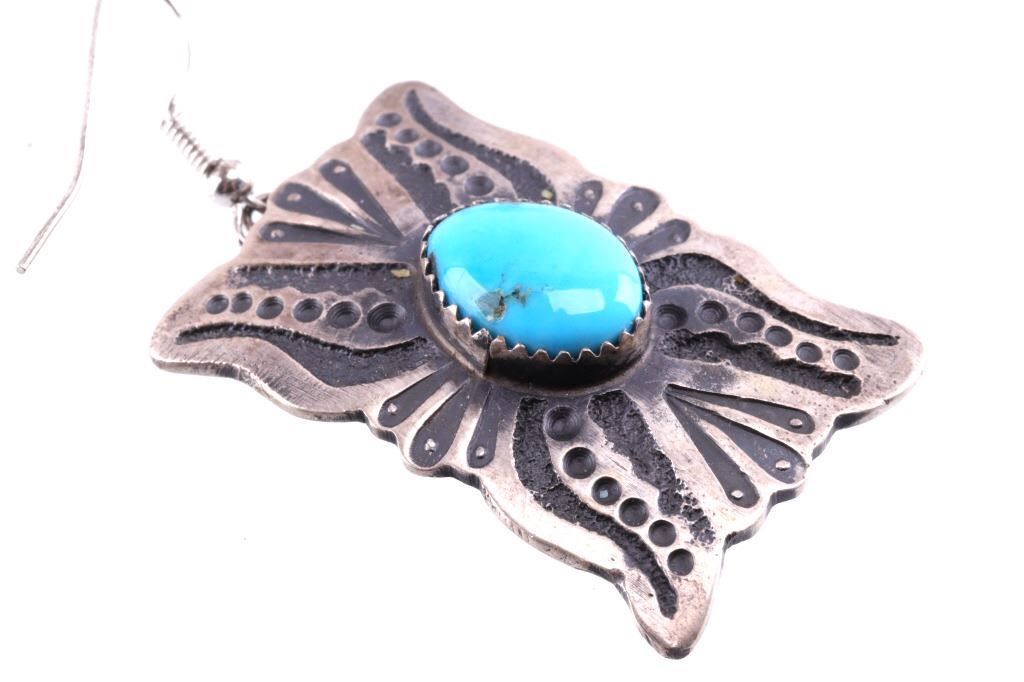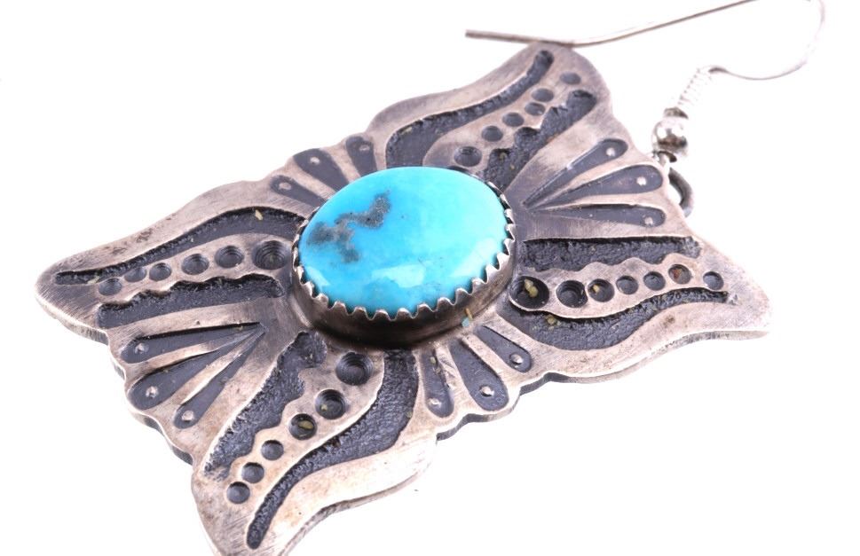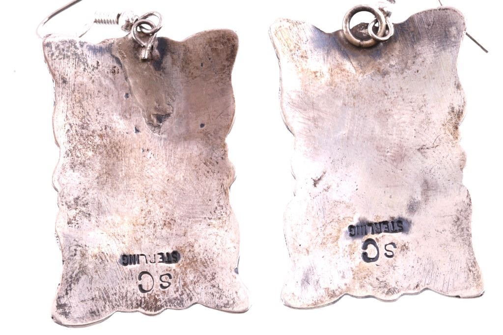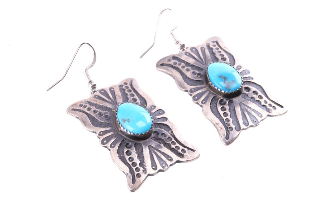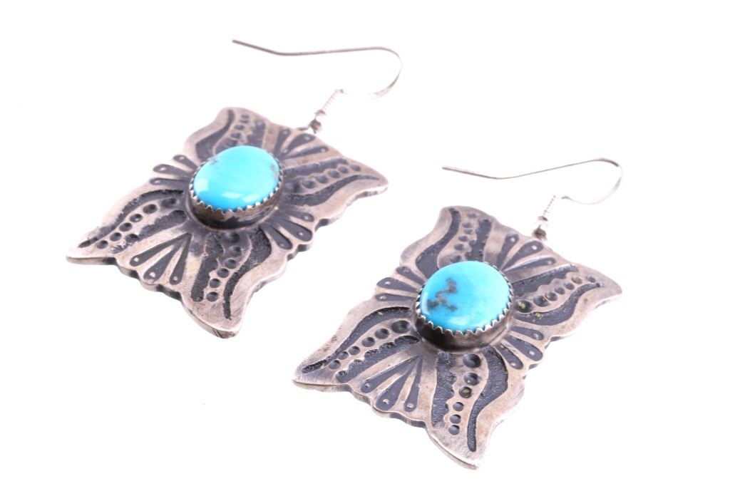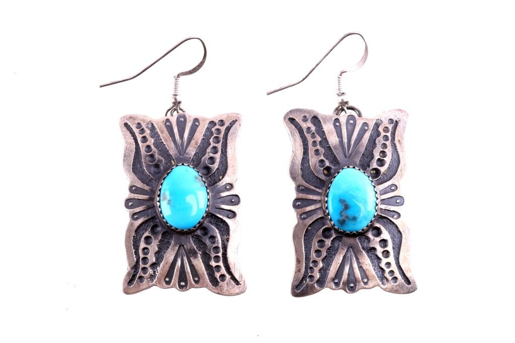 Featured in this lot is a pair of Navajo Native American sterling silver and turquoise signed earrings. The earrings display thick sterling silver construction with tooled geometric vine designs across the face of the earrings. The center of each piece displays a cabochon of sleeping beauty turquoise. The earrings were hand crafted by Shawn Cayatino and are marked across the back with "S C Sterling". The earrings show good condition and a warm patina across the face. The earrings measure 2 1/4" long by 1" wide.