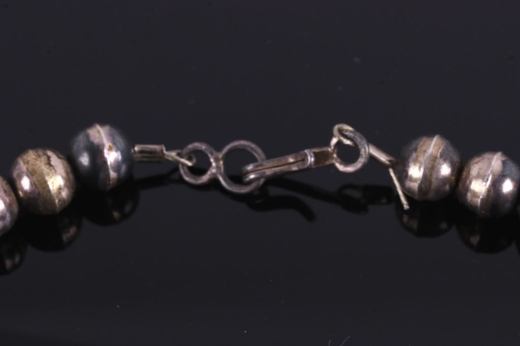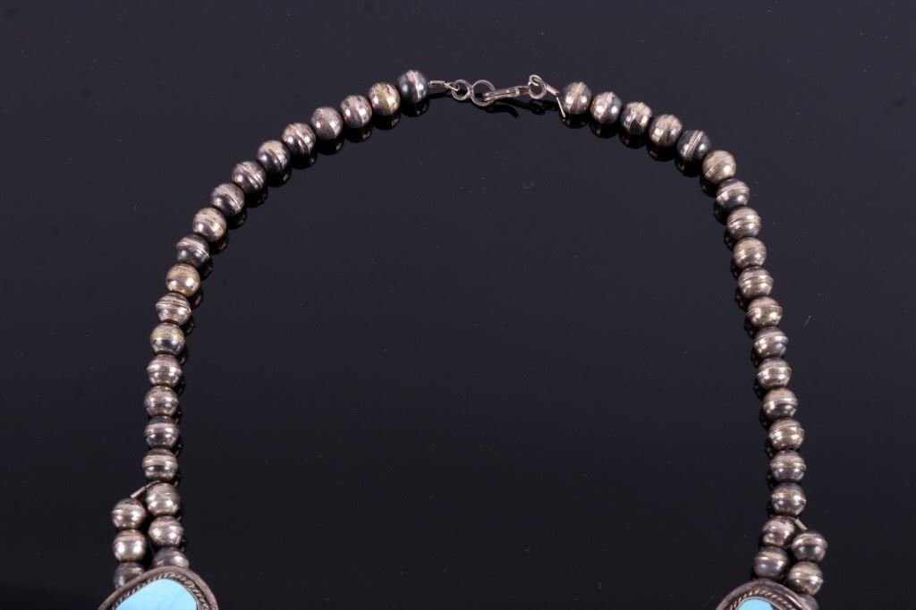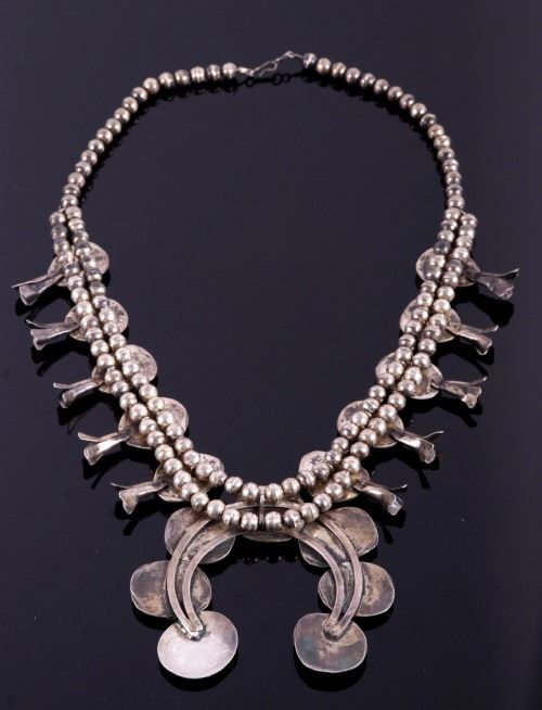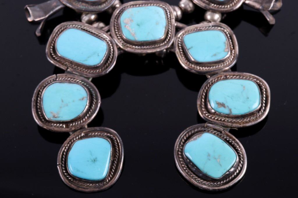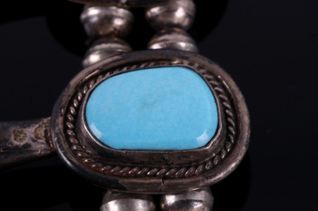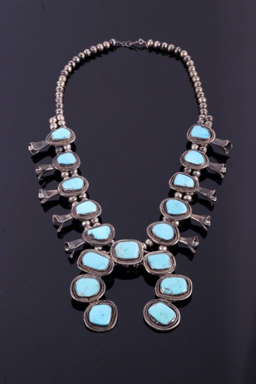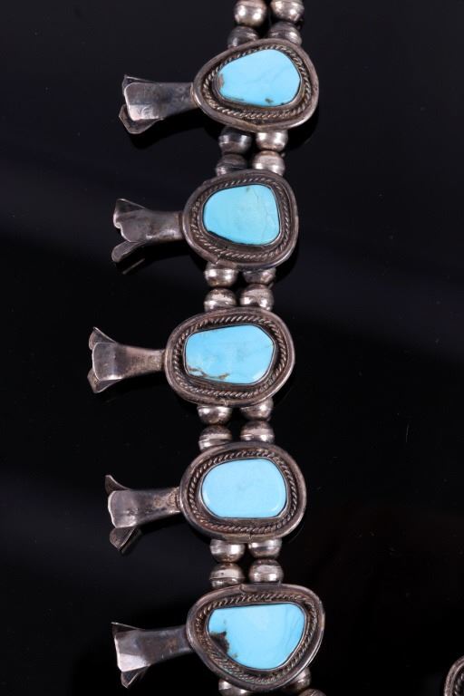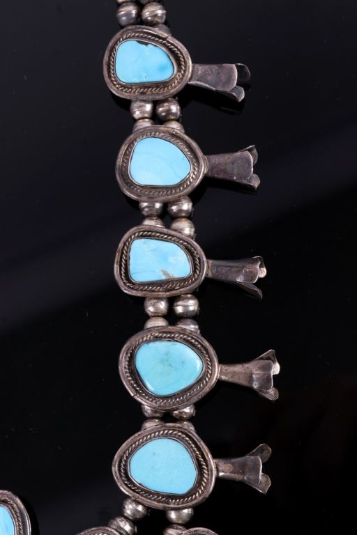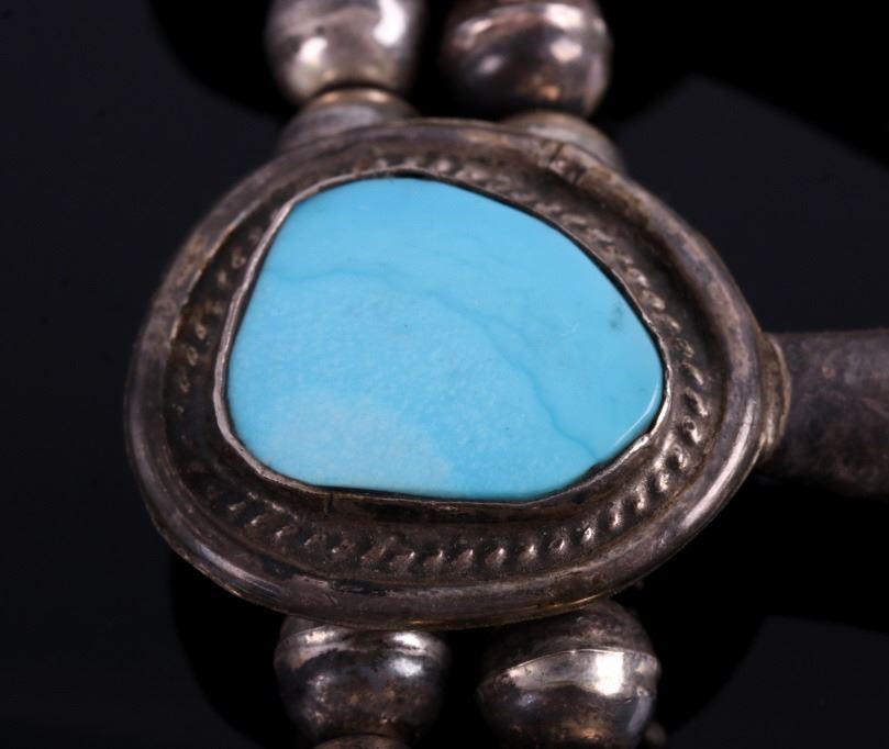 This is a Navajo Native American Indian sterling silver and turquoise squash blossom necklace. This Old Pawn Jewelry squash blossom features a beautiful naja flanked on either side by five blossoms. Each blossom is adorned with a gem quality polished turquoise nugget from the renowned Bisbee Turquoise Mine and each pendant is strung onto a sterling silver bead chain. The Navajo squash blossom necklace is in good condition. The piece shows dozens of round concho silver beads in a double strand. This necklace has an impressive style and early to mid 1900's age. The naja measures 4" x 3.25".