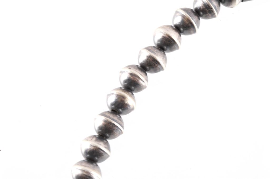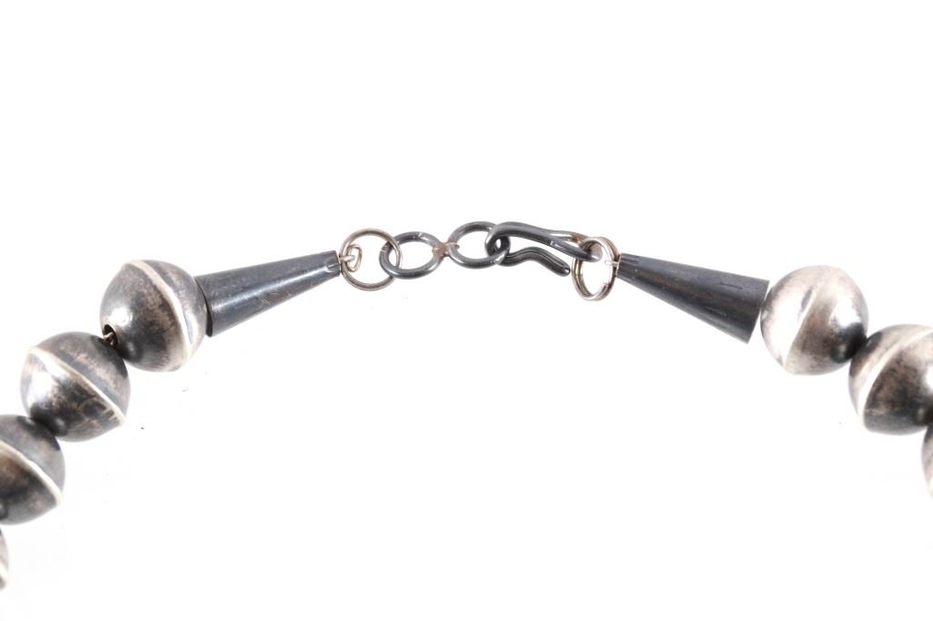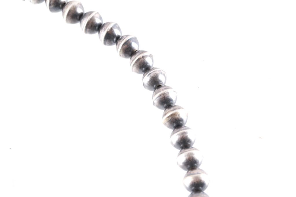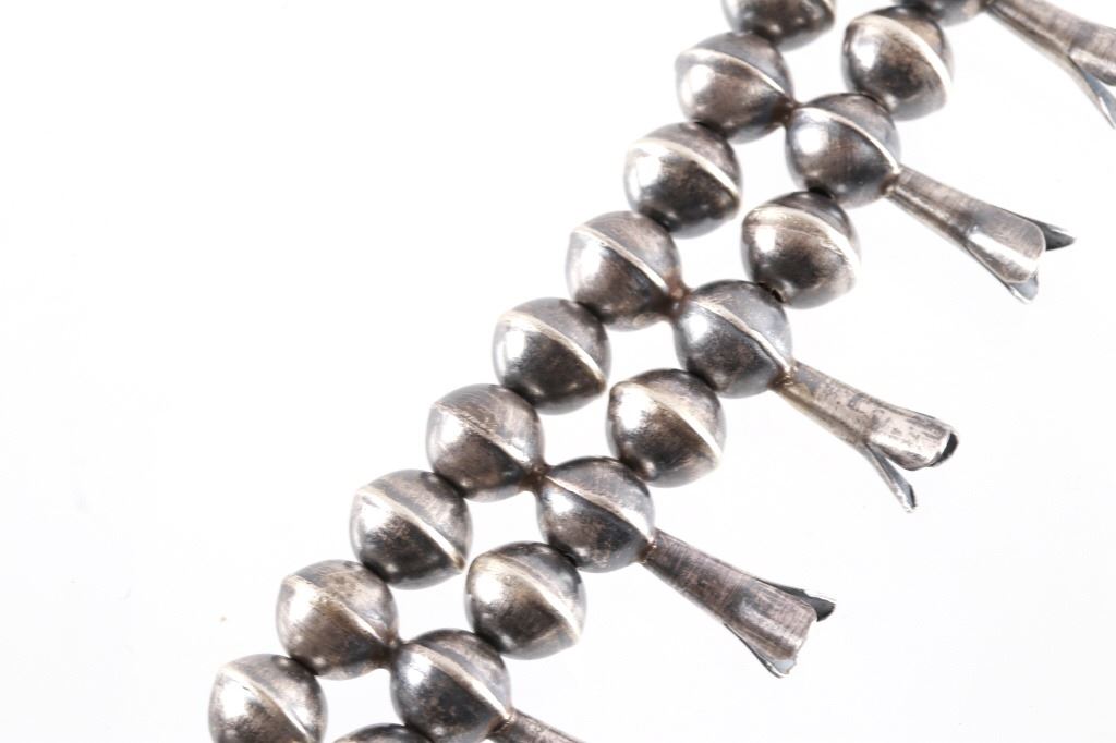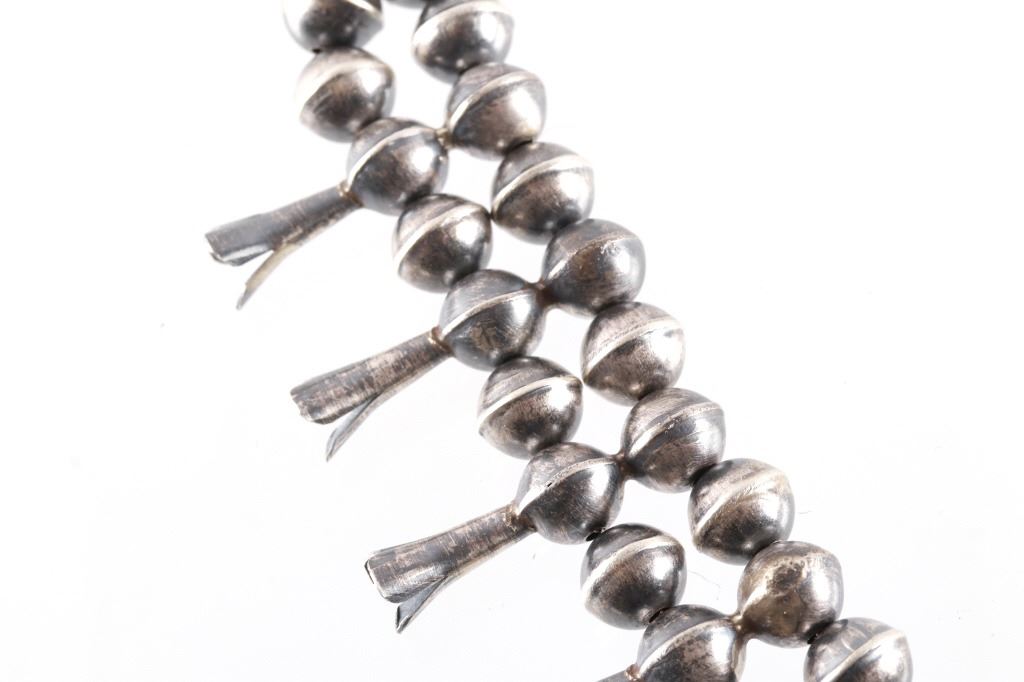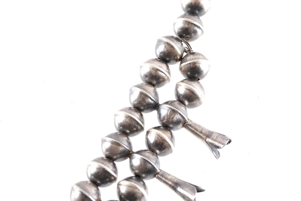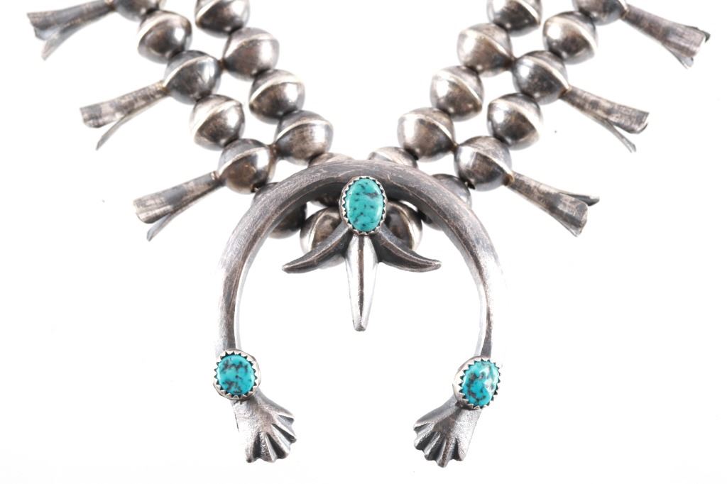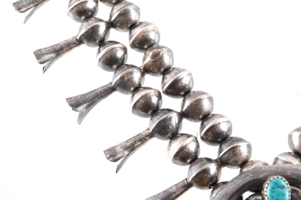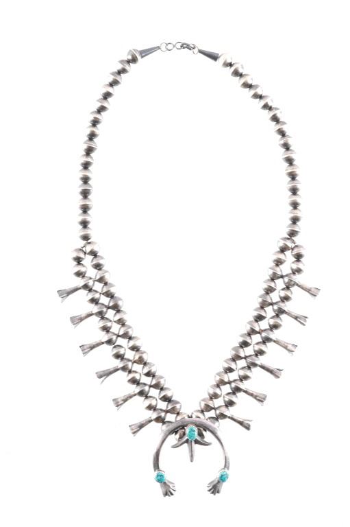 Featured in this lot is this Navajo sterling silver turquoise squash blossom necklace. The necklace features a wonderfully and professionally crafted sterling silver squash blossom with 12 total blossoms and a naga pendant with three oval cut Morenci turquoise cabochons set into the pendant. The artist’s hallmark can be seen on the backside of the naga pendant with a 'sterling' stamp. The condition of this necklace is good, with no obvious signs of damage. The measurements from clasp to clasp are 23" and the naga pendant measures 2" x 2".