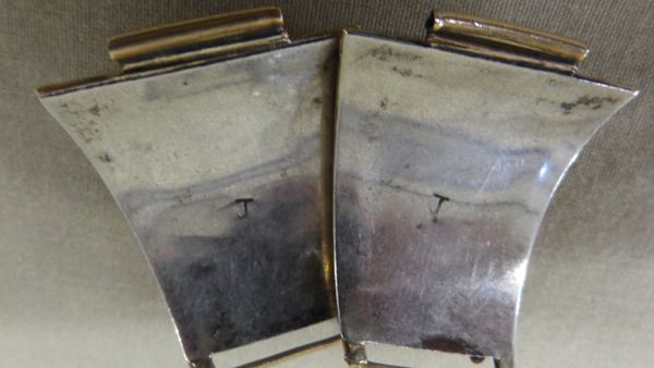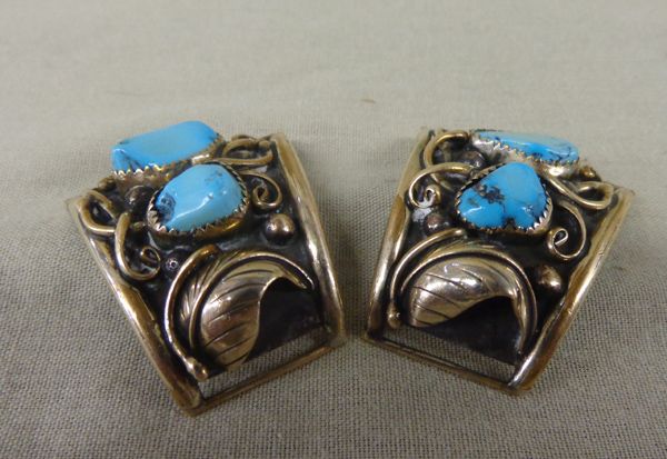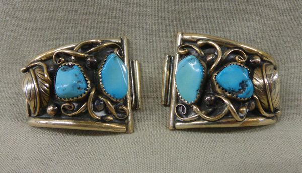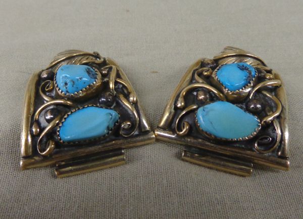 Navajo Watch Tips, Turquoise & Sterling.  Measures 2'' x 1 1/4''. Brushed gold wire work with two polished turquoise nuggets on each tip with traditional leaf design. Signed/stamped ''J''.
