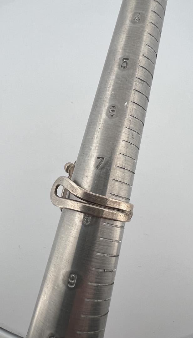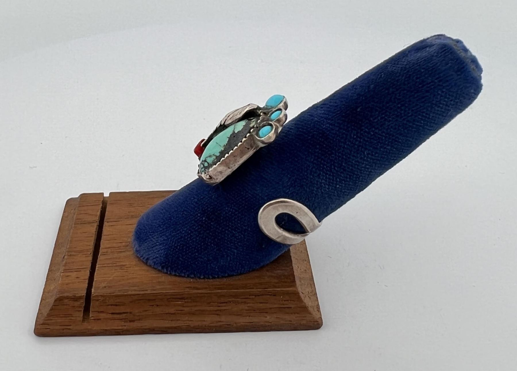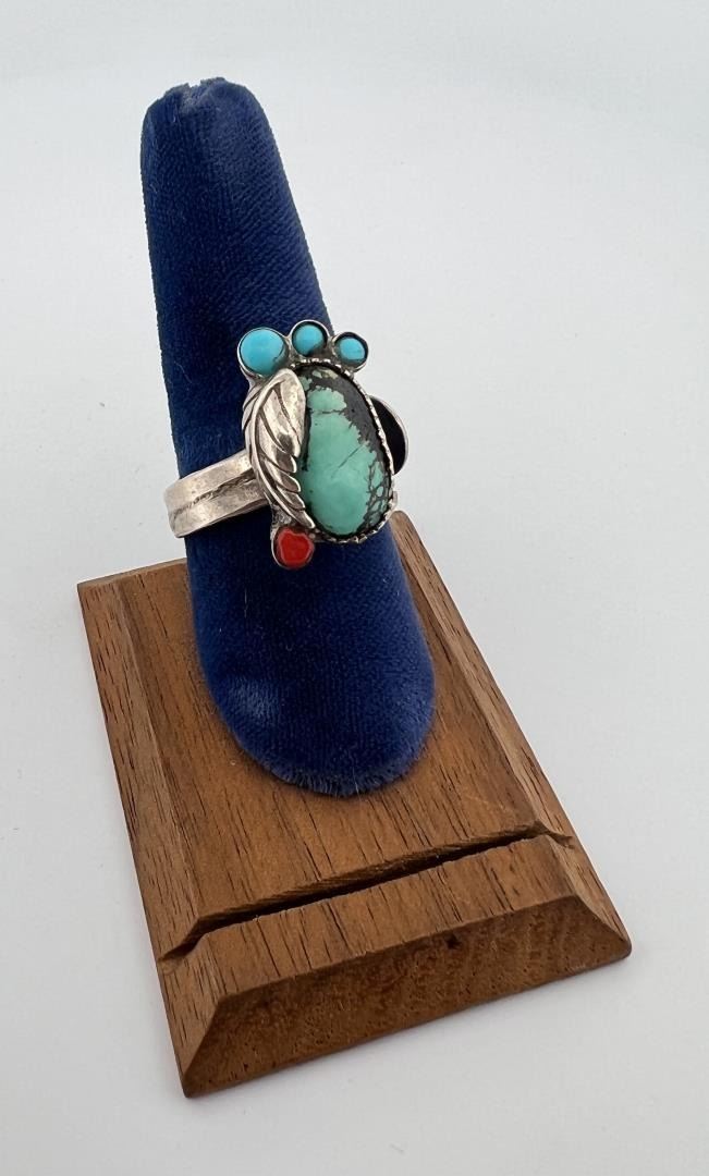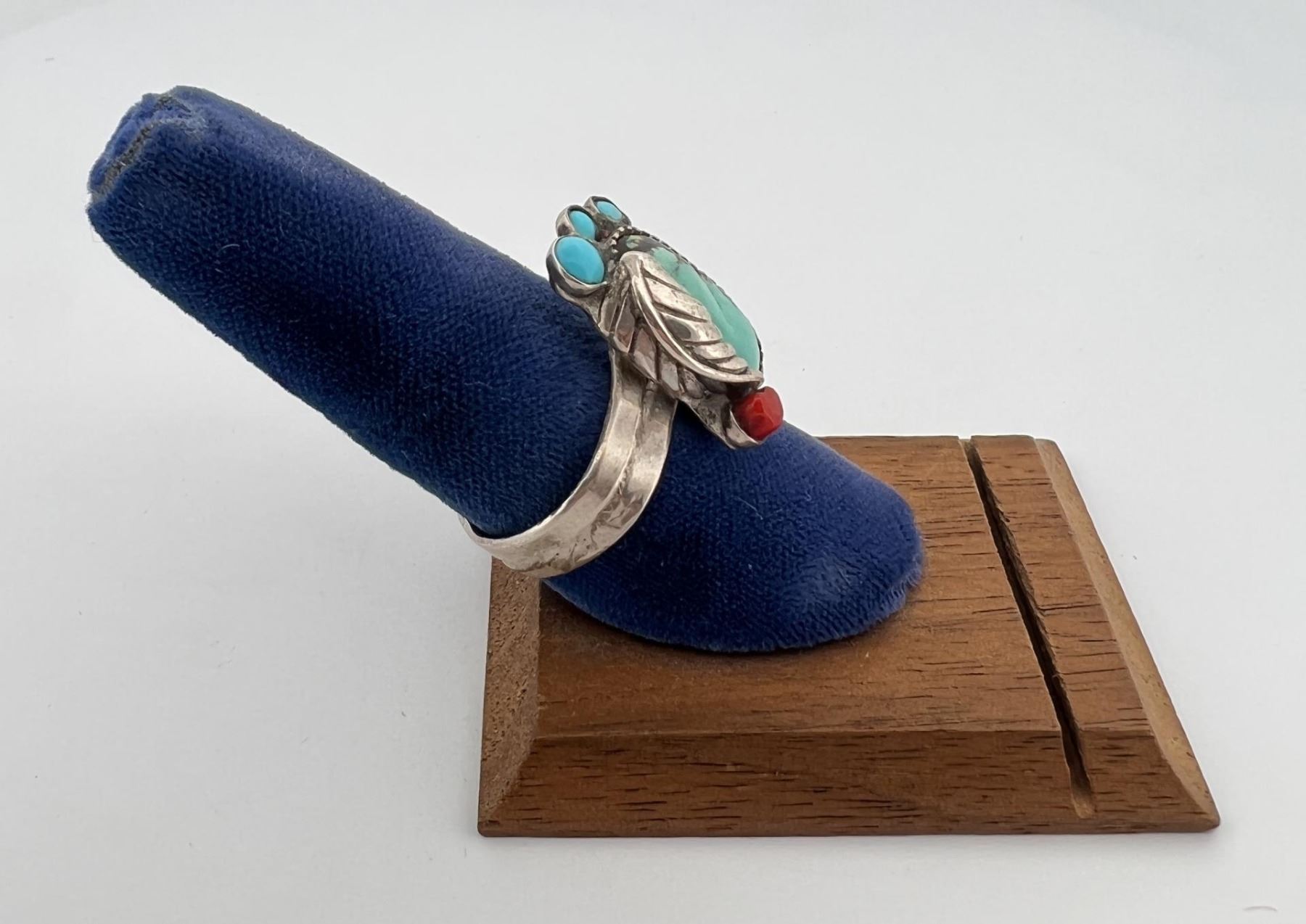 Nice setting design, with silver feather alongside a natural turquoise stone, offset by piece of contrasting coral. Band features open style, see photos. Size7 3/4