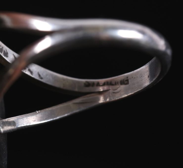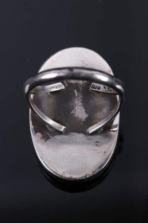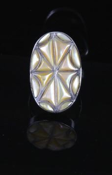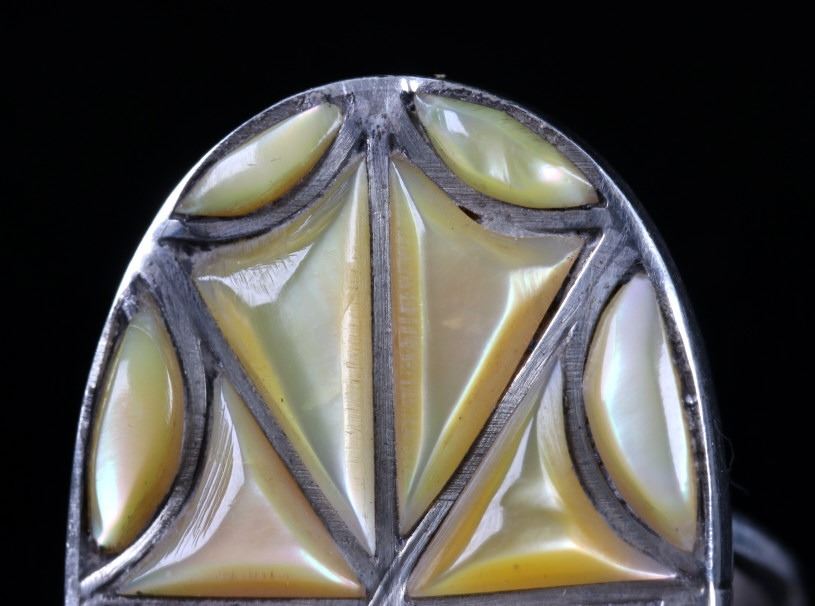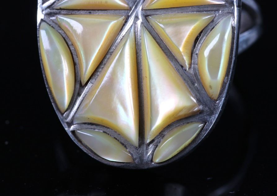 For your consideration is a sterling silver and mother of pearl ring. The mother of pearl is set within a simple marked sterling silver frame. Eight mother of pearl gemstones are set in a modest style with an additional eight stones circling the inner design. The buckle shows heavy sterling silver construction, done masterfully with a stained glass inlaid mosaic pattern. The mother of pearl pieces all have a rounded polished cabochon finish complimenting the mother of pearls iridescent reflection. Measures 1 1/8" x 3/4".