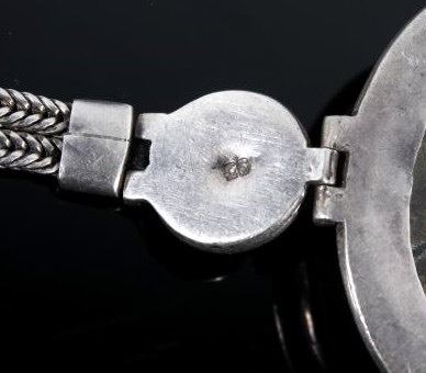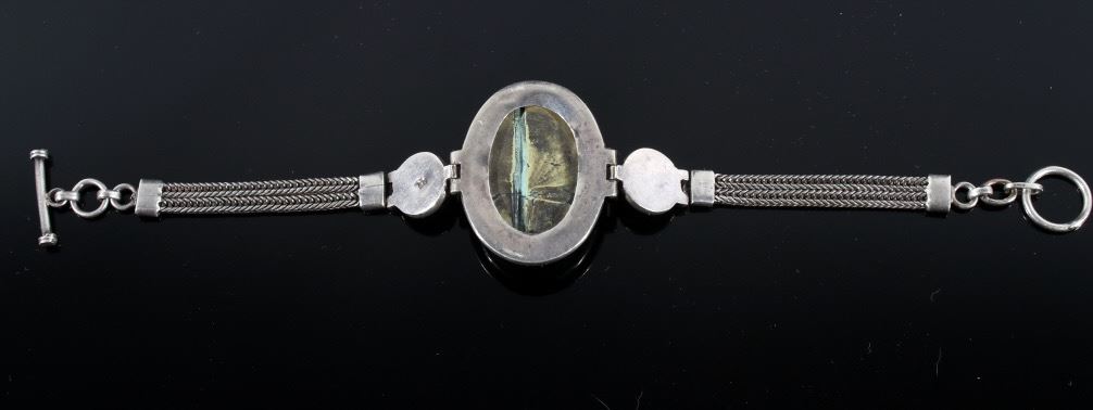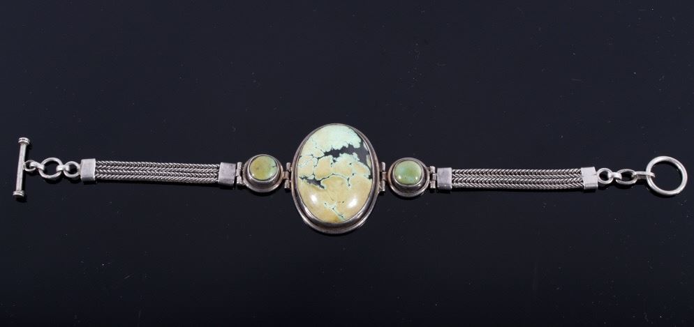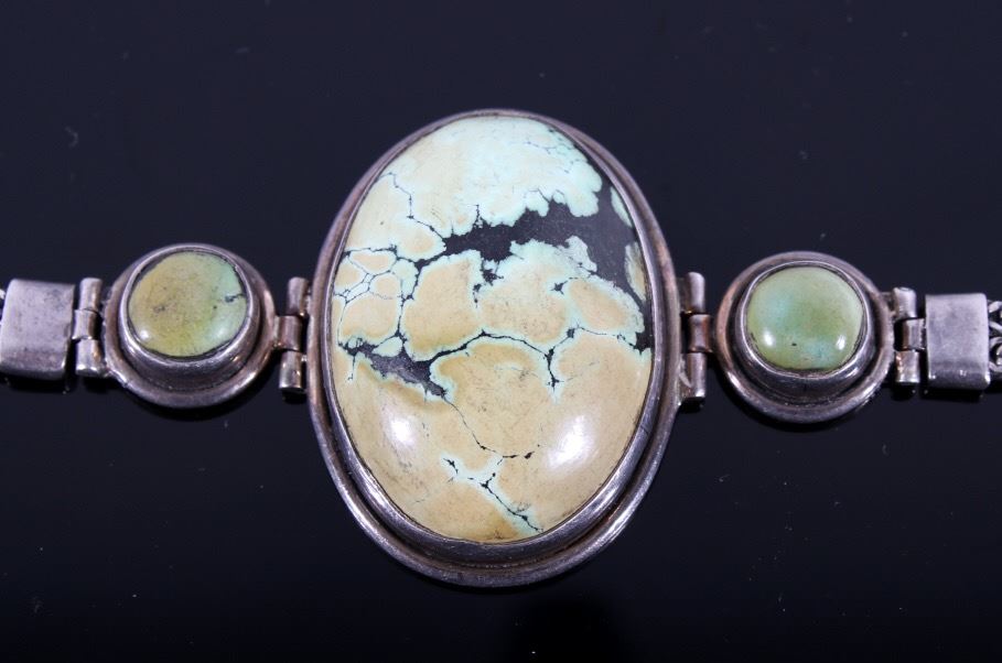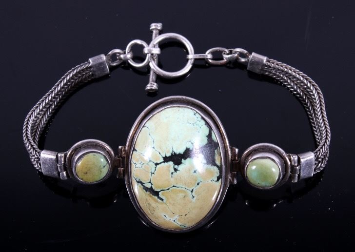 For your consideration in this lot we have a sterling silver and turquoise bracelet from the Navajo Native American Indians. The bracelet shows a large piece of Carico Lake turquoise with two smaller pieces set into the sides. The turquoise are set into sectional pieces of silver. The bracelet is attached with twin bands of silver chains on each sides. The back of the piece is marked "55" on the back of one of the smaller sections. The bracelet is in good condition overall with a dark patina. The bracelet measures 8 1/4" long by 1 1/2" wide.