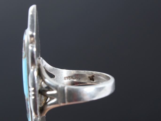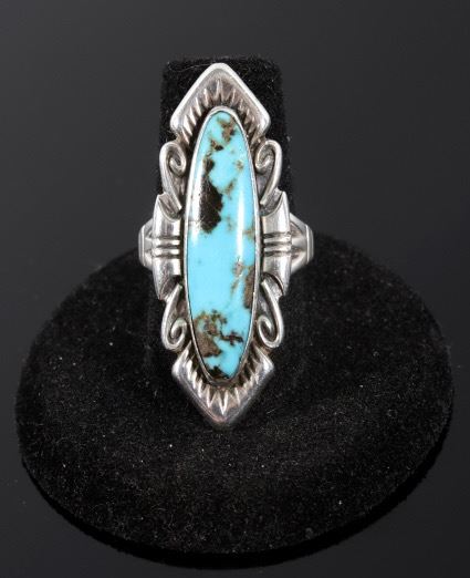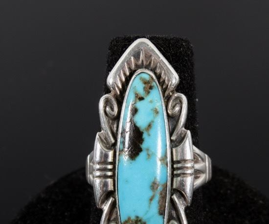 For your consideration in this lot we have a Navajo Native American sterling silver and turquoise cocktail ring. The ring shows a turquoise mountain cabochon set into the center of the ring. The cabochon is surrounded by patterned silver with ribbons of silver. The ring is marked "Sterling" with the symbol of the Bell Trading Post. The ring shows good condition overall with some spots of warm patina. The ring is fitted for a U.S. size 6 1/2 with the top measuring 1 5/8" long by 5/8" wide.