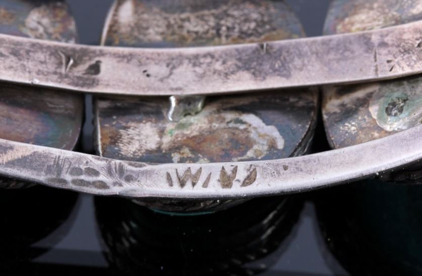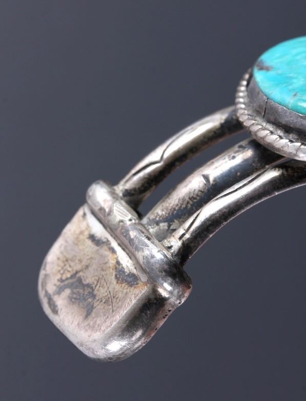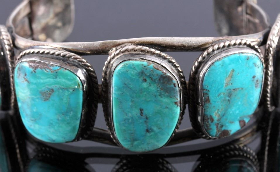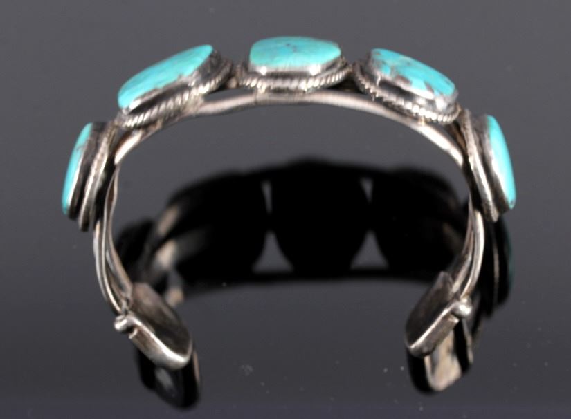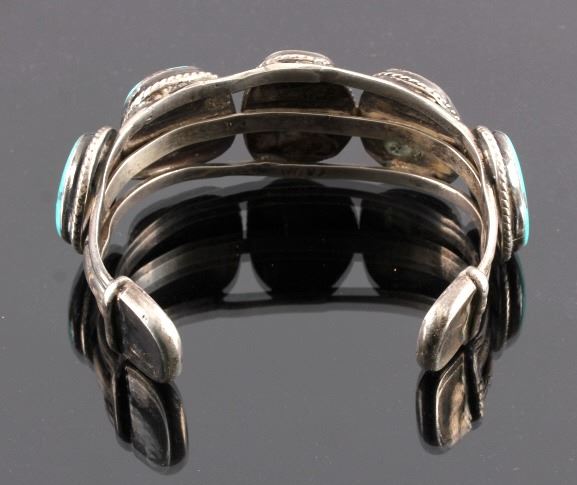 This is a Navajo Native American Indian sterling silver and turquoise cuff. The cuff is made from solid sterling silver with five large gem quality Turquoise Mountain cabochons. Each stone is set in a bezel with a twisted rope border. The back of the cuff has been signed as shown. The Navajo cuff is in good condition. It measures 2.25" x 3.25" and is 1.25" wide.