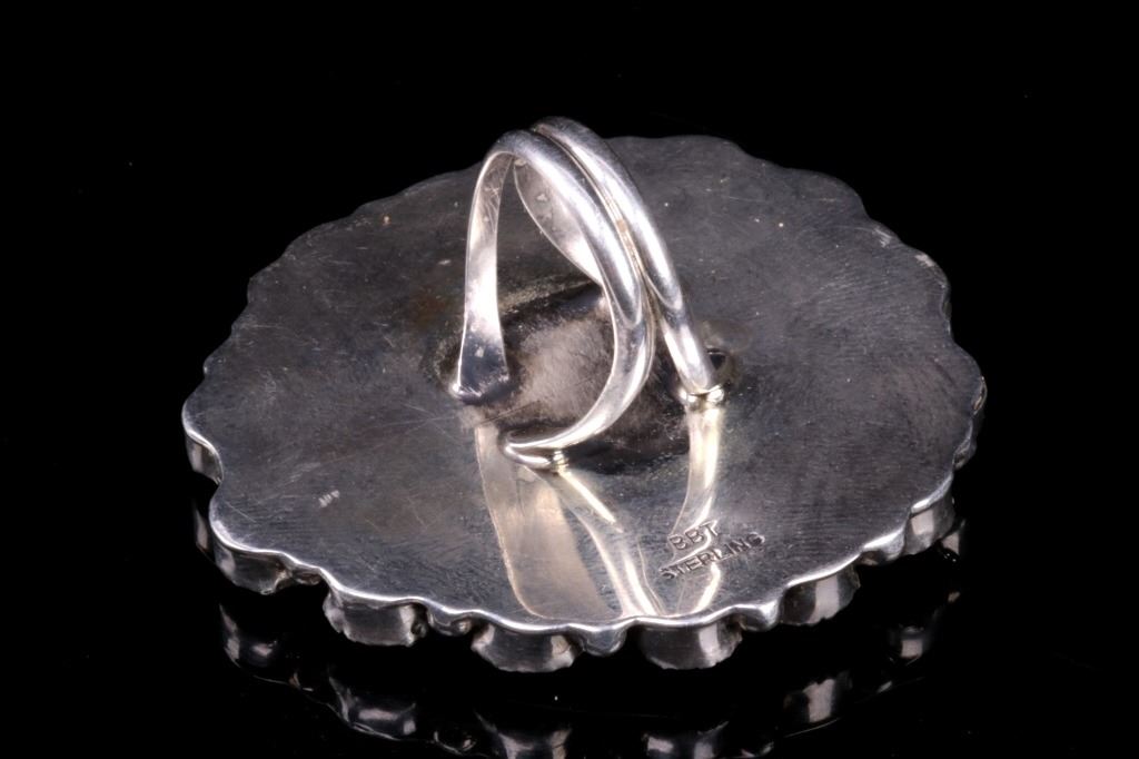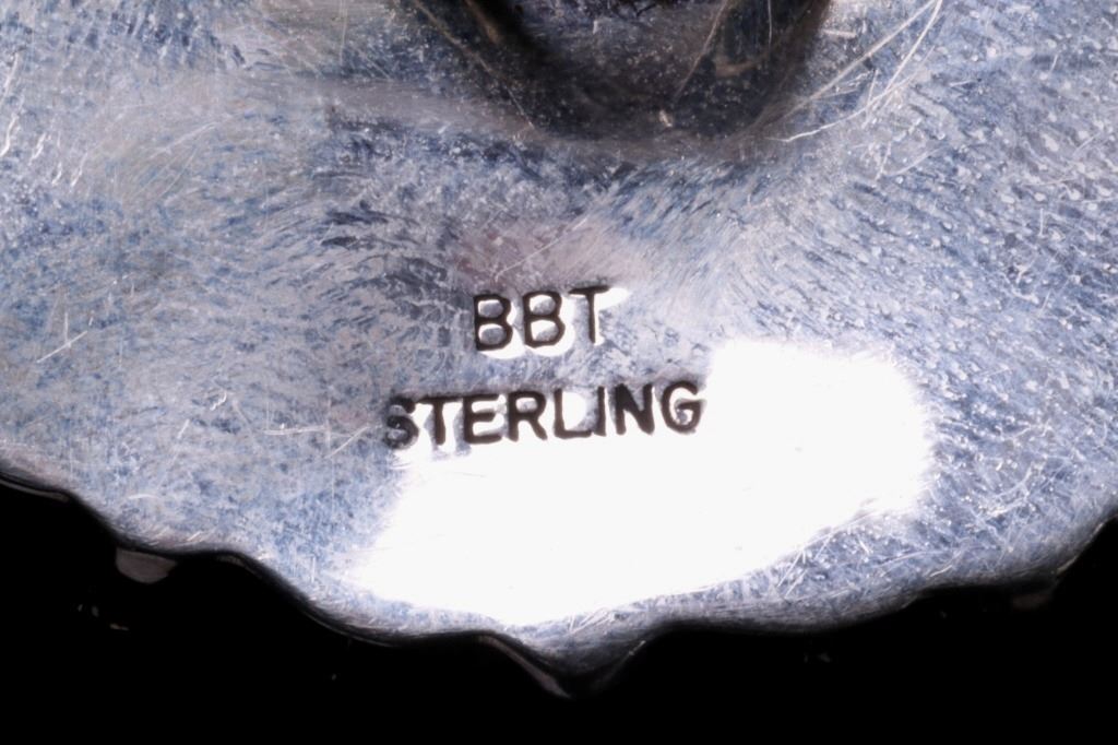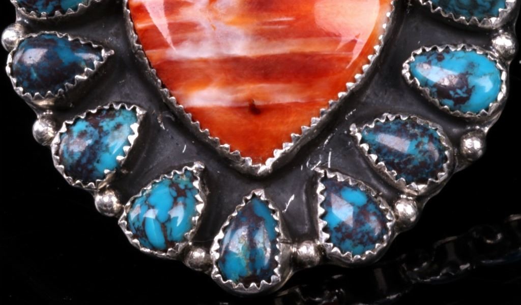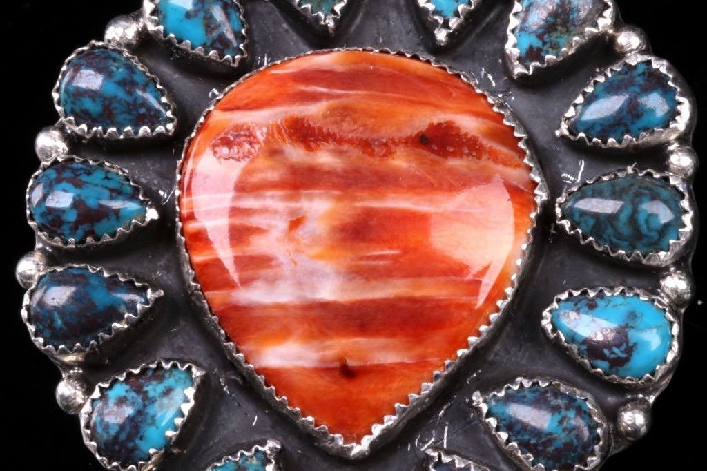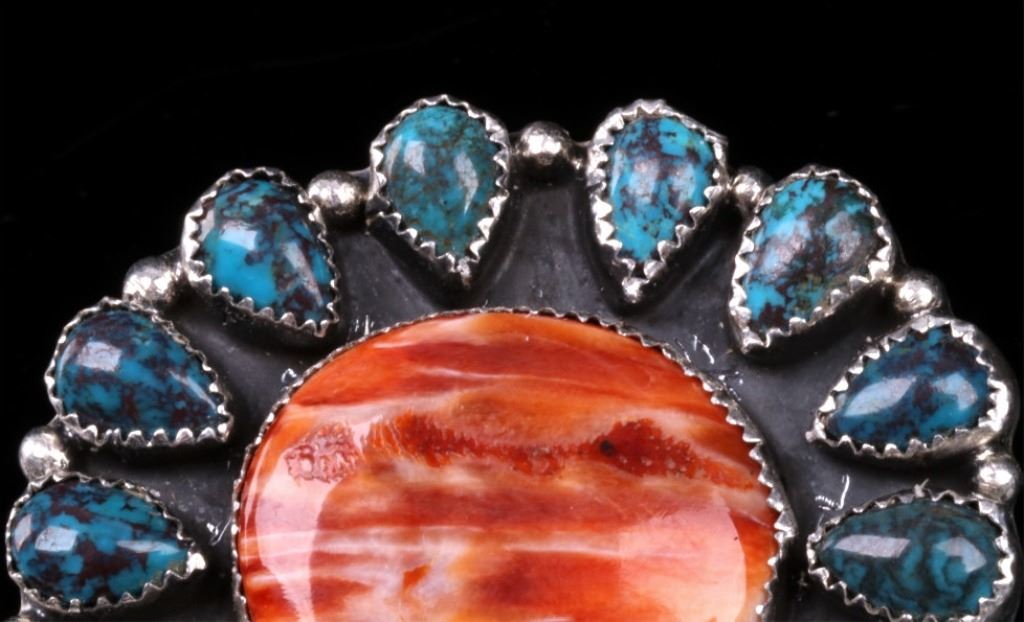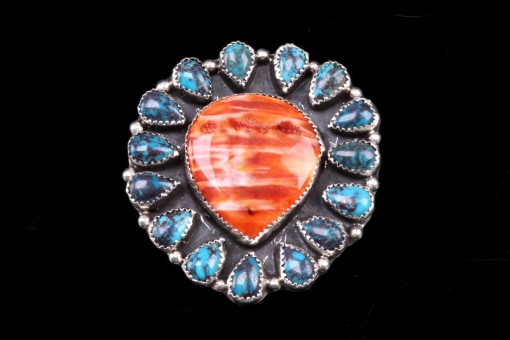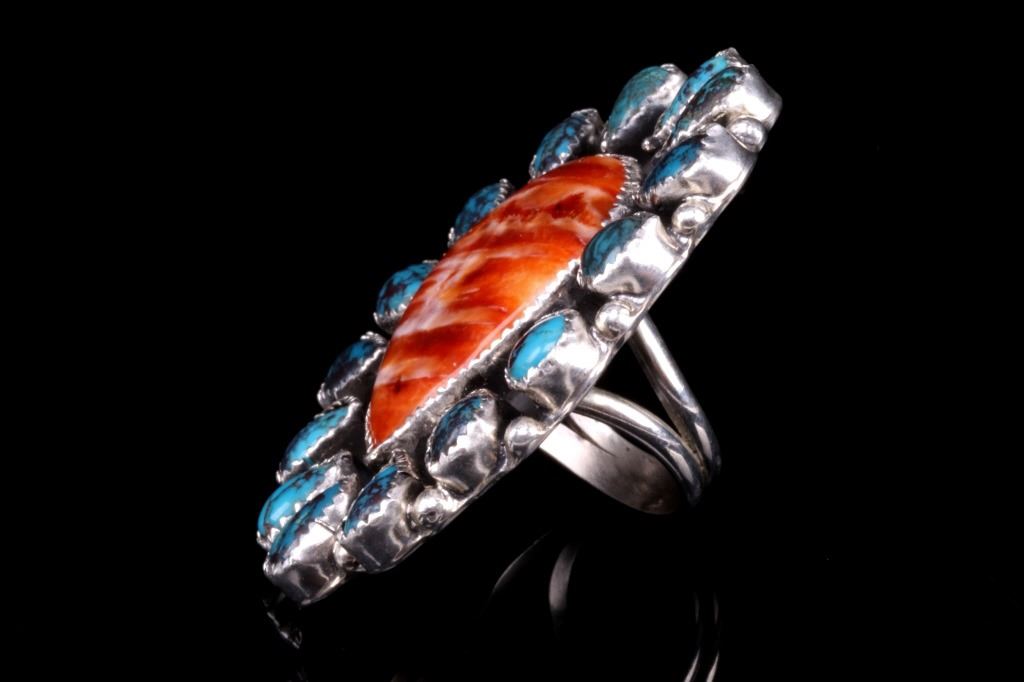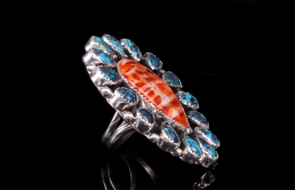 Featured in this lot is this sterling silver, Bisbee turquoise and carnelian ring from Navajo artist, Bernadine Begay Tsosie. The ring shows a fantastic sterling silver split shoulder band with a unique silver setting and a semi shadowbox design between stones. There are 15 total pear cut Bisbee turquoise cabochons set into the border of the ring with an extremely large, modified pear shaped Carnelian cabochon set to the center of the stone. The condition of this ring is good, with no obvious signs of damage. The measurements of this ring are 1" x 2 1/4". The ring size is US 9 1/4. The weight of this ring is 36.8g.