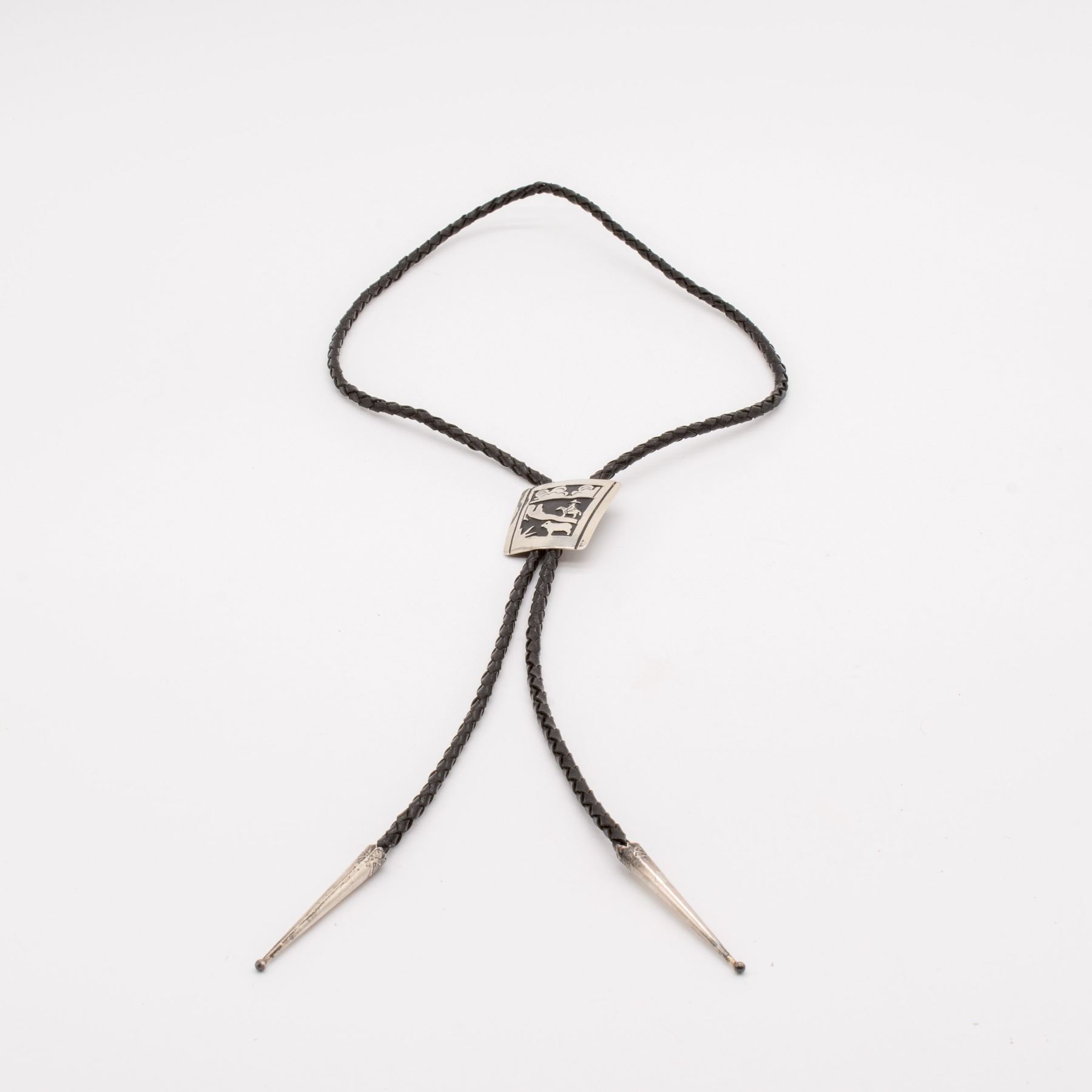 Native American Navajo Sterling Storyteller Bolo Tie by Tom Billy, slide measures 1'' x 1.5'' and is stamped sterling and hallmarked T. Billy, sterling aglets