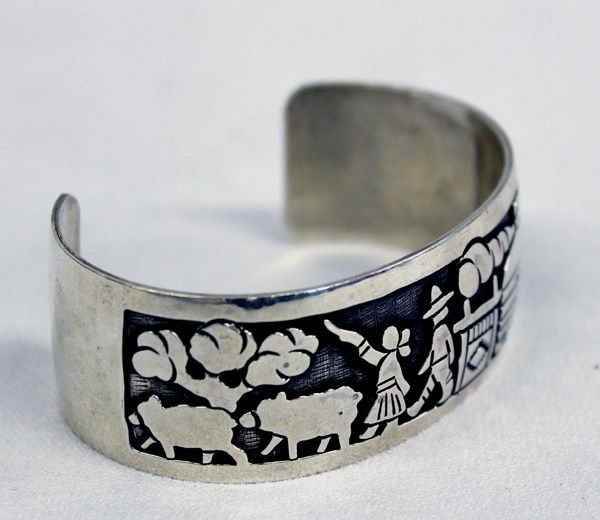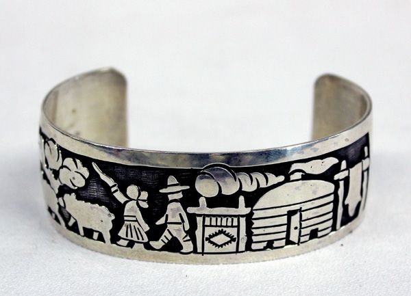 Navajo Sterling Storyteller Bracelet hallmarked VR and stamped sterling, shadowbox style background featuring Navajo family, beautifully carved piece, inside measures 7.5in. X 1in.