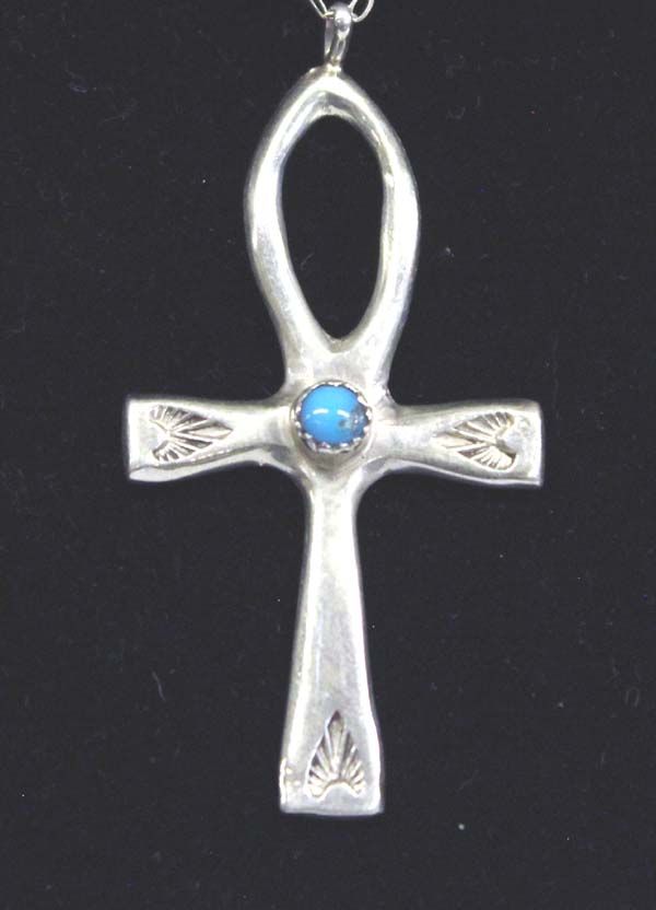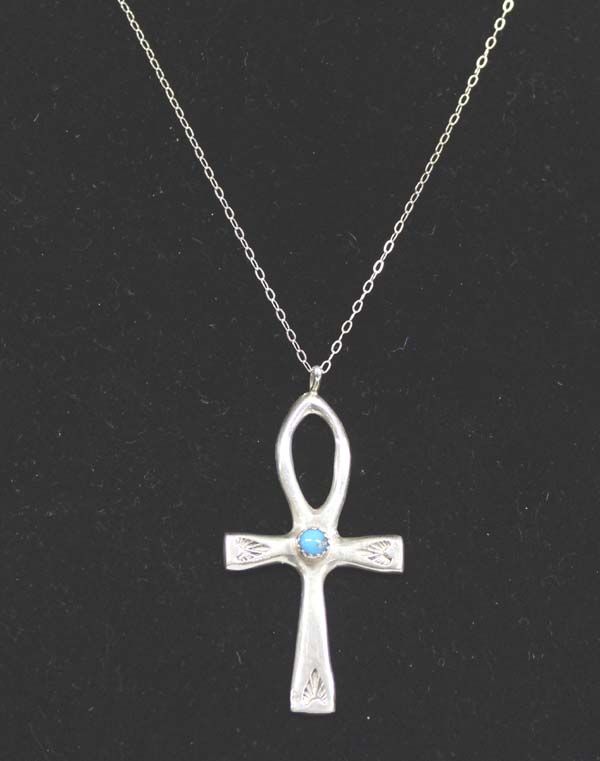 Navajo Sterling Turquoise Ankh (also known as the key of life) Cross Necklace, chain measures 36.5'' end to end, cross measures 2.25''L x 1 1/8''W, 5.47g in total wt., features small turquoise cab measuring 1/8''D, hand stamped accents