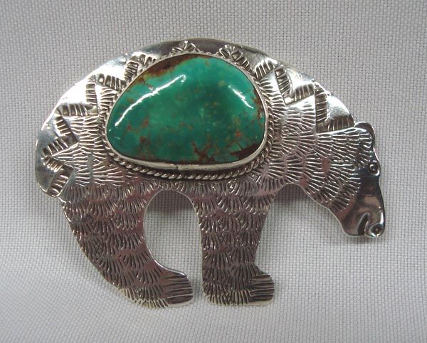 Native American Navajo Sterling Turquoise Bear Pin/Pendant - AJC. Large bear with blue-green turquoise cabochon. Stamped on the back ''AJC'' for Albert and Jeanette Cleveland and also stamped ''sterling.'' Bear measures 2-3/4''Lx2-1/8''W. The stone is 1-1/8''x0.75''.