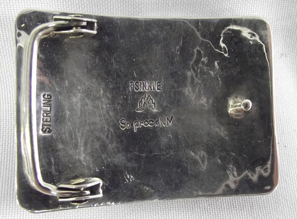 Navajo Sterling Kingman Turquoise Belt Buckle -- Orville Tsinnie, measures 2.5'' x 1.75'', features 9 large cabochons accented with various sized silver beadwork, nice weight, stamped on back is ''Tsinnie Shiprock, NM, Sterling'', Orville Tsinnie is a master Navajo silversmith who has been making jewelry since the 1970s and has won numerous awards, including a Lifetime Achievement award from the Indian Arts and Crafts Association (IACA), an honor that brings well-deserved recognition to this fine American Indian artist. Orville is a perfectionist, hand picking and polishing only the highest quality natural stones. The level of craftsmanship in Orville's work is superior. His designs are flawlessly executed, his soldering technique very clean, and his finishing and polishing meticulous. This careful attention to detail sets Orville's jewelry apart from many others, and reveals the pride he takes in his work. A steady presence in the world of American Indian art for over twenty-five years, Orville Tsinnie's work is distinctive and stylish.