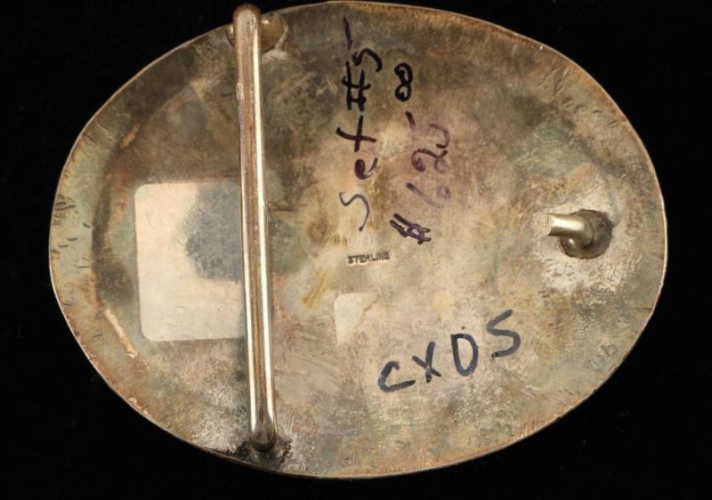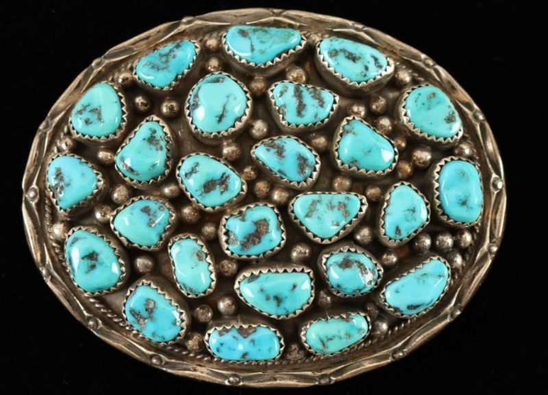 Oval of silver with a cluster of 25 turquoise stones with silver beads. Edges have a molded scallop design. Measures 2 3/4" x 2 1/4" Marked 'Sterling'.