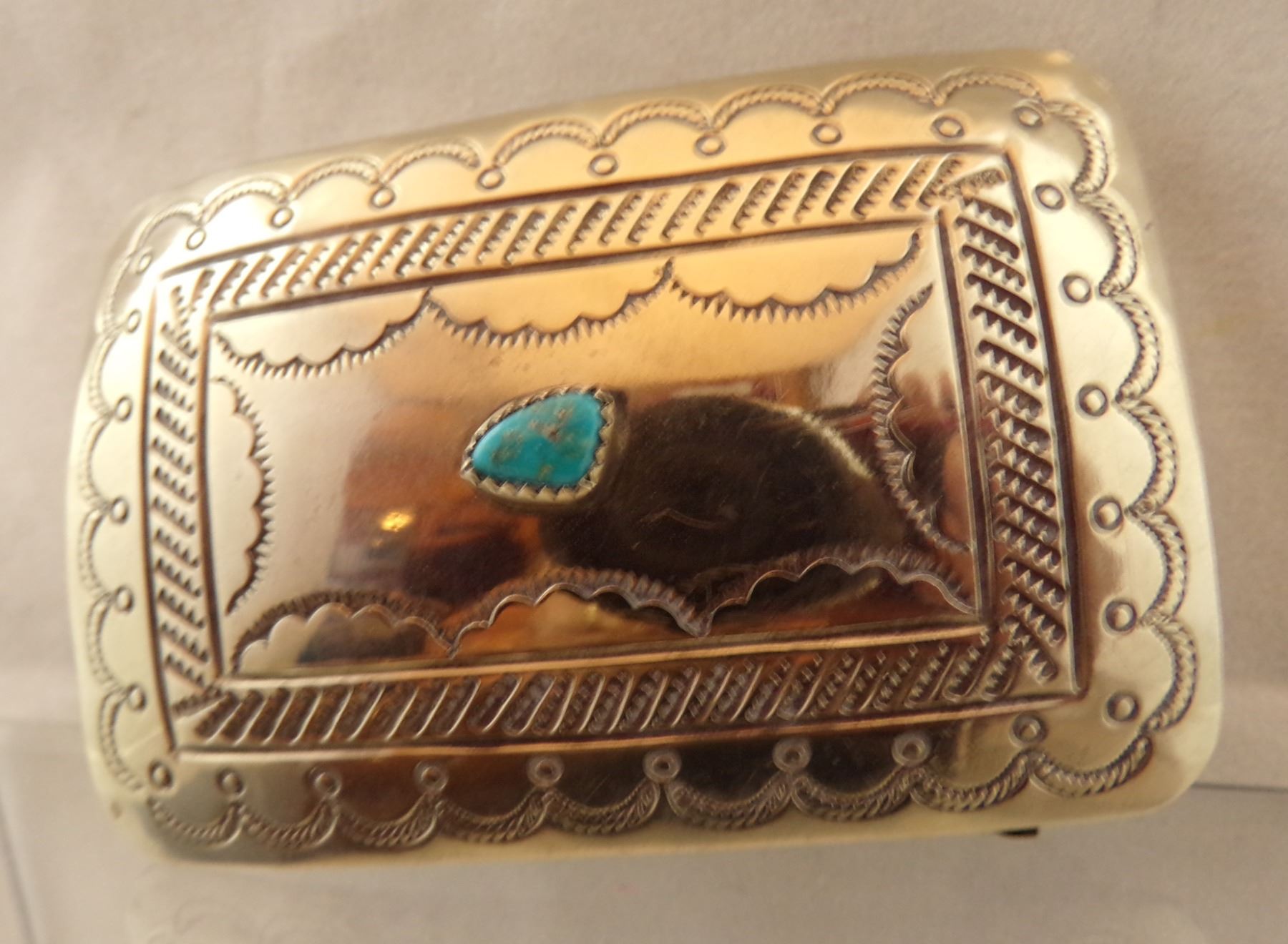 Native American Navajo Sterling Turquoise Belt Buckle, measures 2.25'' x 3''