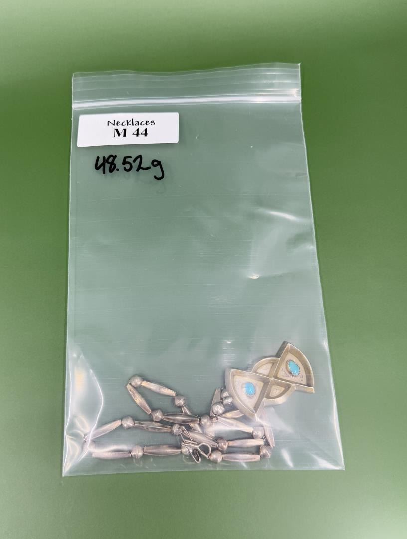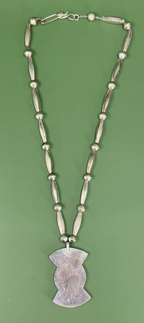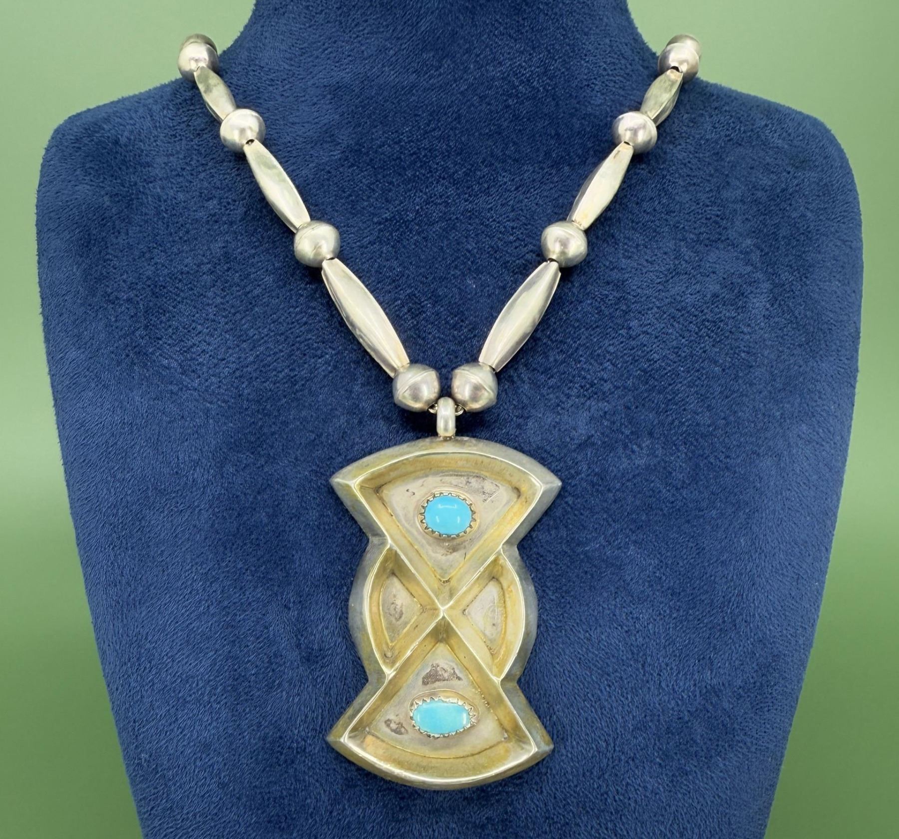 Bench beads, with Tufa Sandcast pendant set with turquoise. 11 3/4" long. 48.52 grams.