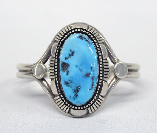 Native American Navajo Sterling Turquoise Bracelet--Delbert Vandever, gorgeous robin blue oval cabochon with brown and silvery matrix, shadowbox style, silver accents encompassing cabochon, 2 wire, signed on back ''Sterling'' and Delbert Vandever, inside measures 7'' x 2''W, stunning piece for your collection