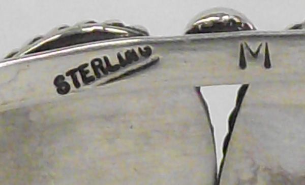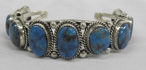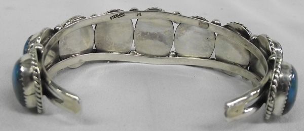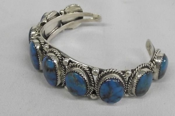 Navajo Sterling Turquoise Bracelet - Janet Mariano. Bracelet measures 7.25'' including opening x 1''W. There are 9 beautiful Mountain Turquoise Cabochons surrounding this sterling silver bracelet. Bracelet weighs approximately. 1.72 ounce. Bracelet is Hallmarked ''M'' and Sterling and is accompanied with a picture of the artists, Janet and Lennie Mariano.