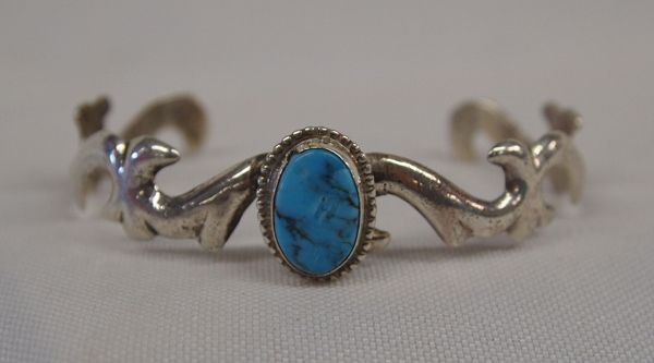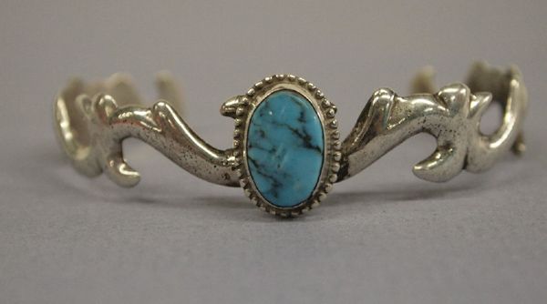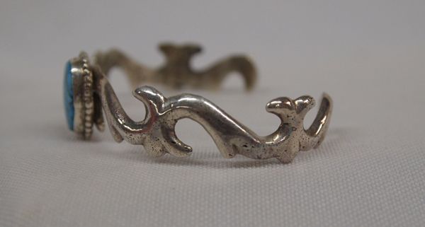 Navajo Sterling Turquoise Bracelet - Mike Thomas Jr., hallmarked MJ & Sterling, inside measurement of 6'' includes opening x 5/8''W, gorgeous oval turquoise cabochon .5'' x 3/8'', very unique and unusual sandcast band featuring swirls